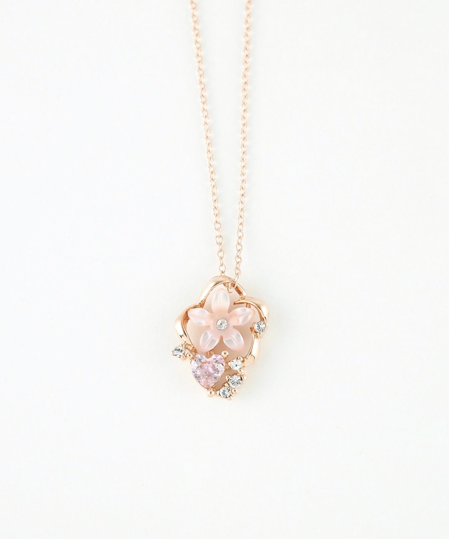 上品な光沢と温かみのある風合いが魅力の、ピンク蝶貝のフラワーモチーフネックレス。ハートモチーフやピンクゴールドとの組み合わせで、より可憐で愛らしい印象に。フェミニンな装いにはもちろん、ベーシックなコーディネートのアクセントとしてもおすすめです。