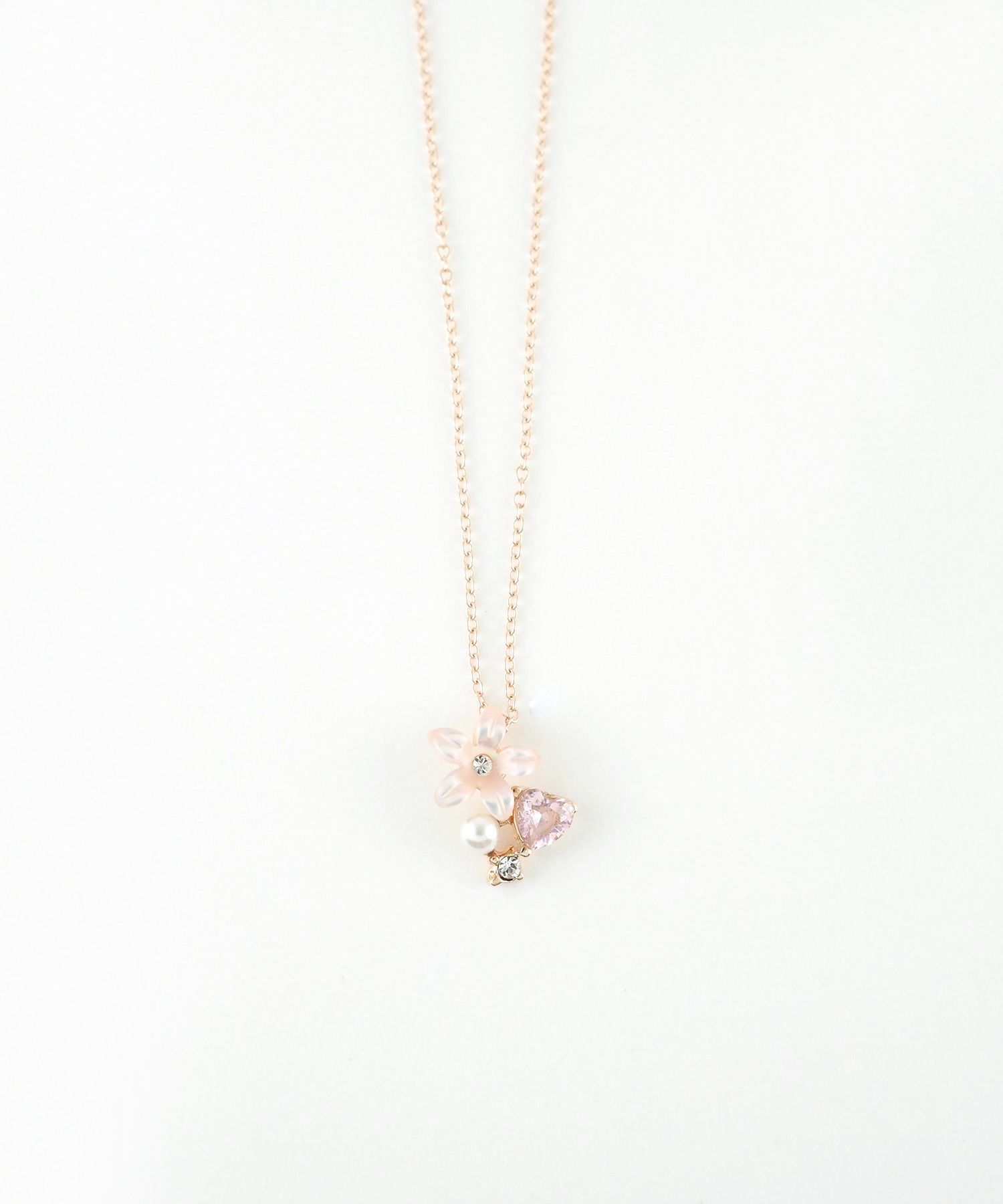 上品な光沢と温かみのある風合いが魅力の、ピンク蝶貝のフラワーモチーフネックレス。ハートモチーフやピンクゴールドとの組み合わせで、より可憐で愛らしい印象に。フェミニンな装いにはもちろん、ベーシックなコーディネートのアクセントとしてもおすすめです。
