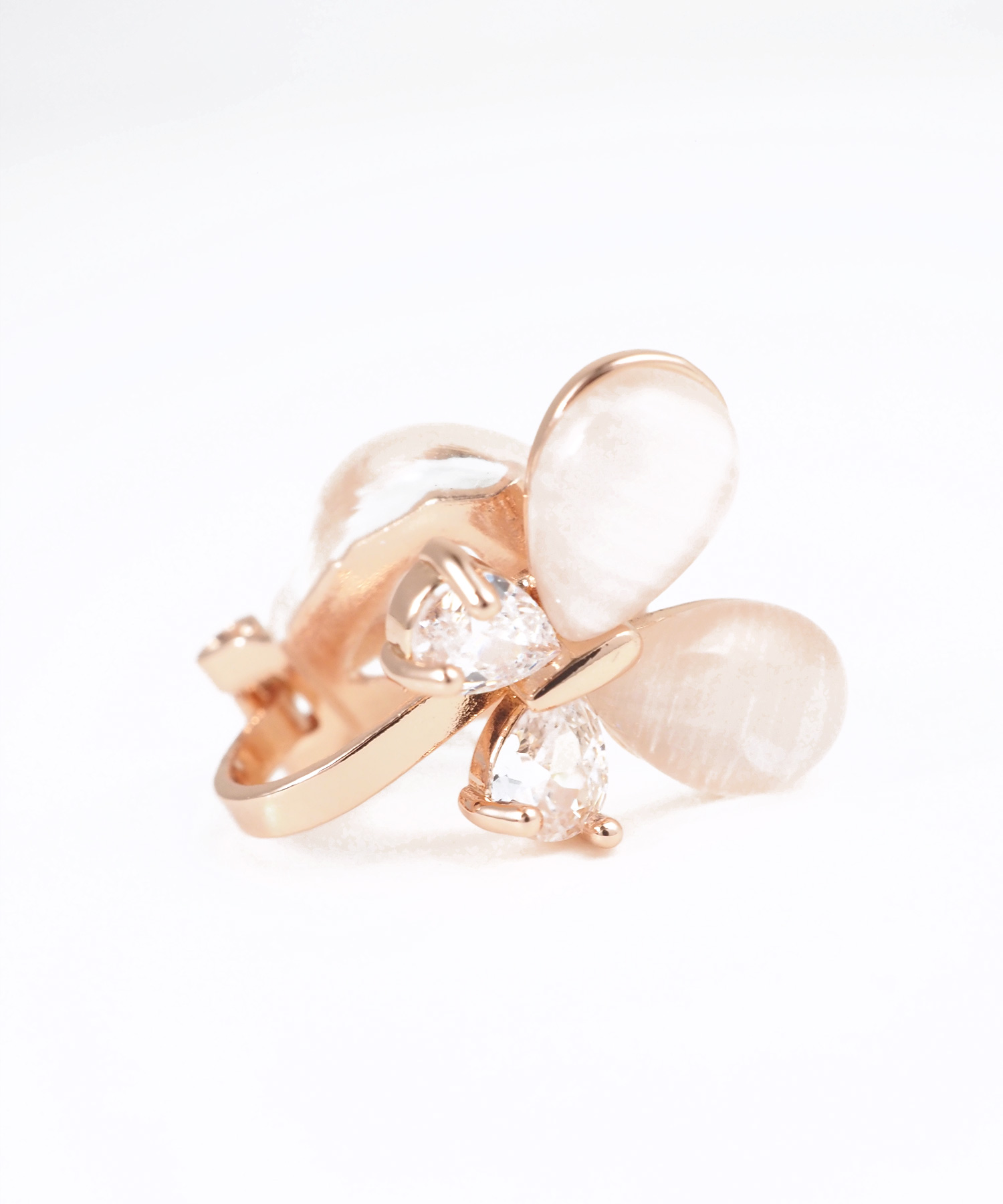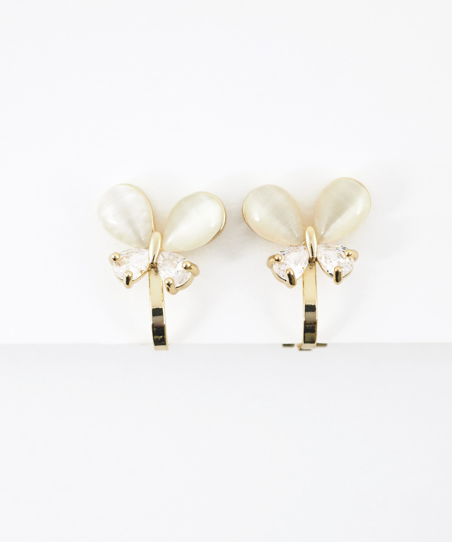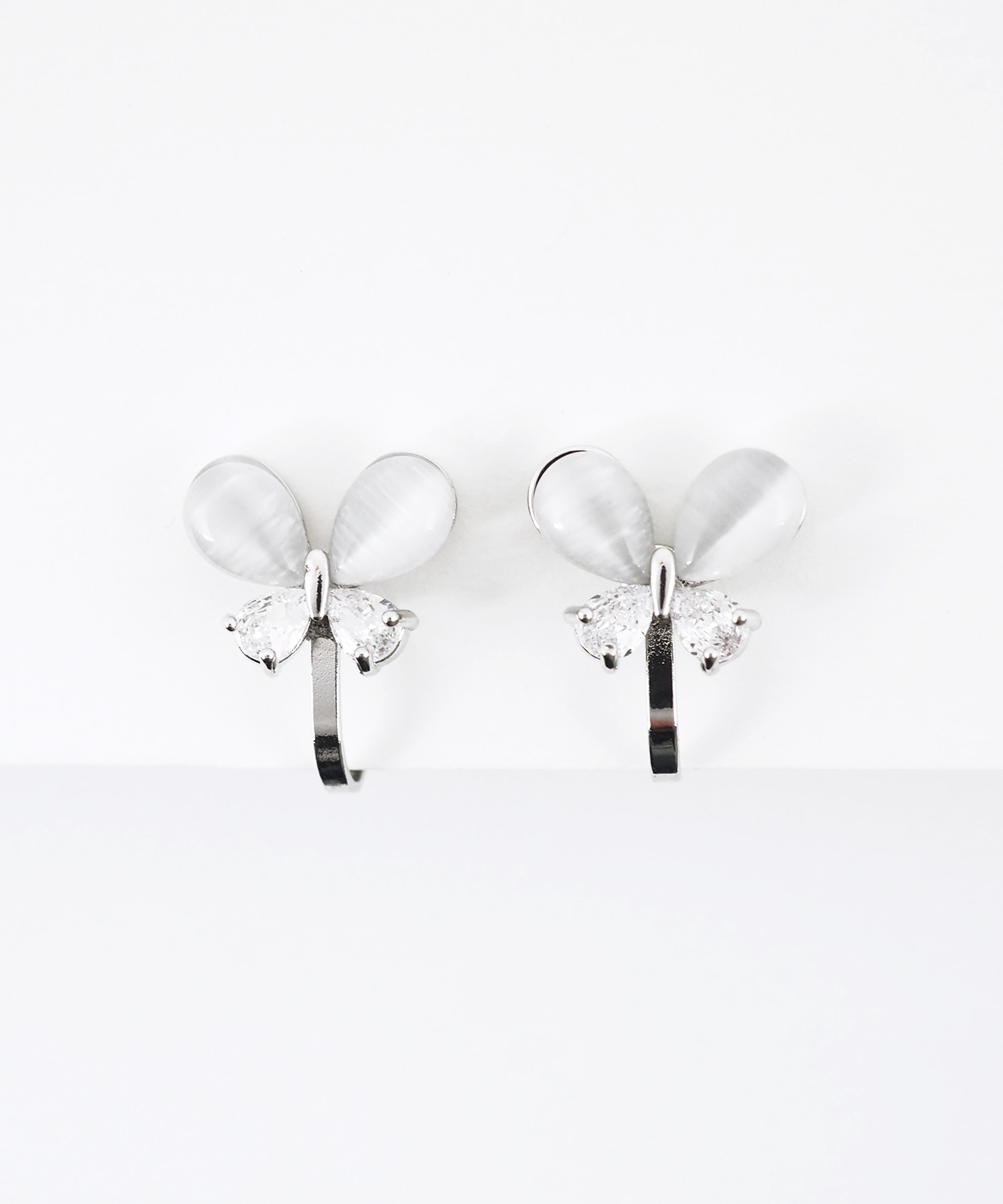ふわりと羽を休める蝶をイメージした、大人可愛いクリップイヤリング。光を優しく閉じ込めたキャッツアイ調のストーンと、煌めくキュービックジルコニアを組み合わせ、抜け感のある上品な雰囲気に。異素材を掛け合わせたアシンメトリーな輝きが、横顔に立体感と華やぎを添えてくれます。