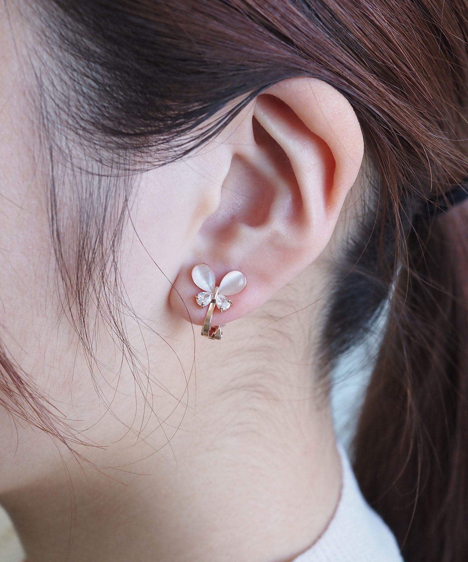 ふわりと羽を休める蝶をイメージした、大人可愛いクリップイヤリング。光を優しく閉じ込めたキャッツアイ調のストーンと、煌めくキュービックジルコニアを組み合わせ、抜け感のある上品な雰囲気に。異素材を掛け合わせたアシンメトリーな輝きが、横顔に立体感と華やぎを添えてくれます。