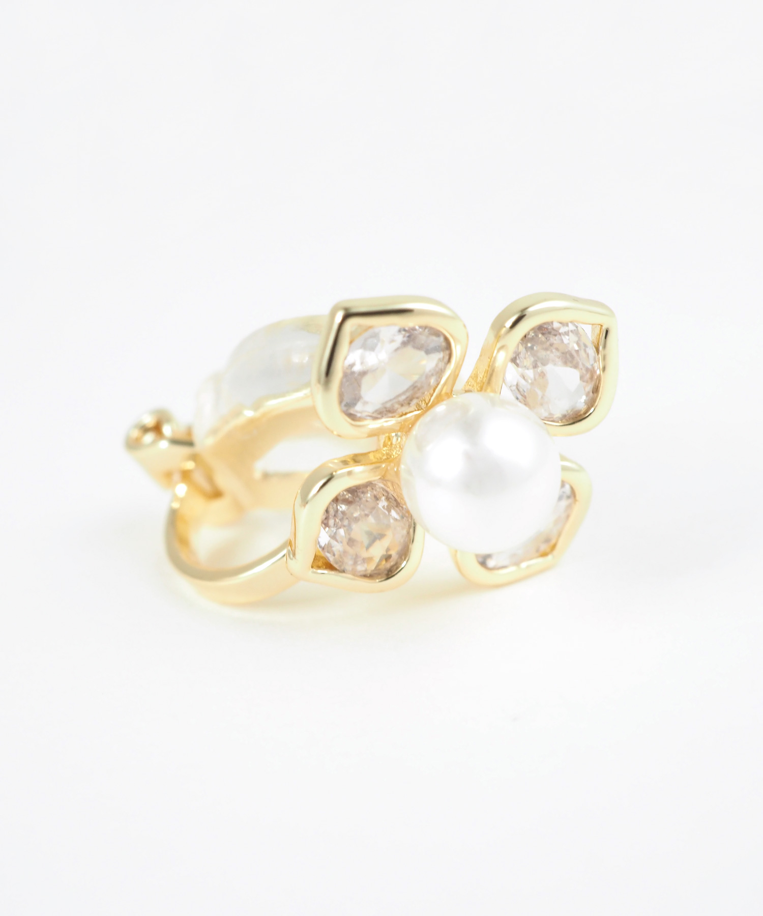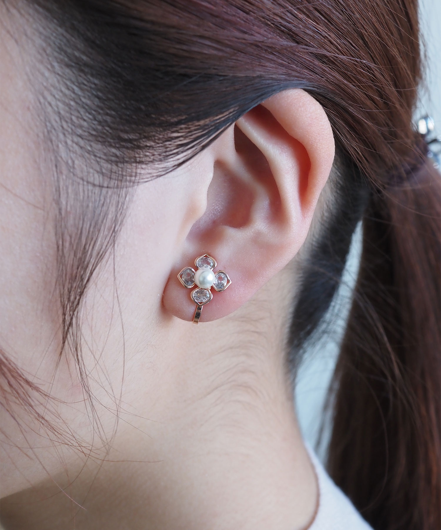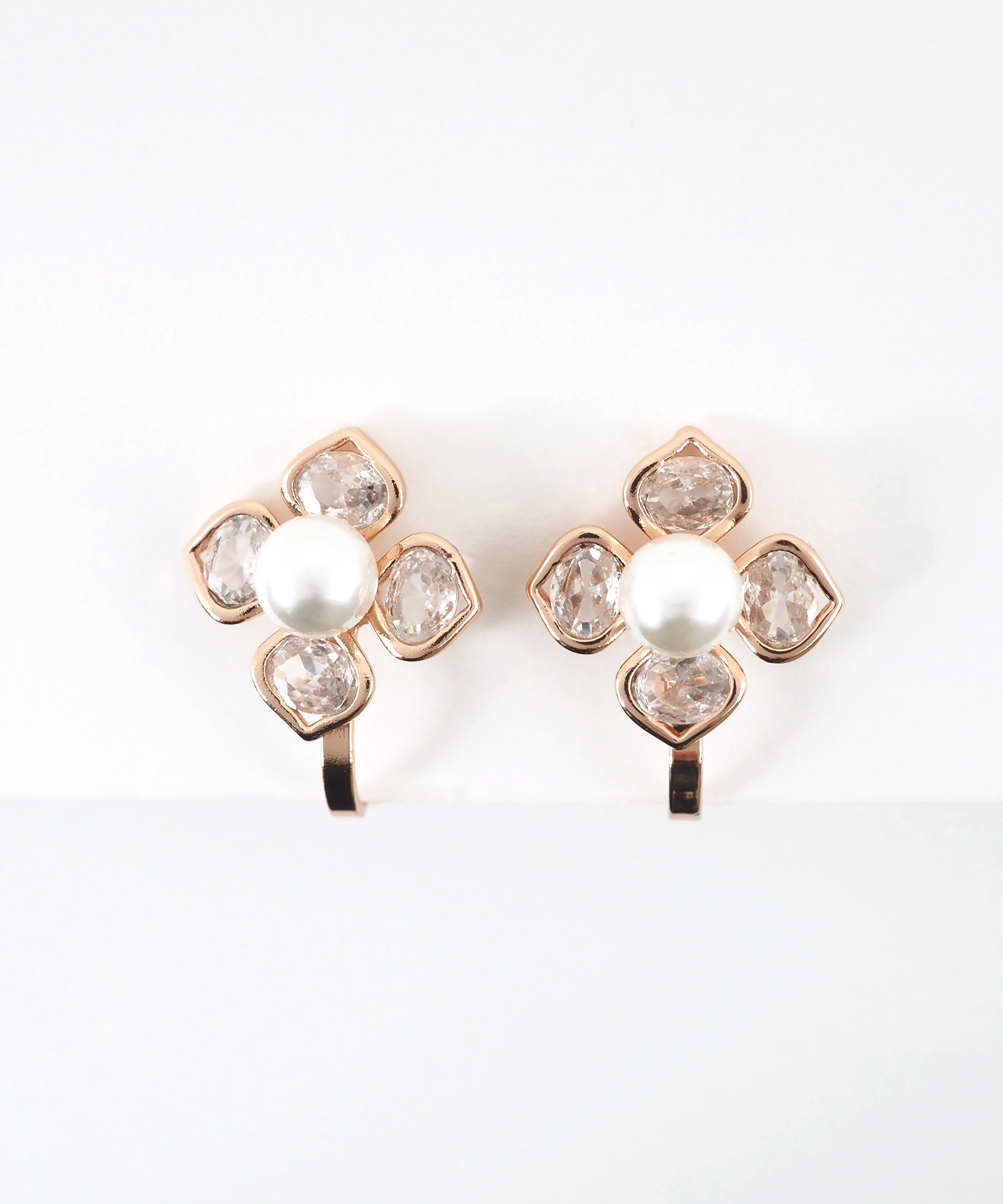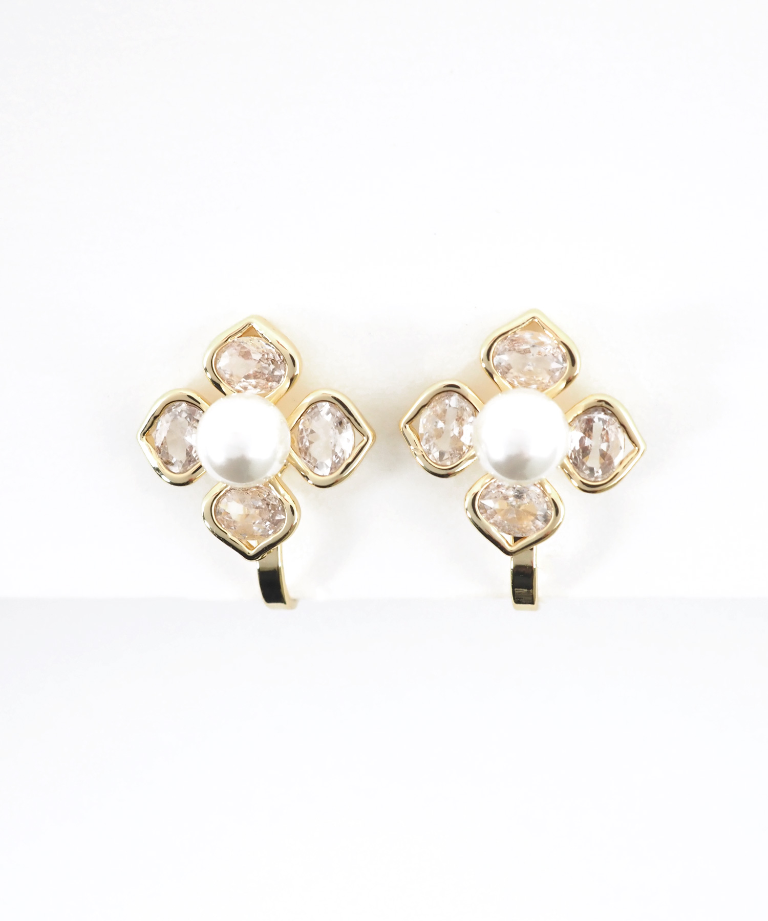 耳元に上品な華やぎを添えてくれる、フラワーモチーフのクリップイヤリング。4枚の花びらに煌めくビジューを敷き詰め、中央に艶やかなパールをあしらった気品あふれるデザインです。普段使いはもちろん、パーティーなどの華やかなシーンまで幅広く活躍してくれます。