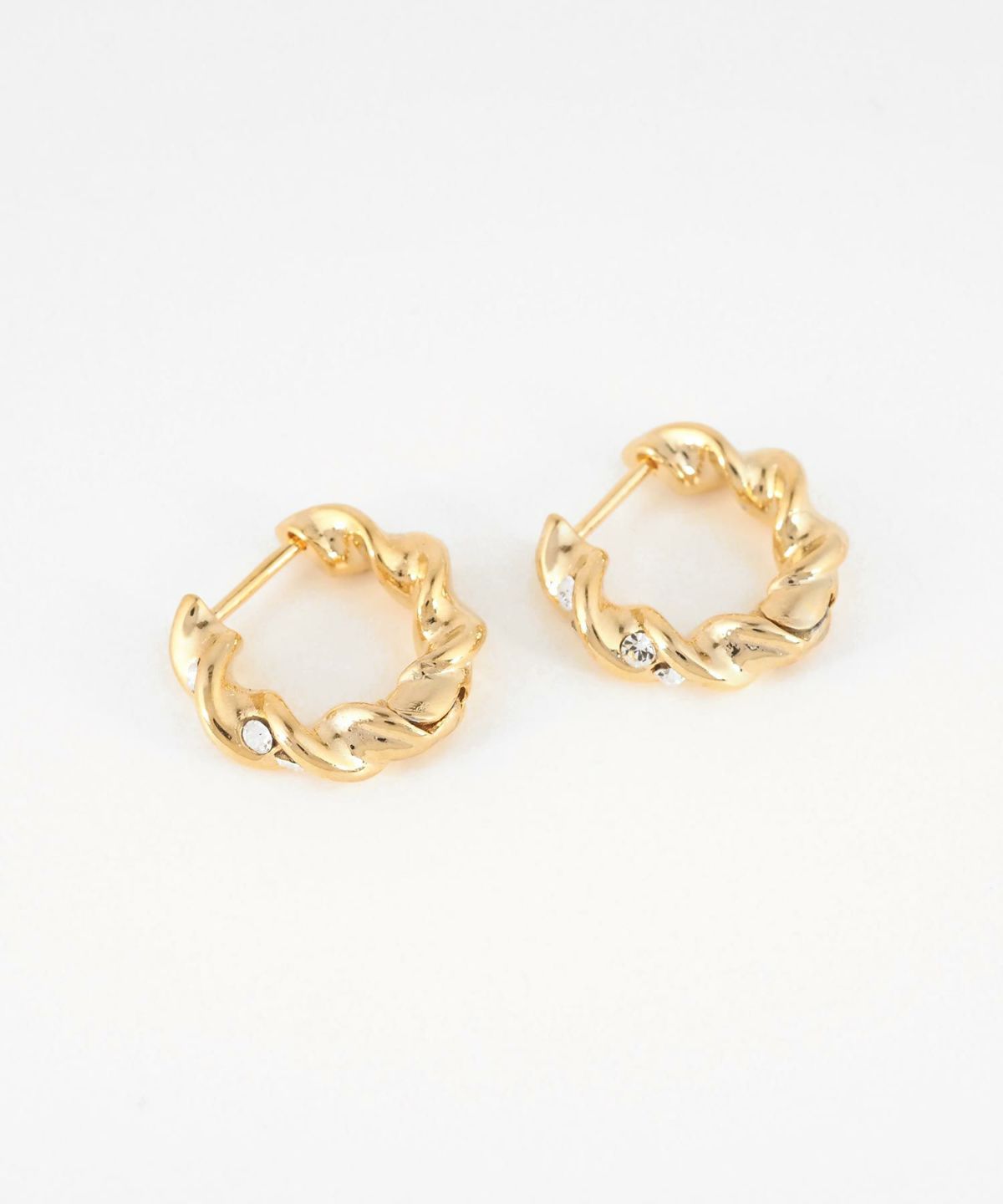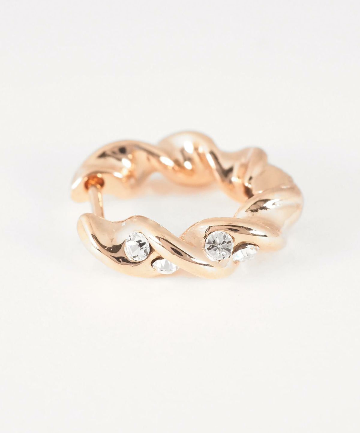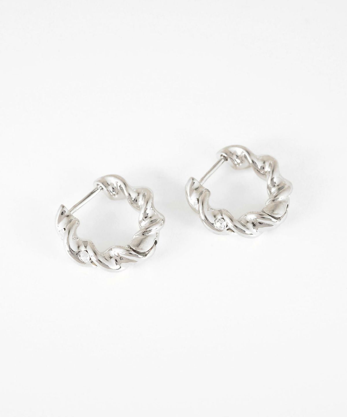 立体的なツイストラインに、きらめくストーンが繊細に添えられたフープピアス。ねじりの陰影とストーンの輝きが、耳元に華やかさと奥行きをもたらします。一つつけるだけで顔周りを明るく見せる、エレガントなデザイン。シンプルながらも存在感があり、パーティーシーンからデイリーまで活躍するアイテムです。バネが戻る力を利用したスプリングフープピアスは、耳に通したら力を加えなくても留まります♪キャッチ不要で外れにくく、着脱も簡単◎大切なピアスをなくす心配も軽減します。ペアピアス(両耳用)です。