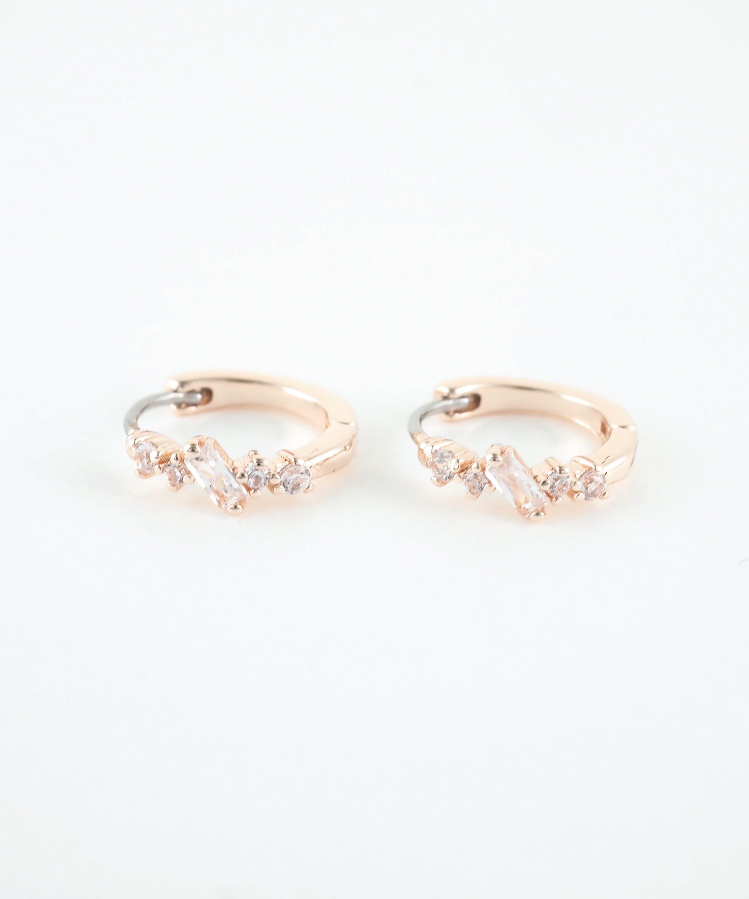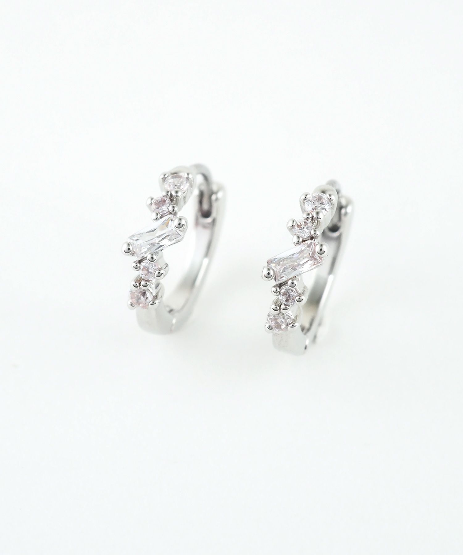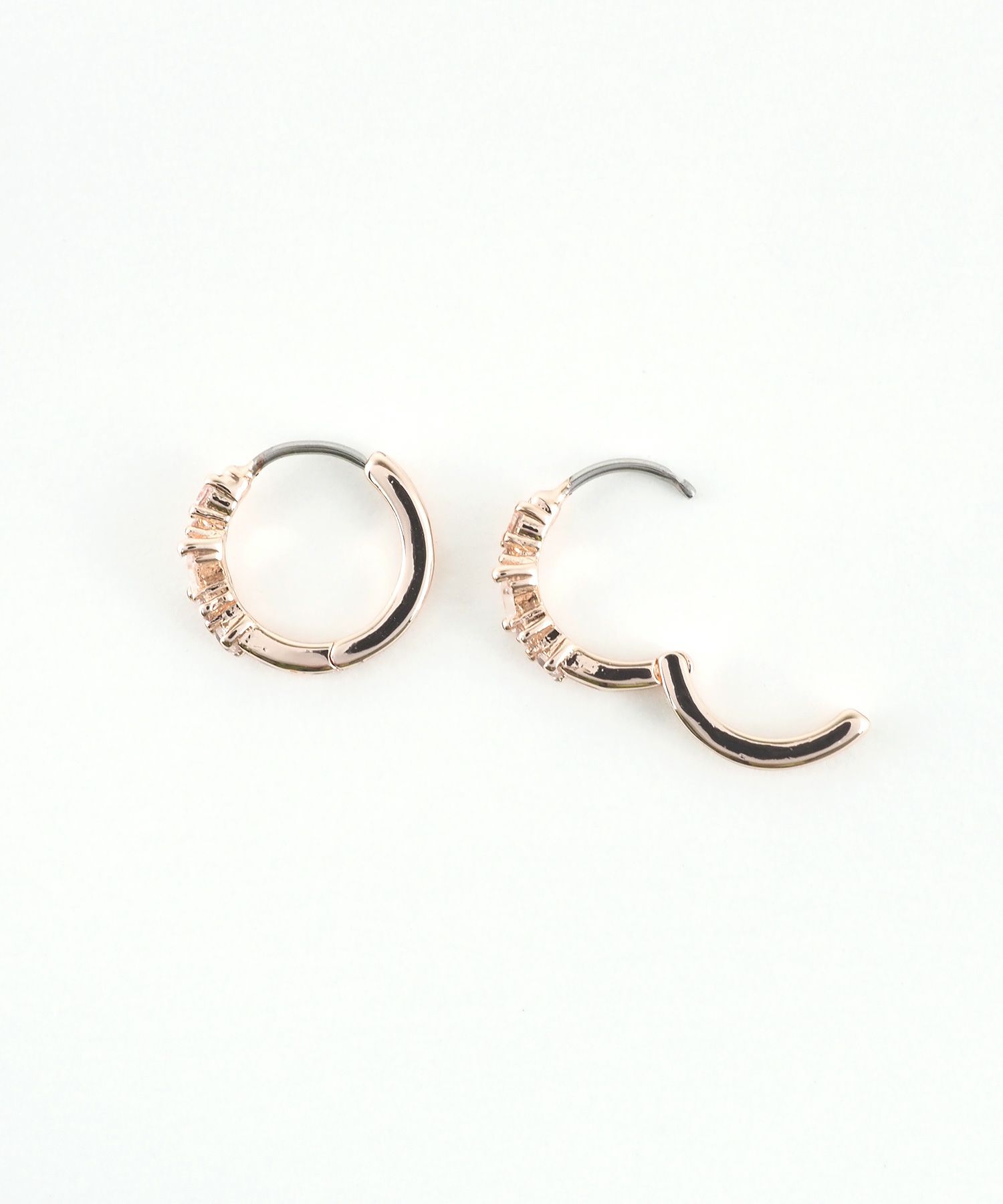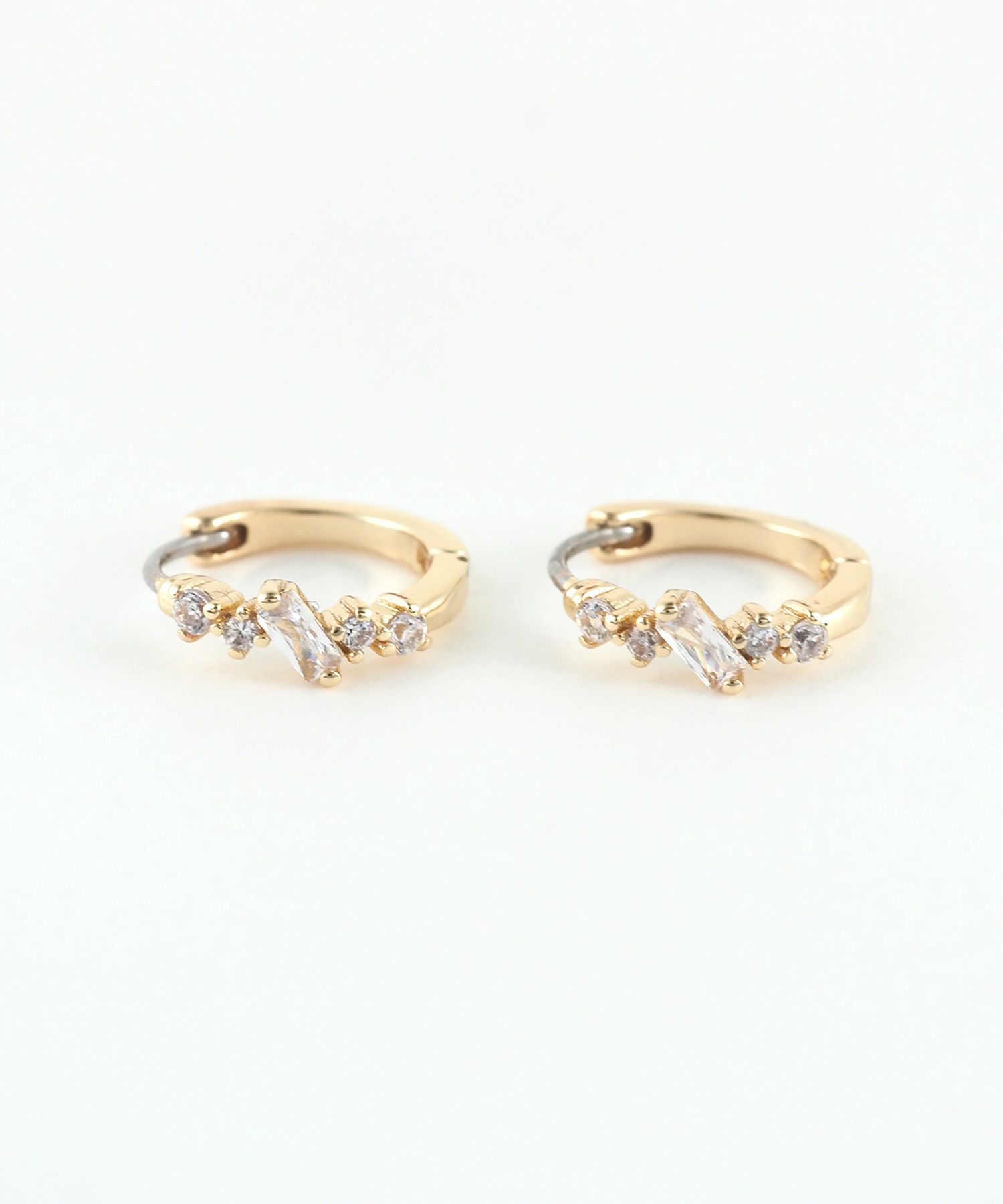 輝くビジューのラインが耳元を彩る、ミニフープステンレスポストピアス。オフィス、カジュアルなど、シーンを選ばず活躍します。お肌に優しいステンレスポストを使用しており金属アレルギーの方でも比較的安心してお使いいただけます。 ワンタッチでカチッと留まるので、キャッチを失くす心配もなく、着脱がスムーズなのも魅力。ペアピアス(両耳用)です。