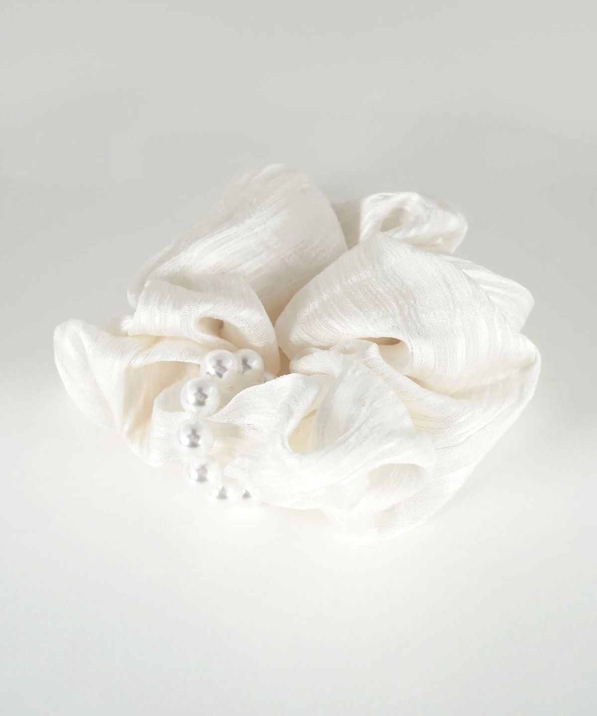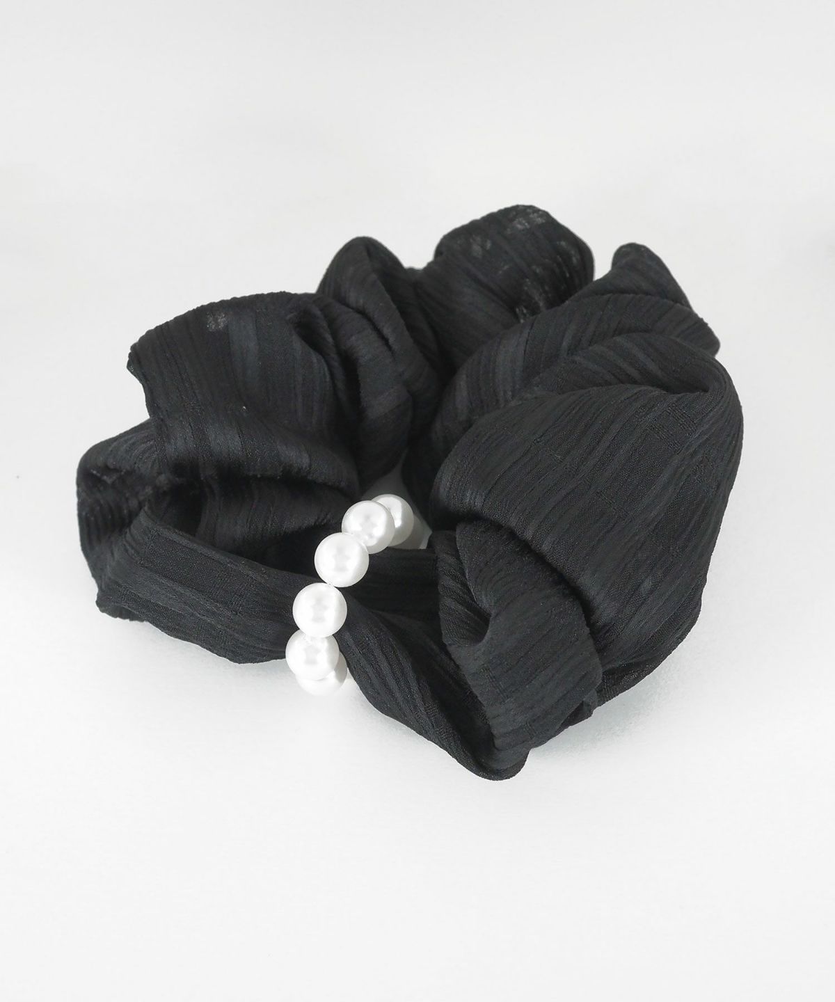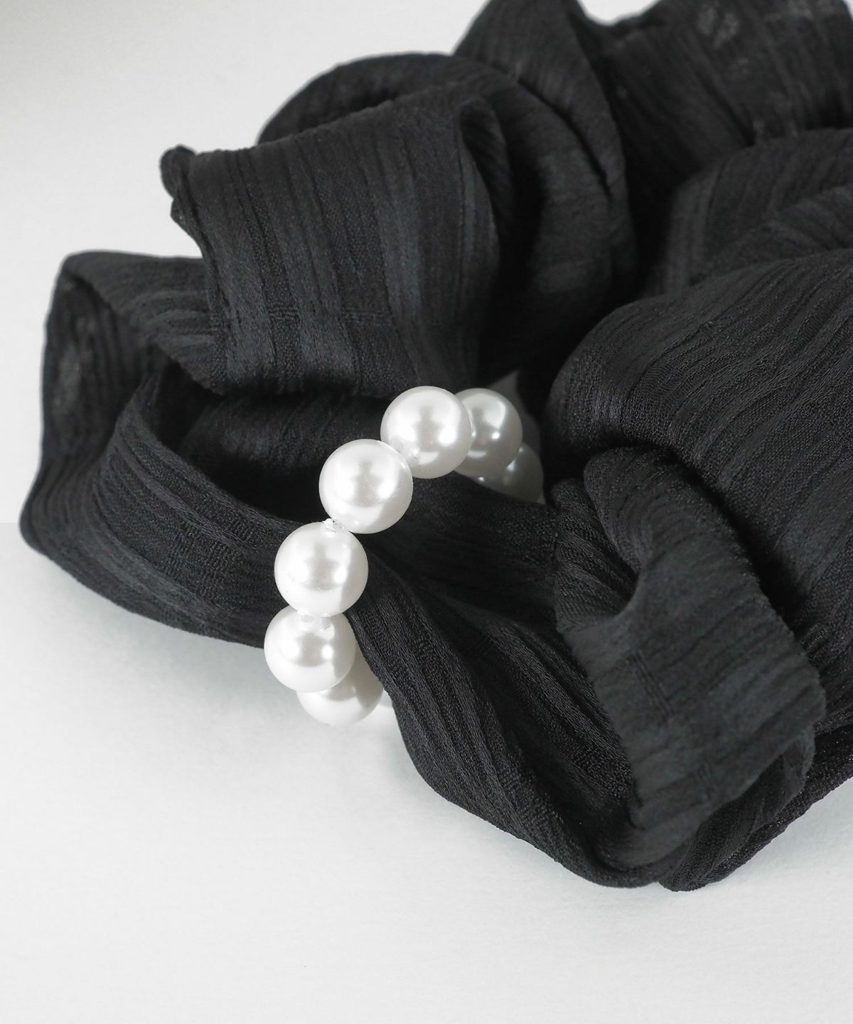 連なるパールラインがエレガントなシュシュ。サッと結ぶだけで、ヘアスタイルを上品かつ華やかに演出します。フェミニンなスタイルはもちろん、シンプルな装いのアクセントにも最適です。