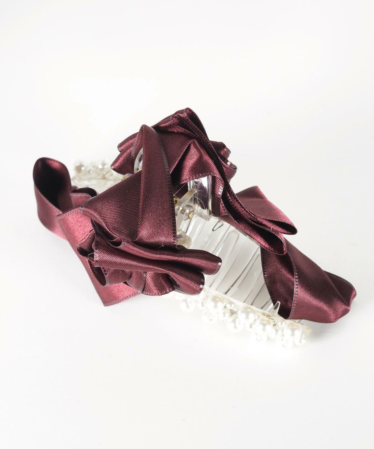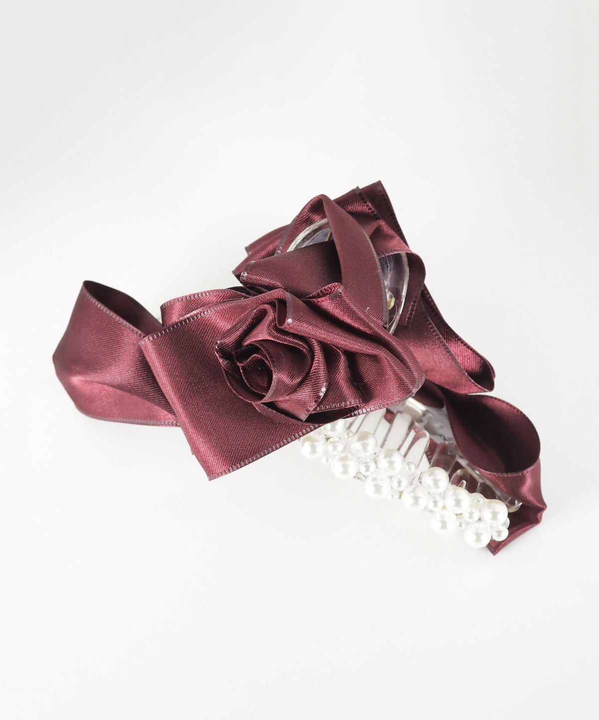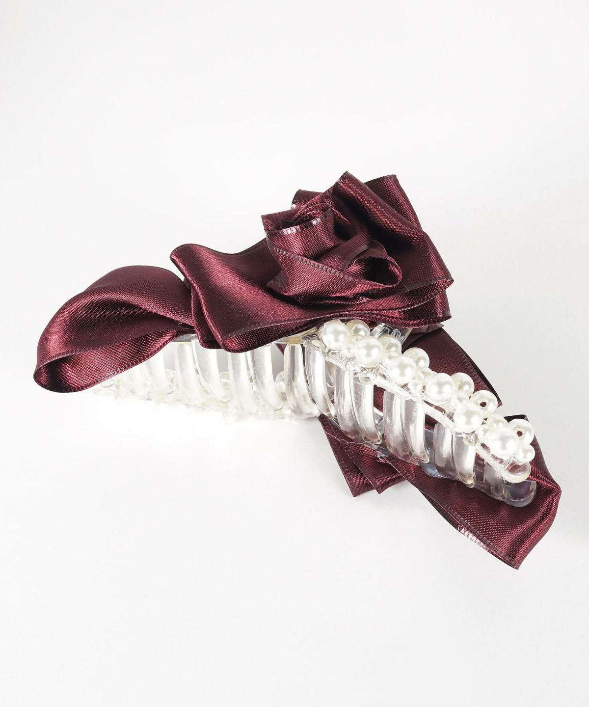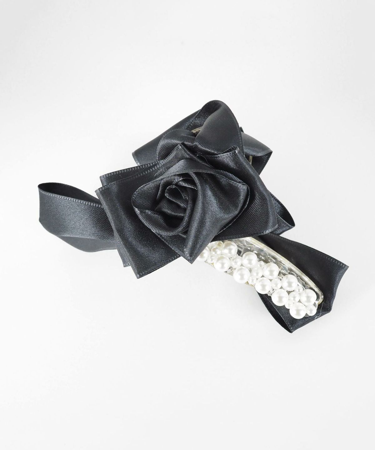 光沢のあるサテンリボンに、立体のローズモチーフと上品なパールをあしらったバンスクリップ。挟むだけで手抜き感ゼロのエレガントなまとめ髪が完成。大人の横顔を美しく飾ります。普段使いはもちろん、パーティーなどの特別なシーンにも活躍する、大人の女性にふさわしい主役級のアイテムです。