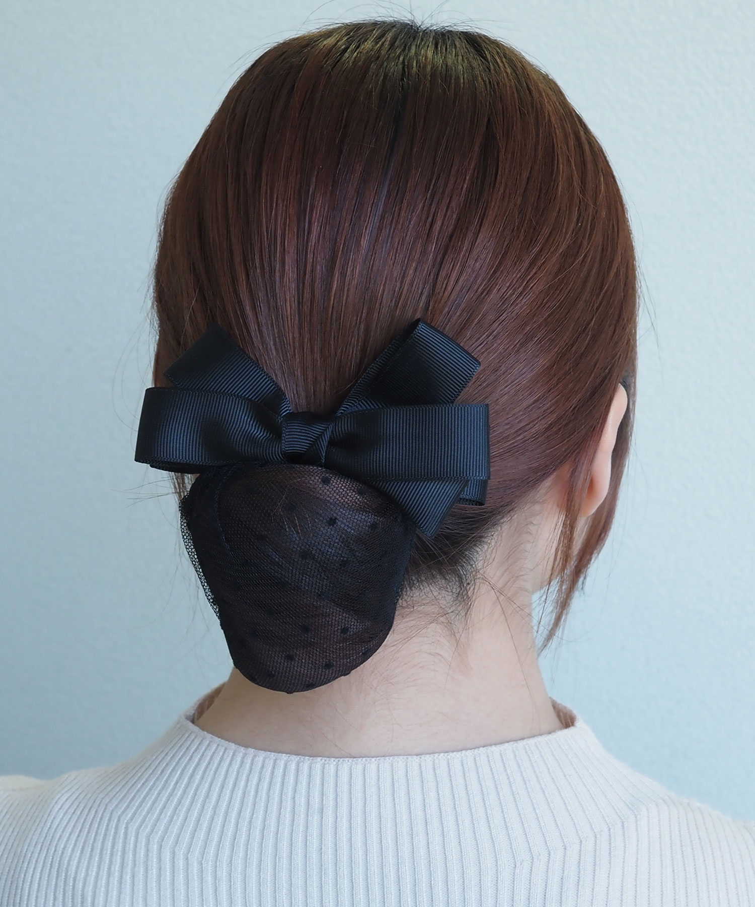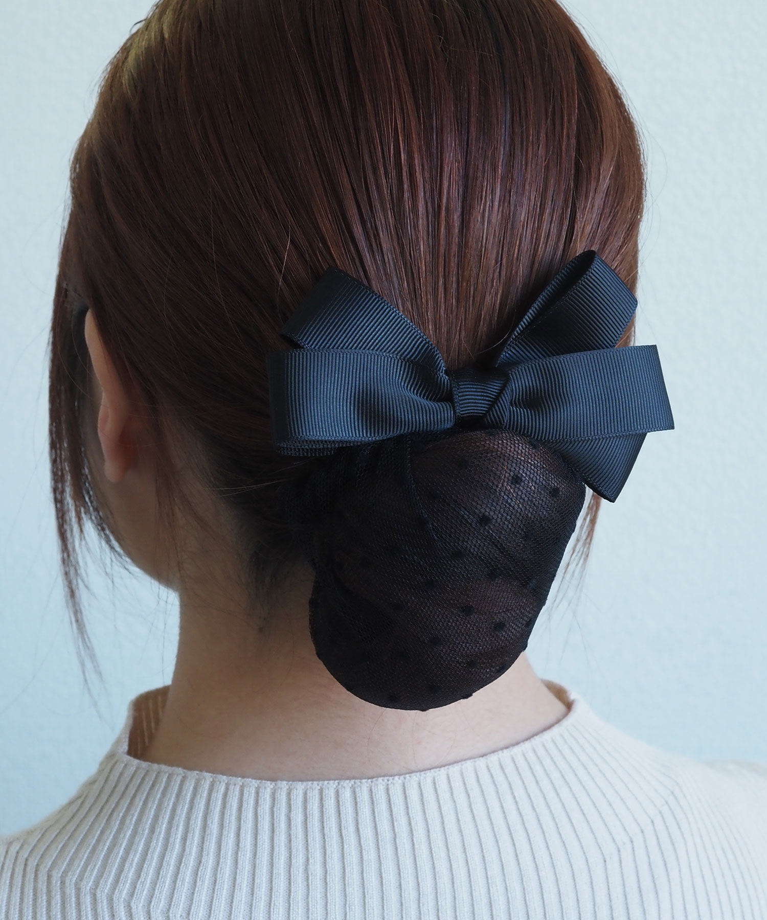 毛先を簡単にすっきりまとめるネット付のリボンバレッタ。ネット部分は控えめなドット柄になっており、シンプルな中に大人可愛いアクセントを添えています。パラパラと出てしまう短い毛もちゃんとまとまり、オフィスなどのビジネスシーンやフォーマルシーンの身だしなみに最適です。リボンのデザインにもこだわって、おしゃれも忘れず好印象を作ります。