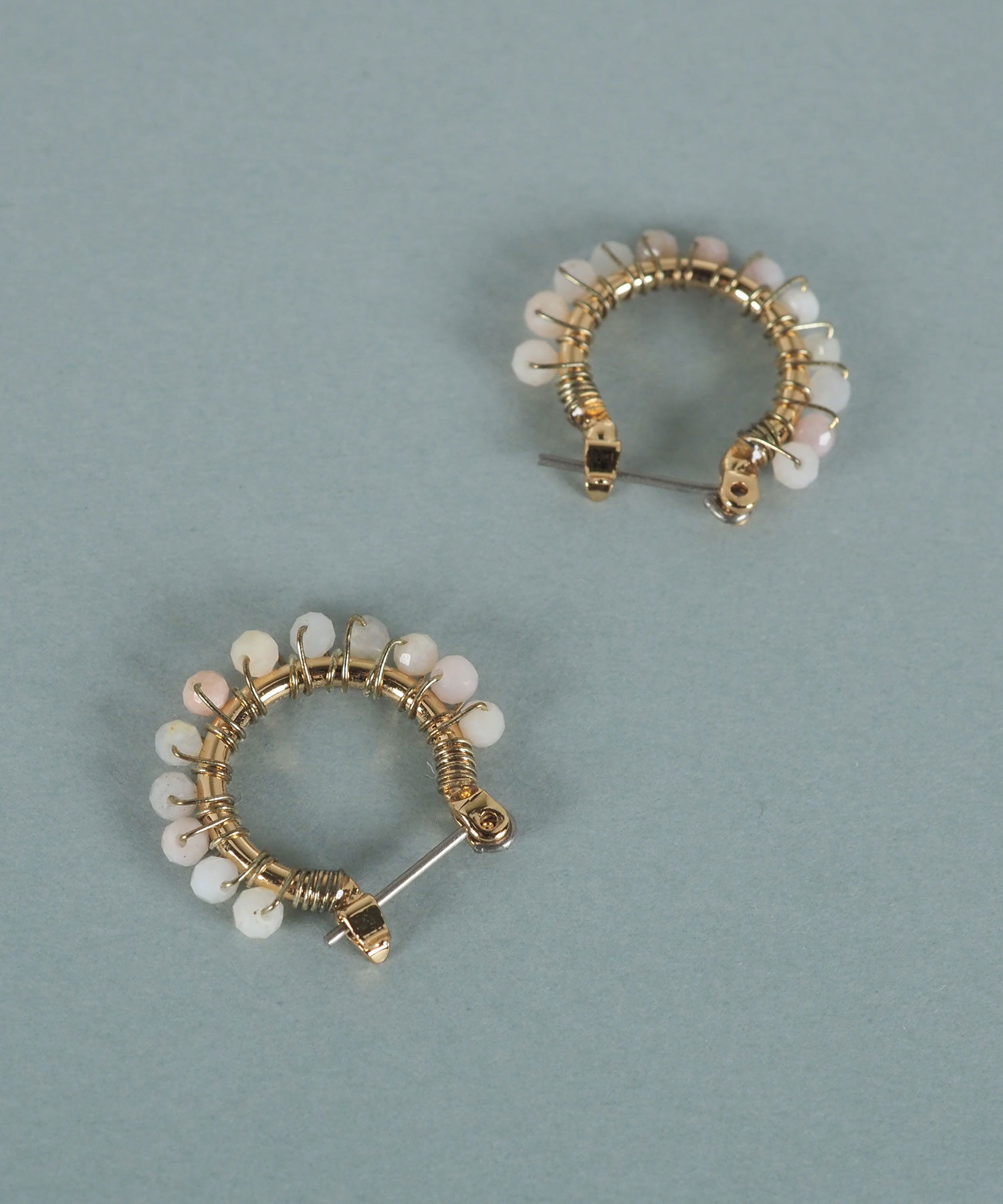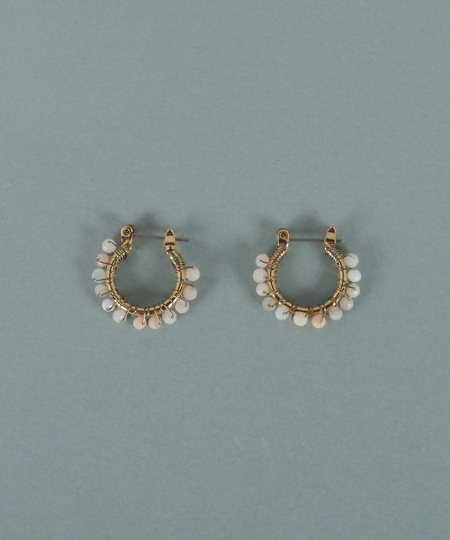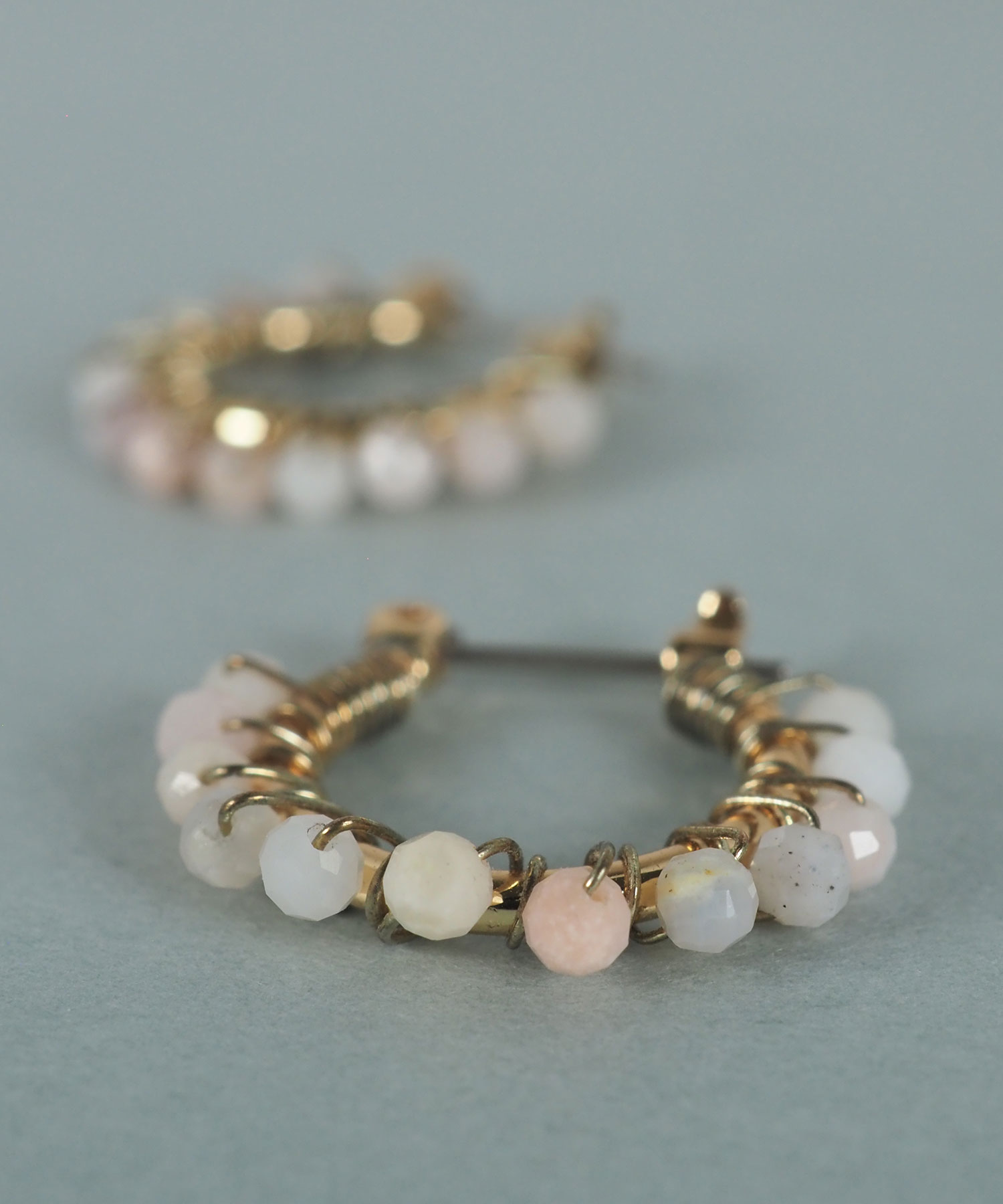 小さな天然石のビーズ(フェルスパー、アゲート)を丁寧にワイヤーでフープに巻き付けた、繊細なビーズワークが魅力のフープ デザインです。ビーズが何重にも連なることで、ふっくらとしたボリューム感が生まれ、耳元に華を添えます。