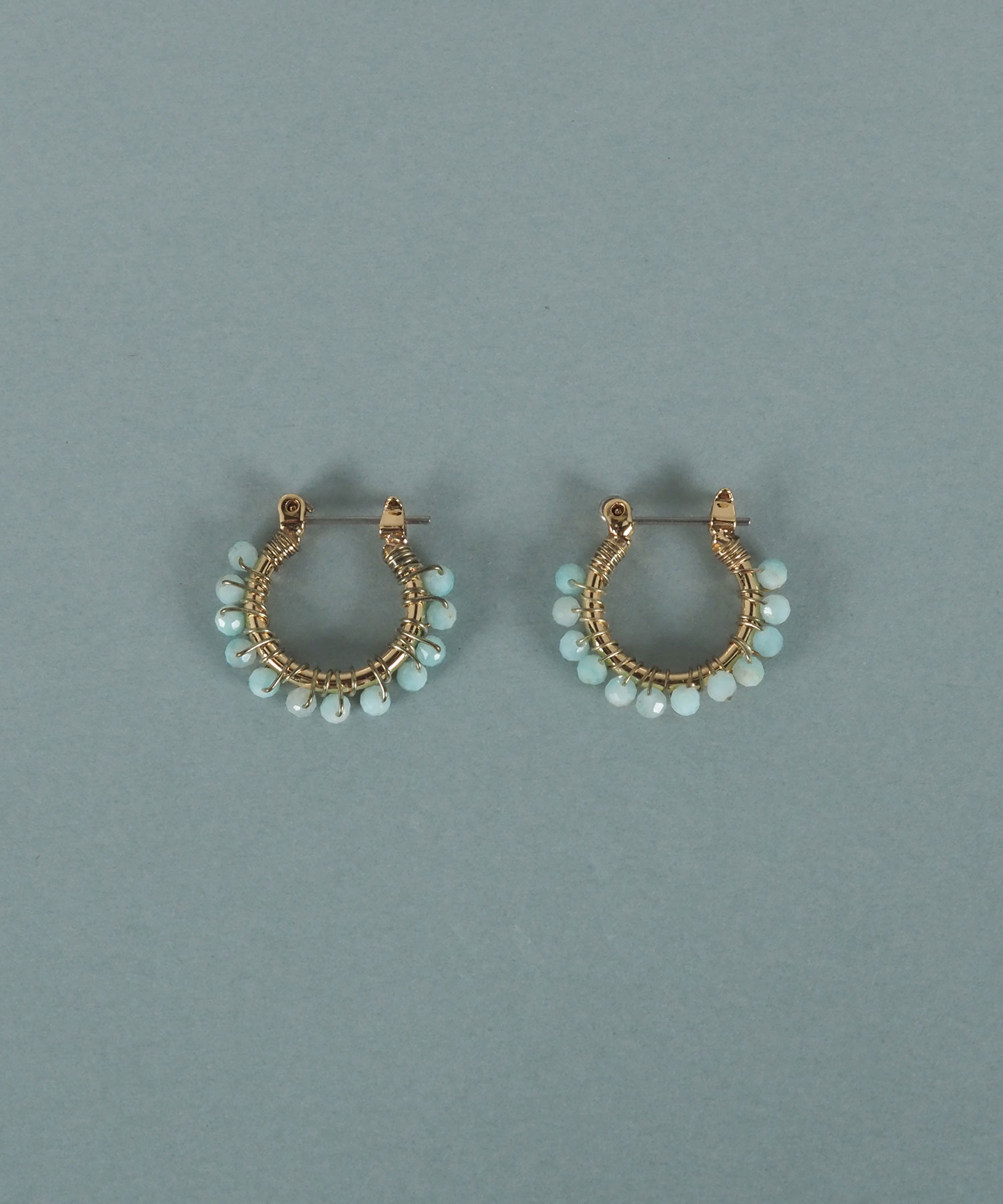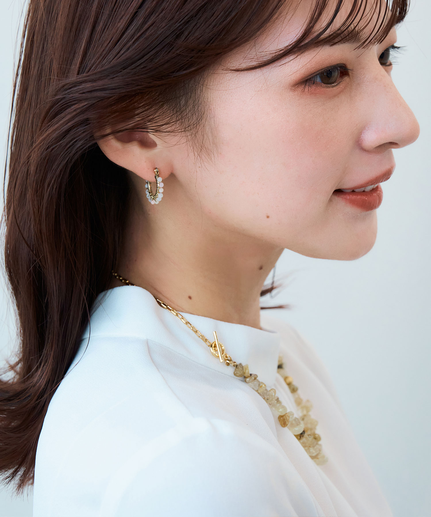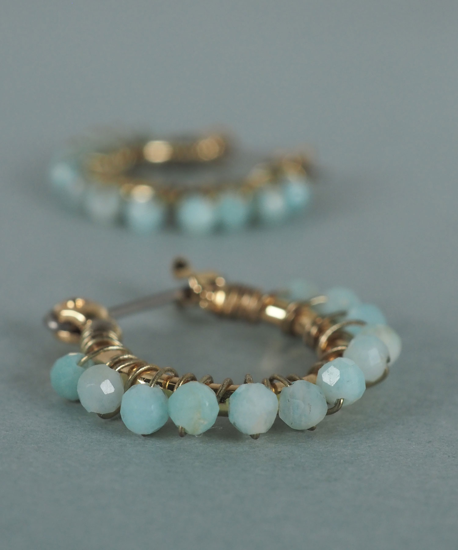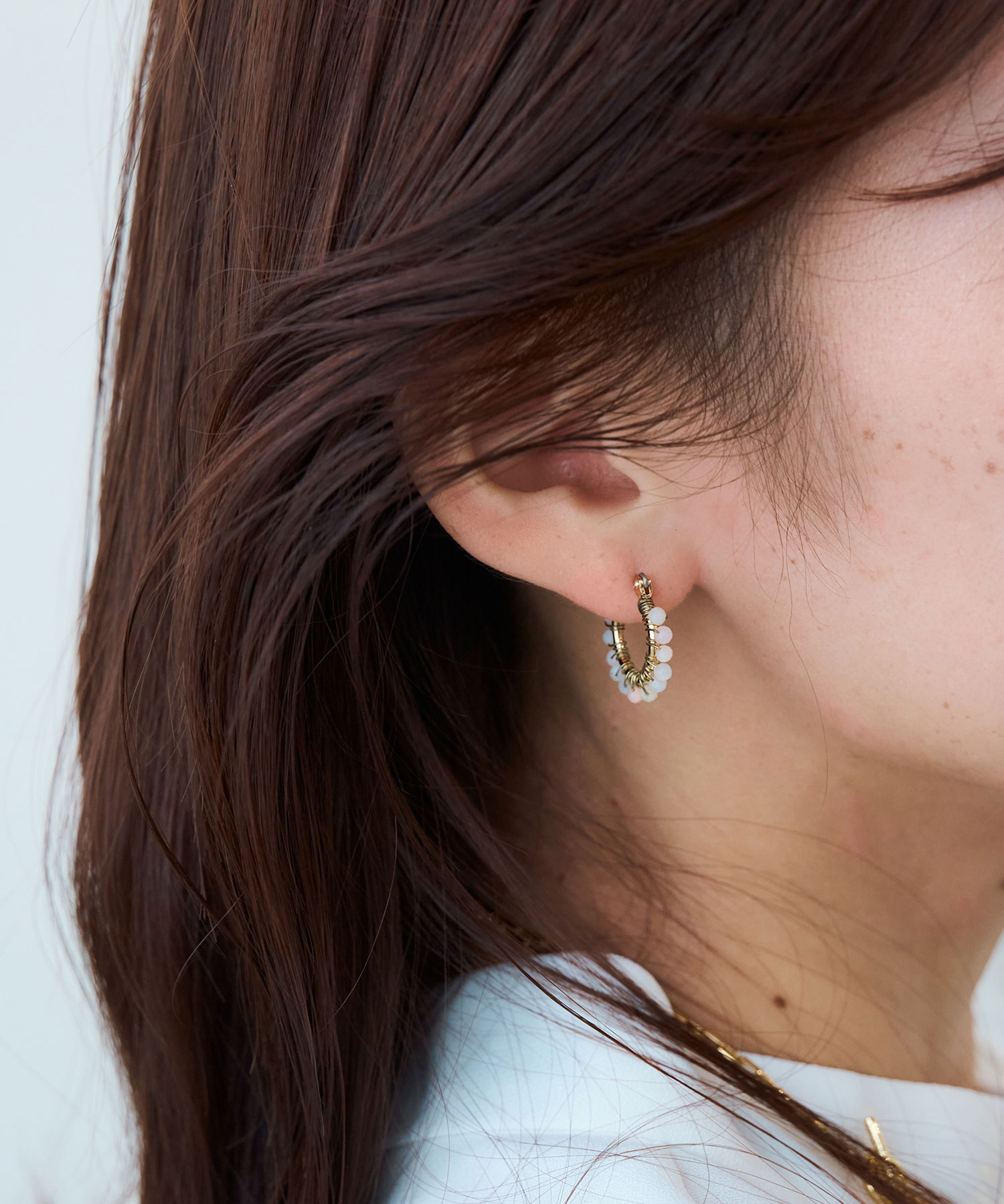 小さな天然石のビーズ(フェルスパー、アゲート)を丁寧にワイヤーでフープに巻き付けた、繊細なビーズワークが魅力のフープ デザインです。ビーズが何重にも連なることで、ふっくらとしたボリューム感が生まれ、耳元に華を添えます。