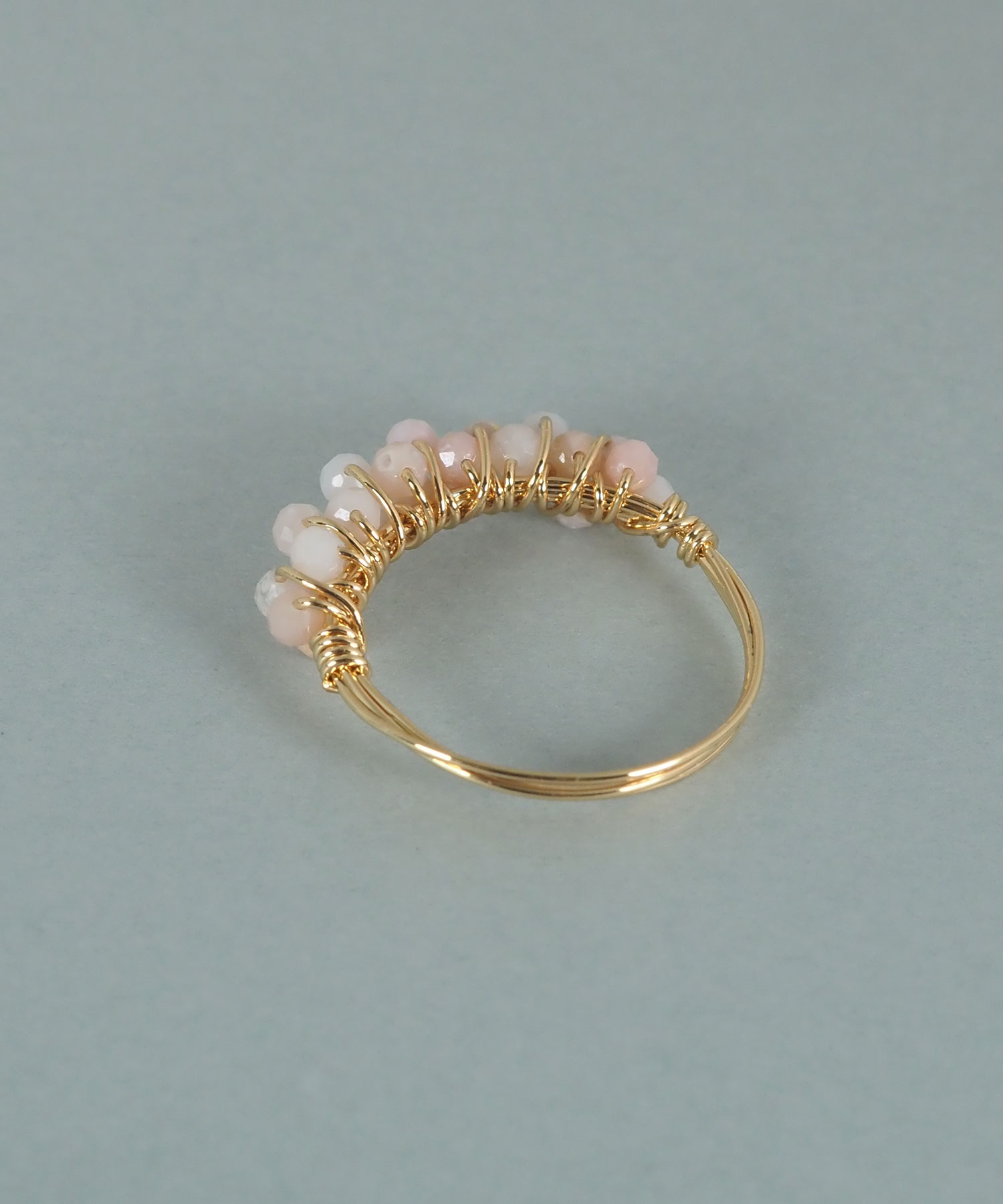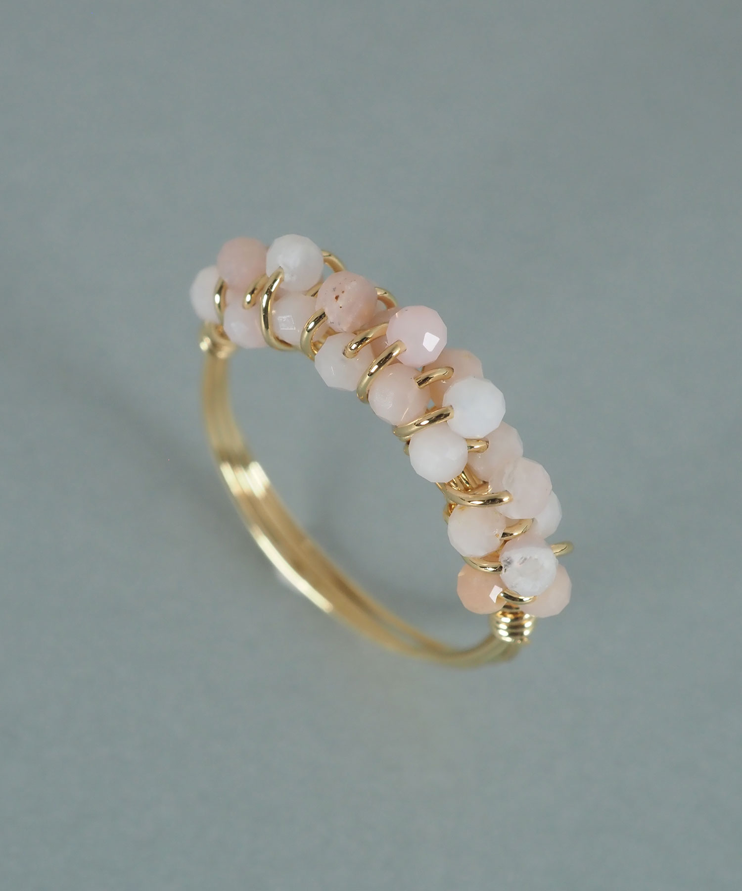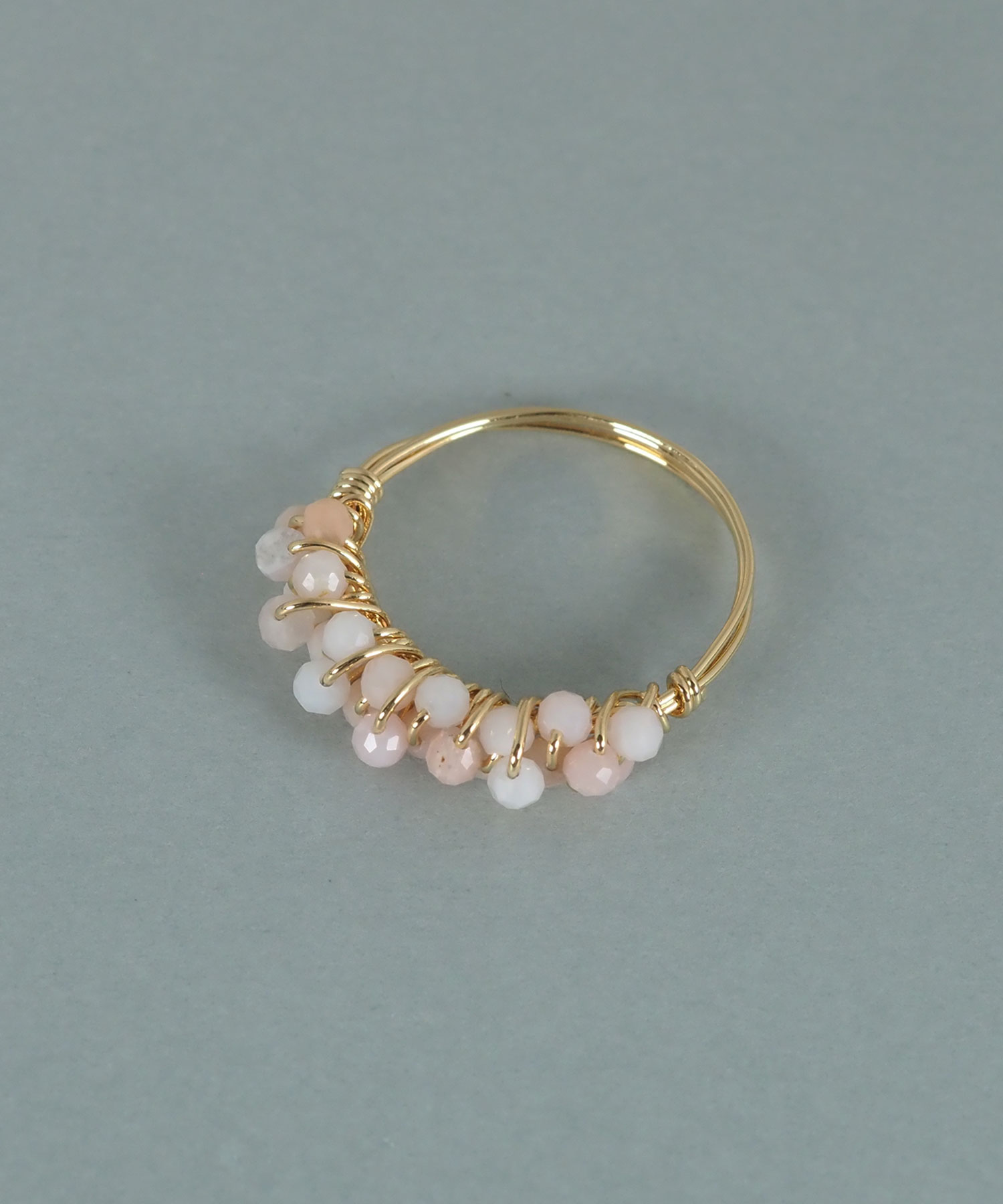 極小の天然石ビーズを、細いワイヤーでリング部分に丁寧に編み込んだデザインです。ビーズの豊かな色彩と、ワイヤーの繊細な輝きが相まって、指先に可憐な存在感を放ちます。