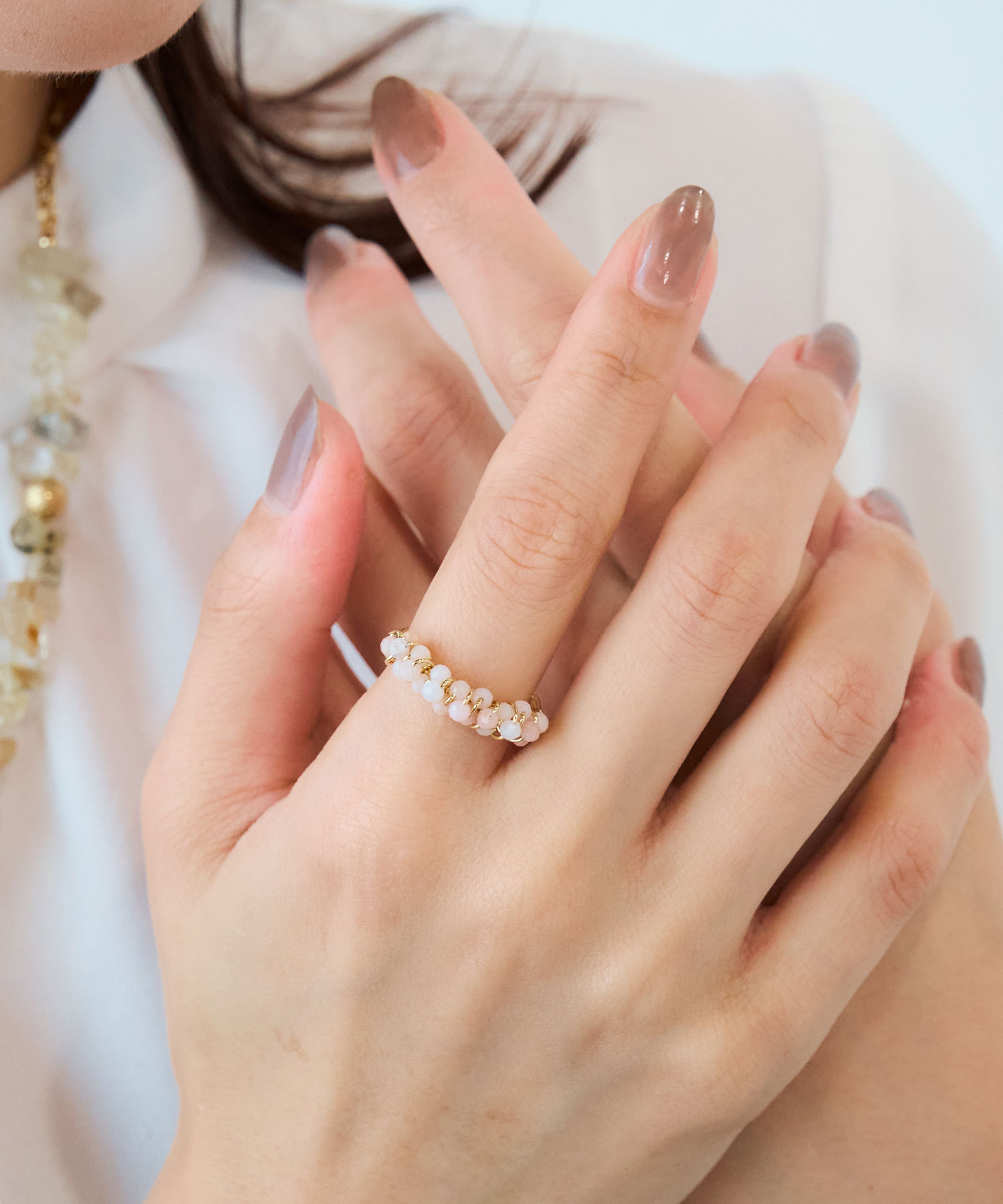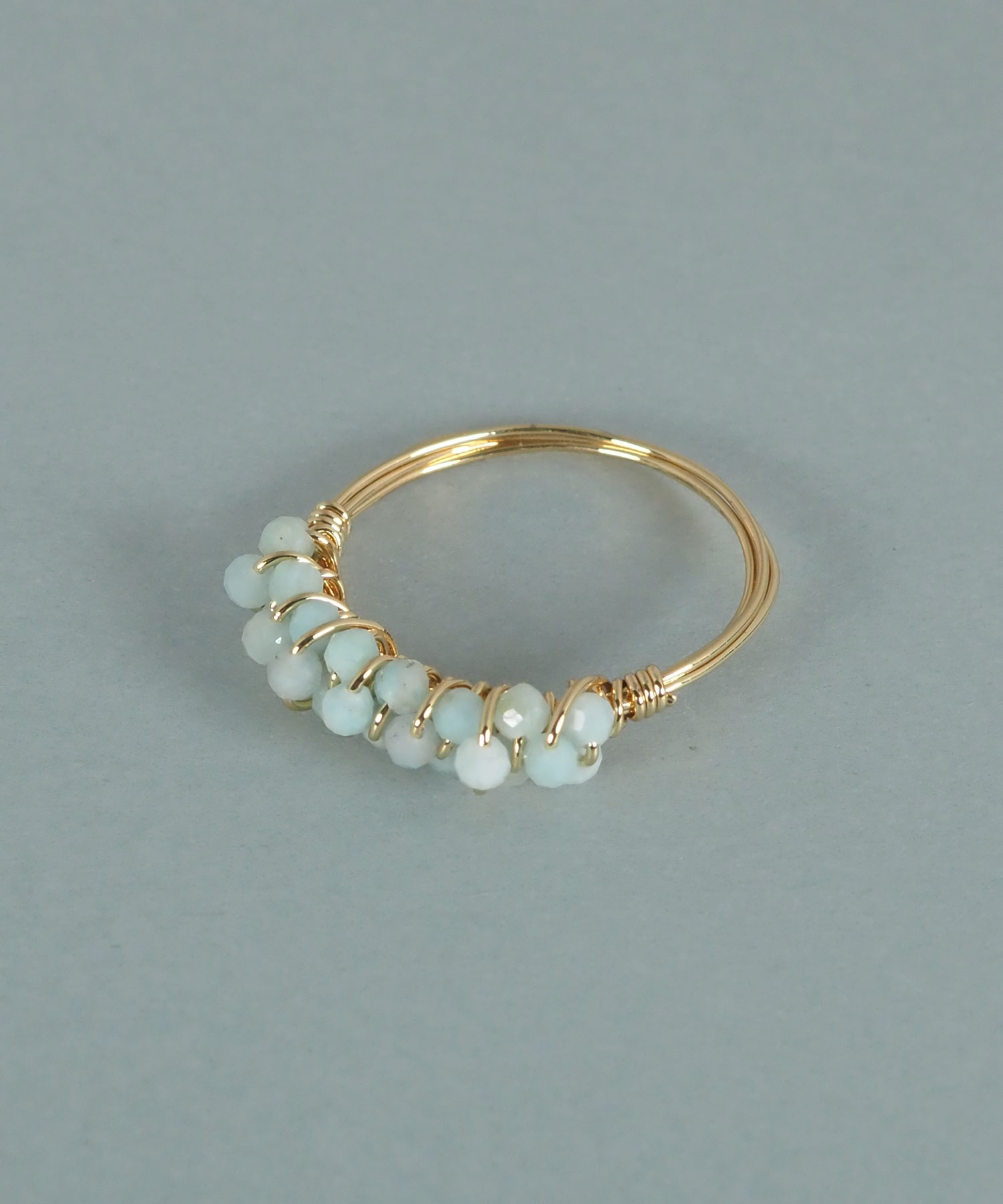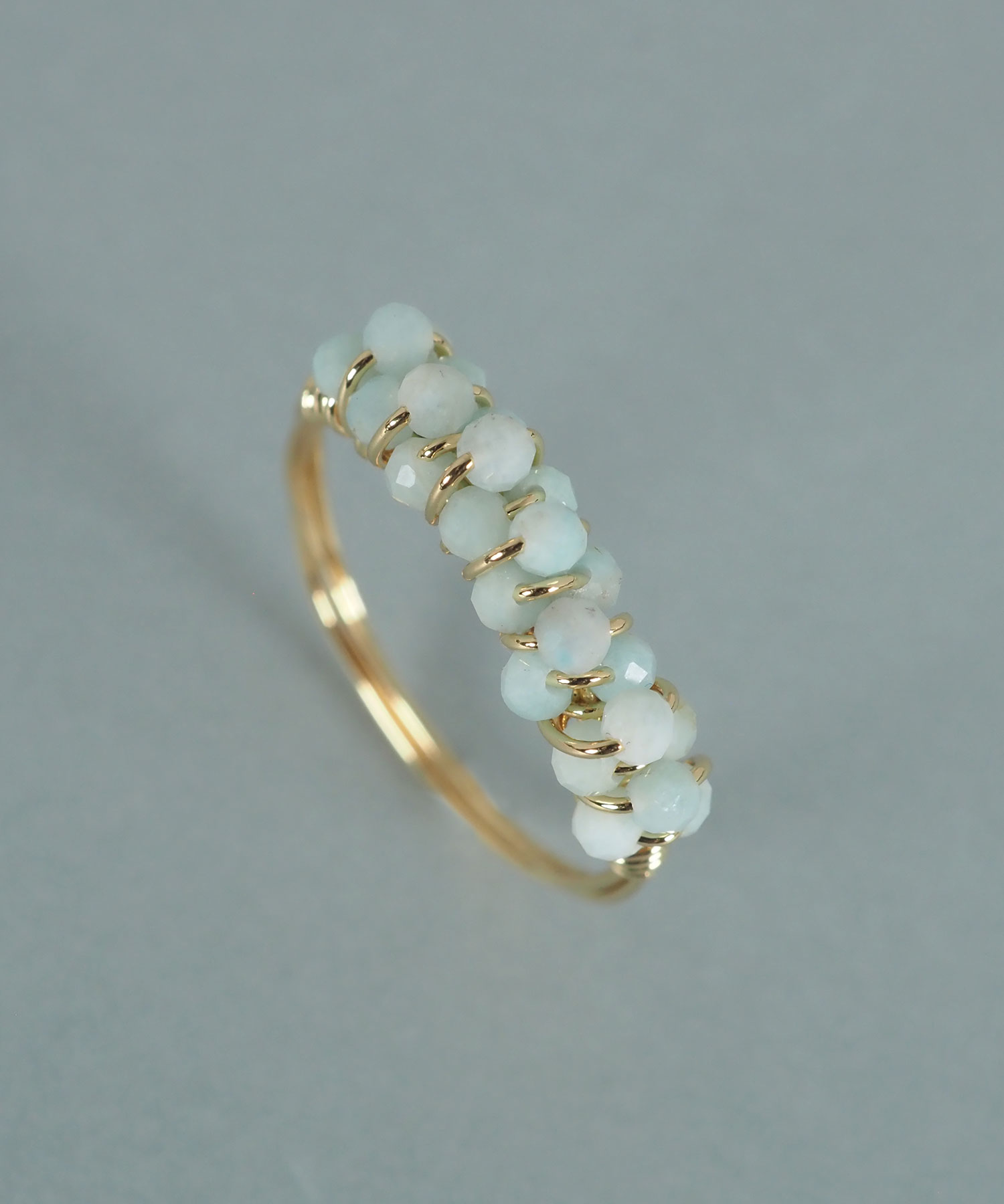 極小の天然石ビーズを、細いワイヤーでリング部分に丁寧に編み込んだデザインです。ビーズの豊かな色彩と、ワイヤーの繊細な輝きが相まって、指先に可憐な存在感を放ちます。