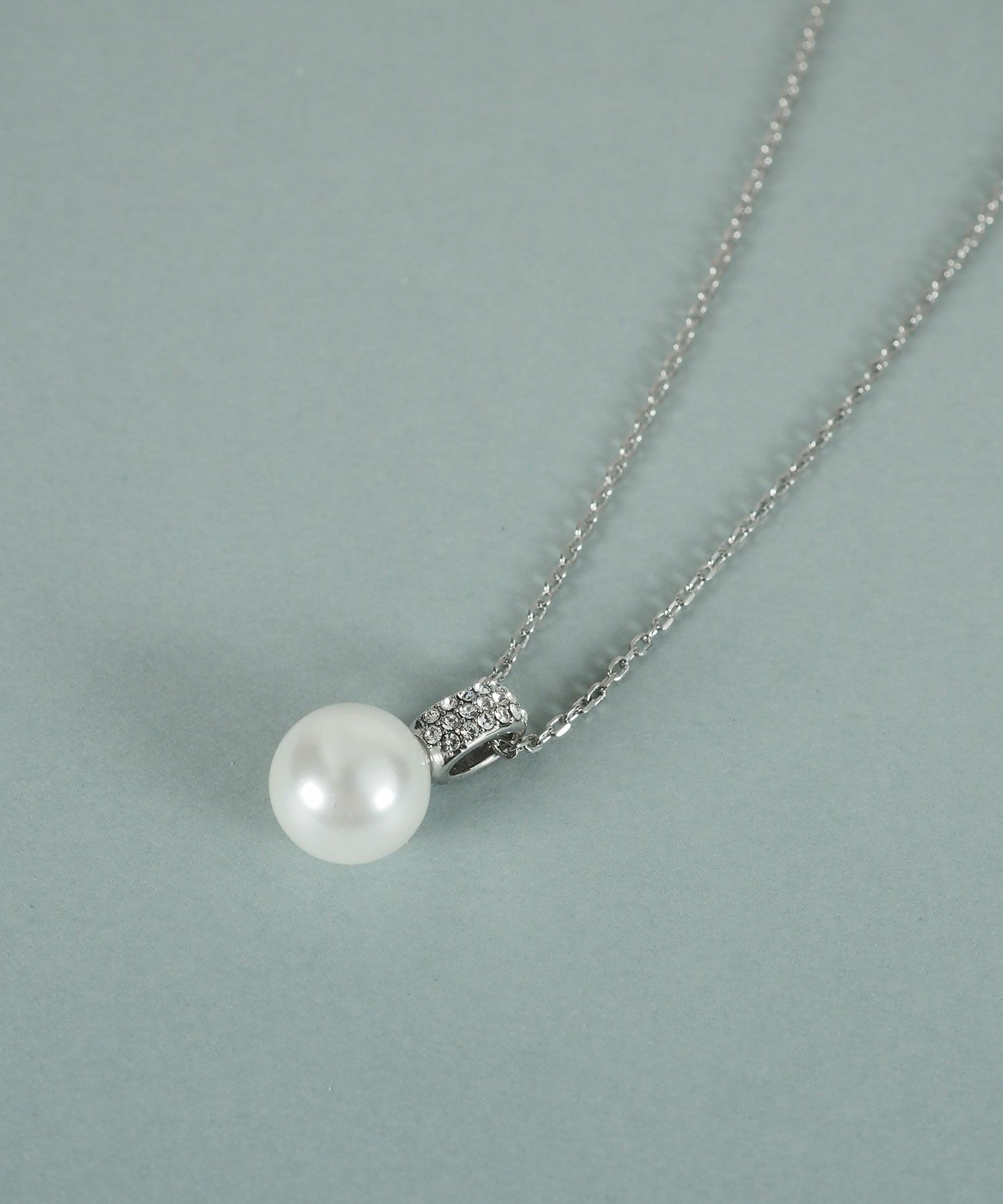 一粒貝パールが美しいネックレス。貝パールを引き立てるように配されたパヴェストーンが繊細な煌めきを放ちます。