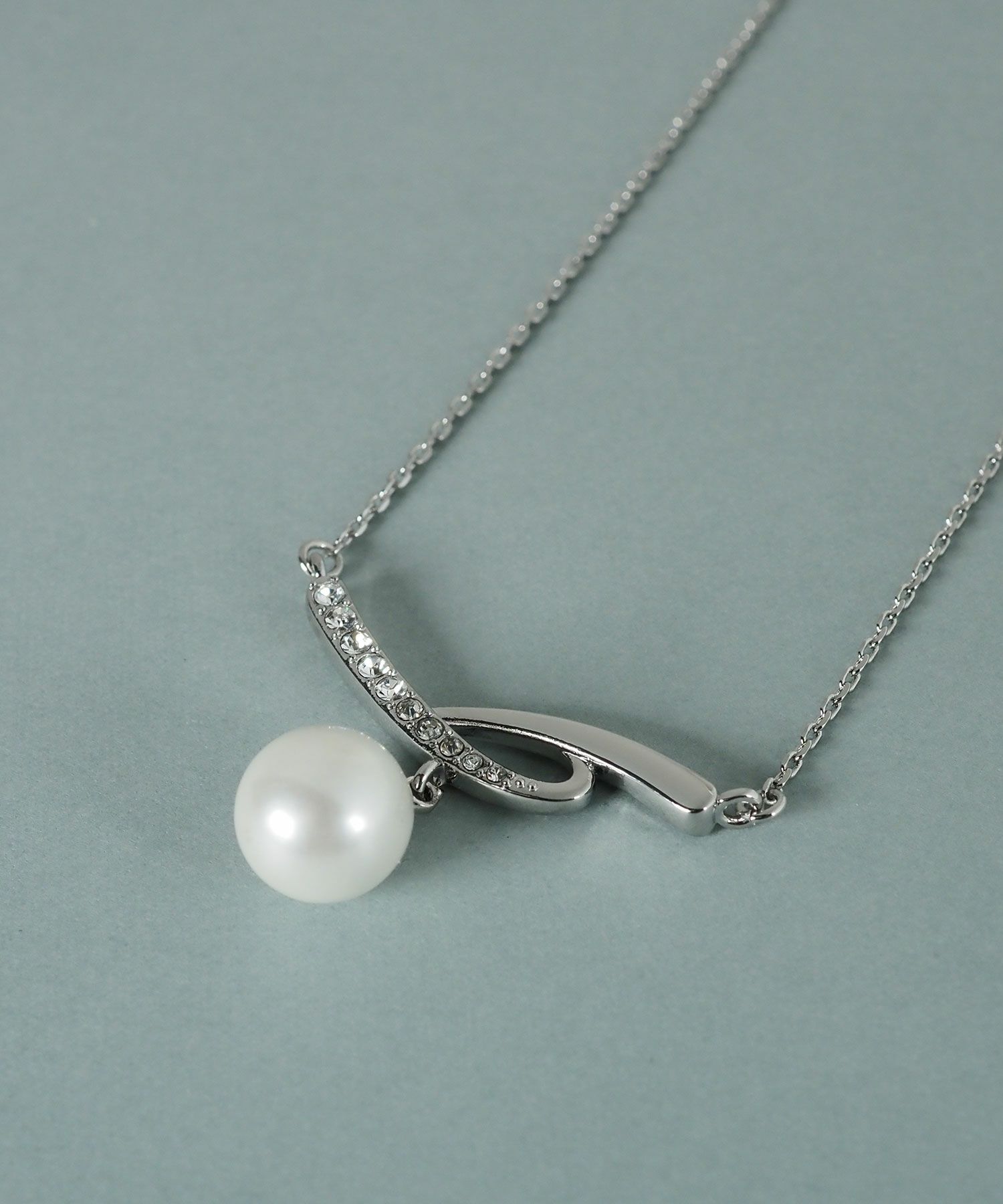 流れるようなアシンメトリーの曲線に、貝パールを組み合わせたモダンでエレガントなネックレス。ライン上に配されたクリスタルガラスが光を受けて煌めき、パールの美しさを引き立てます。