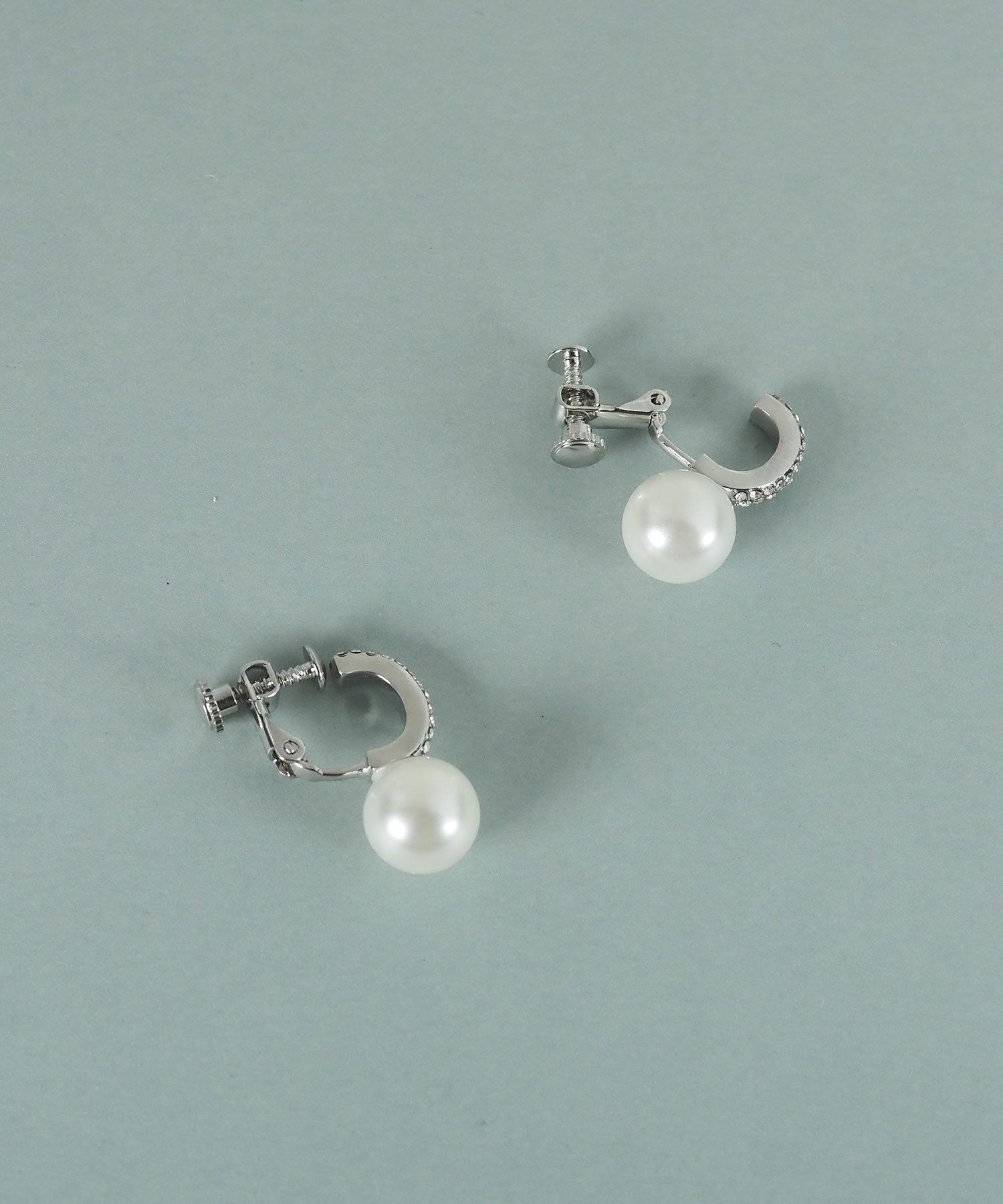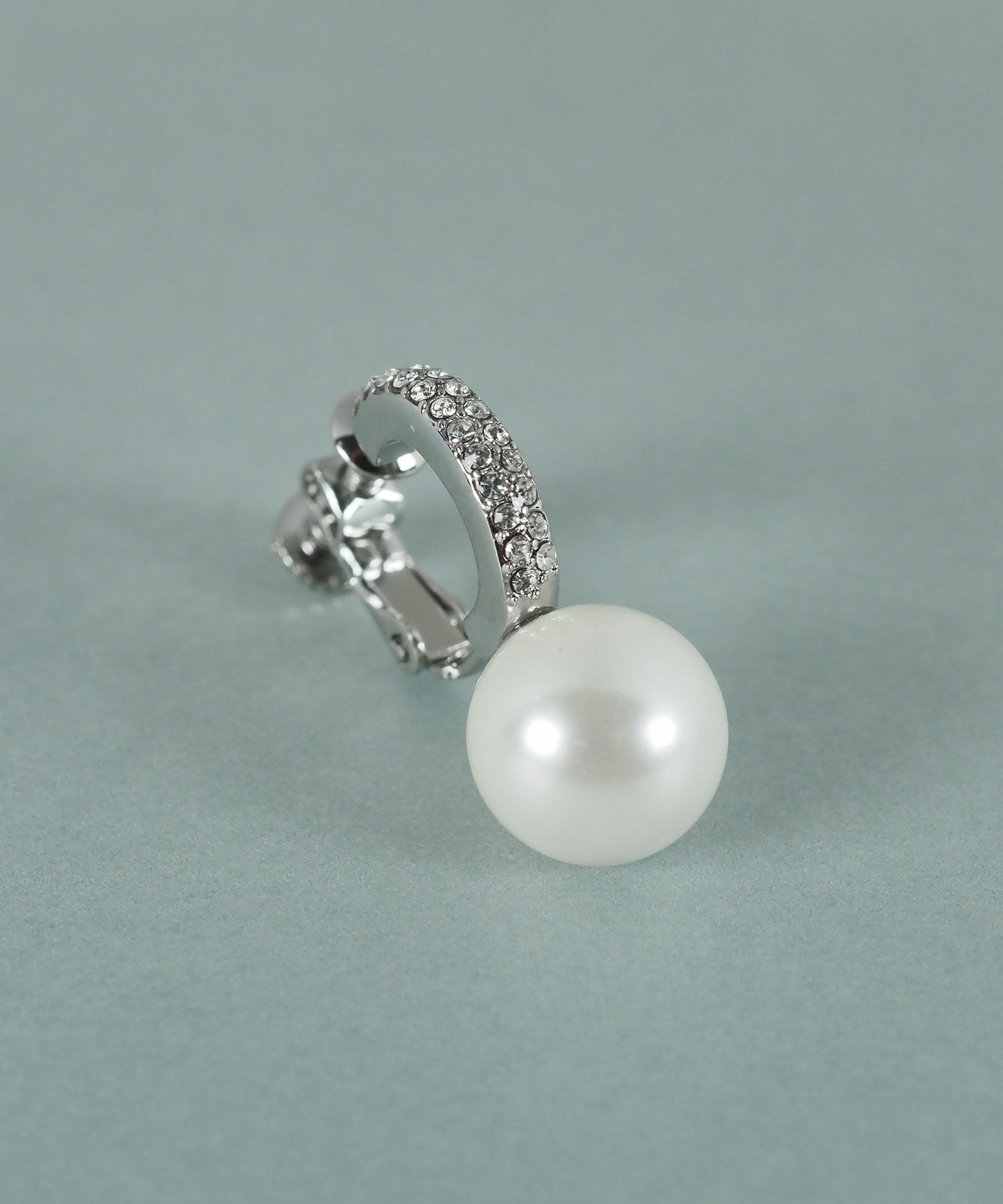一粒貝パールが美しいイヤリング。貝パールを引き立てるように配されたパヴェストーンが繊細な煌めきを放ちます。