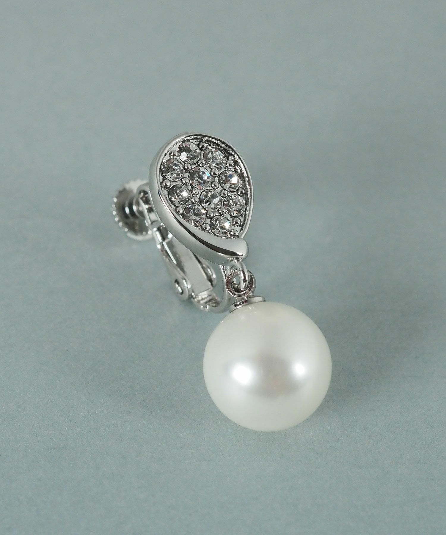 貝パールとしずく型に敷き詰められたクリスタルガラスが輝きを放つエレガントなイヤリング。大粒のパールが耳元で揺れ、顔回りを華やかに彩ります。