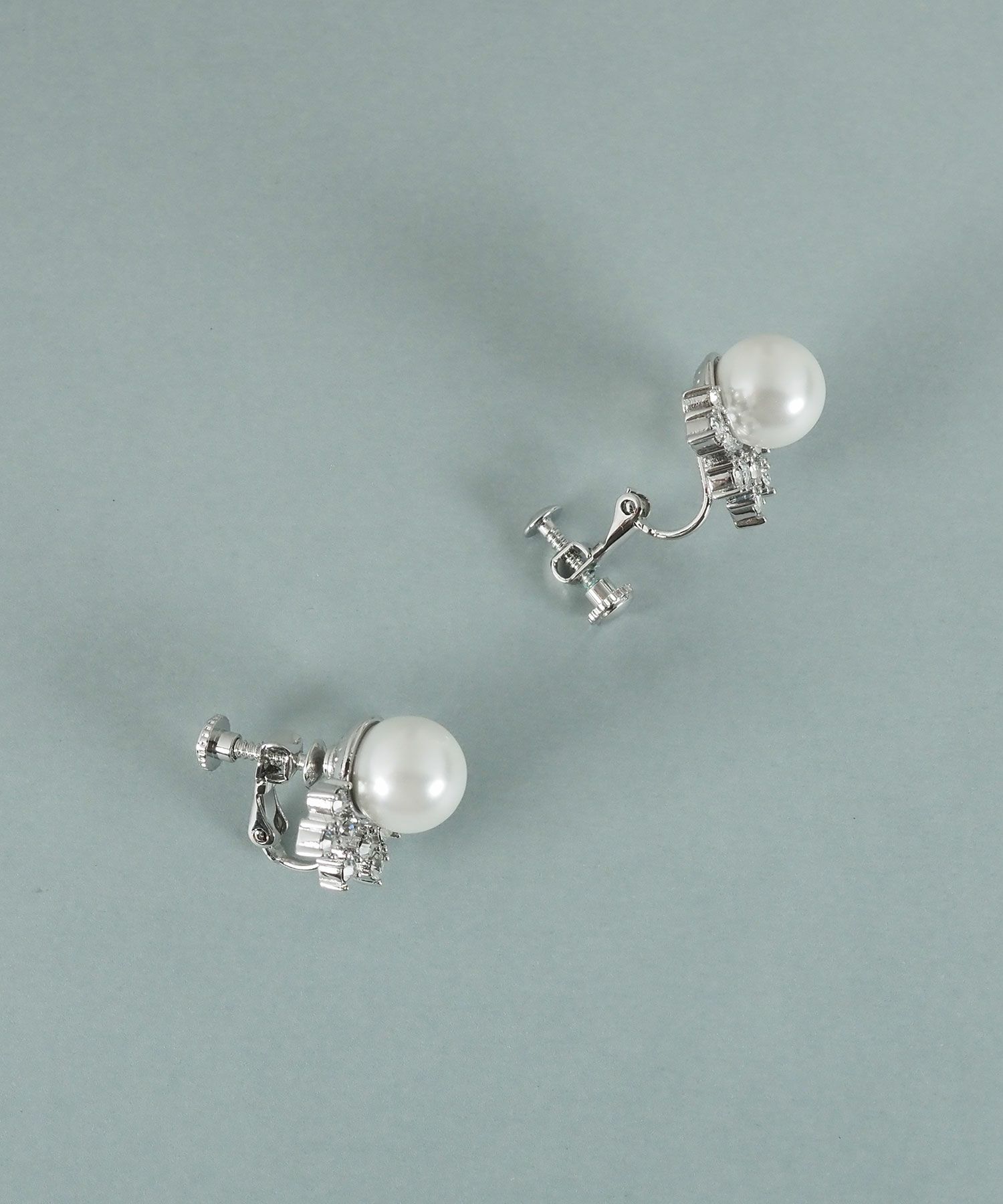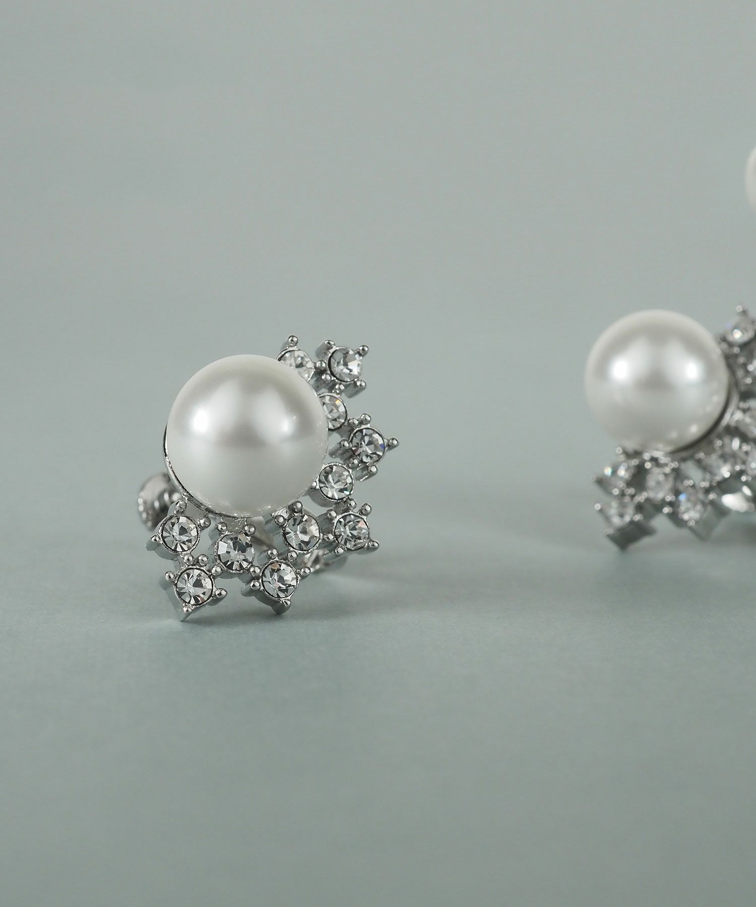 美しい貝パールをビジューで囲んだエレガントなデザインのイヤリング。立体感のある華やかなモチーフが光を受けて煌めき、耳元を明るく彩ります。