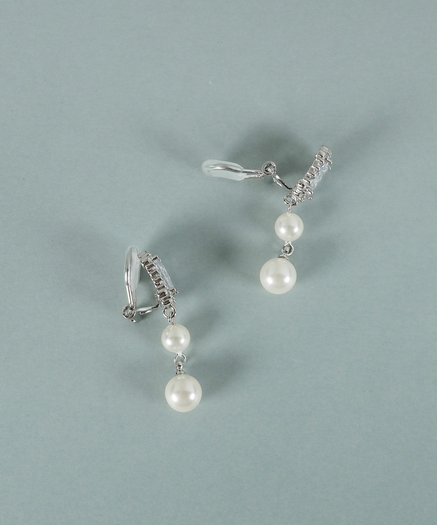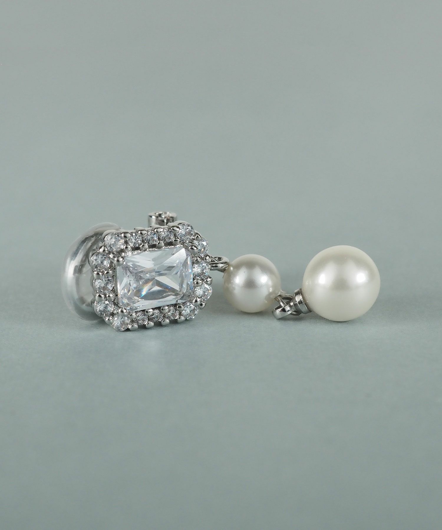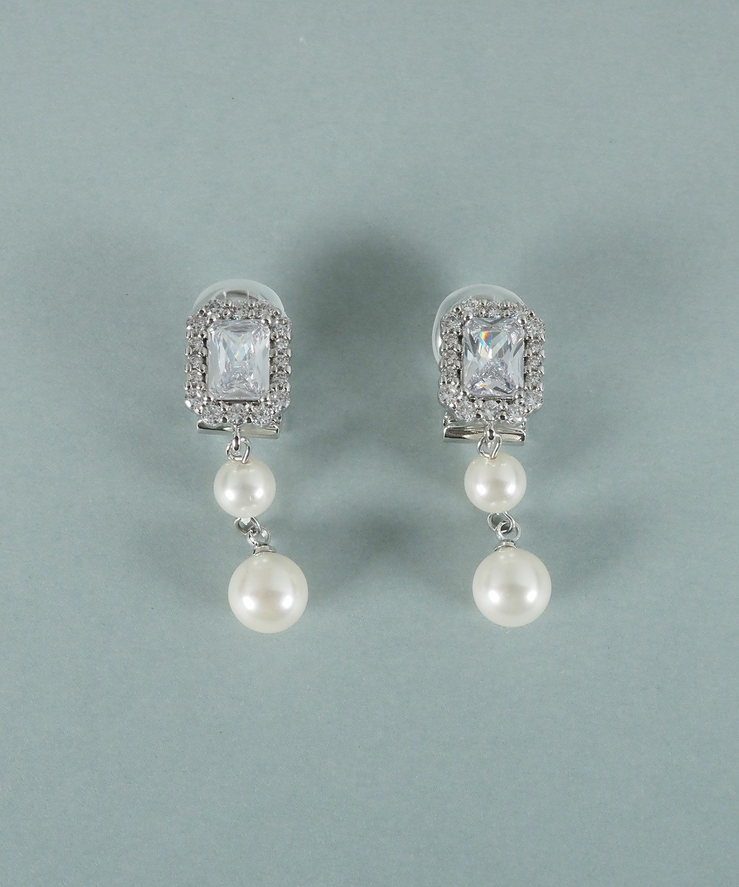 贅沢に配置されたキュービックジルコニアと雫のように揺れるパールがエレガントなイヤリング。2粒のパールが耳元で揺れ、顔回りを華やかに彩ります。
