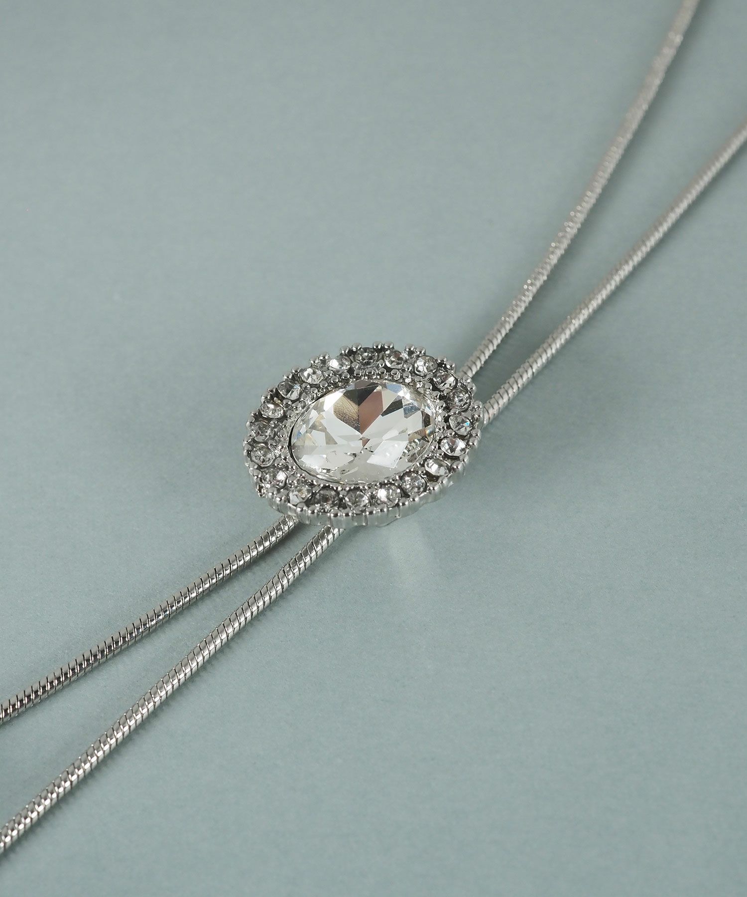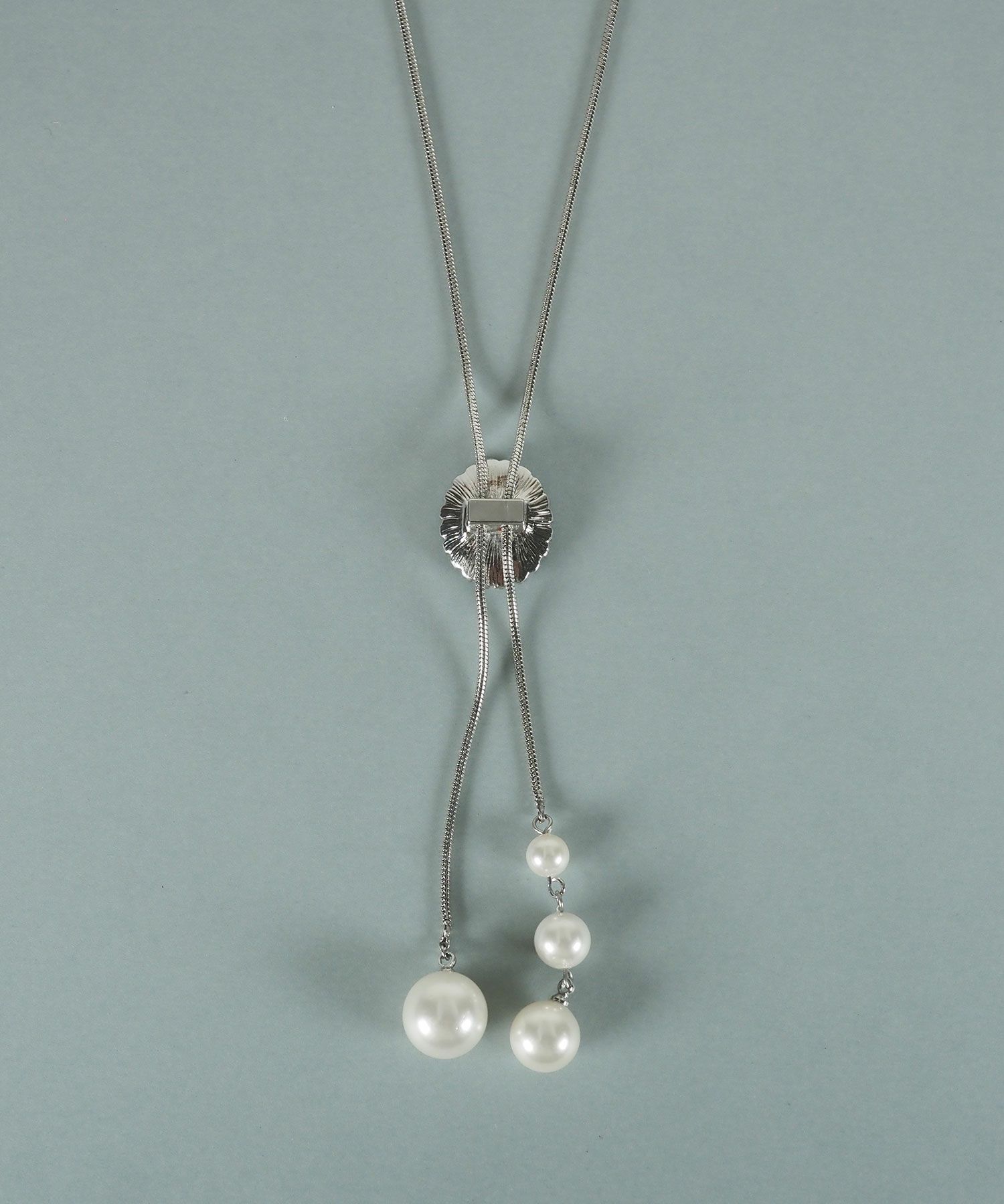 大小の貝パールが動くたびに揺れるエレガントなロングネックレス。中央に配置されたクリスタルガラスが光を集めて煌めきます