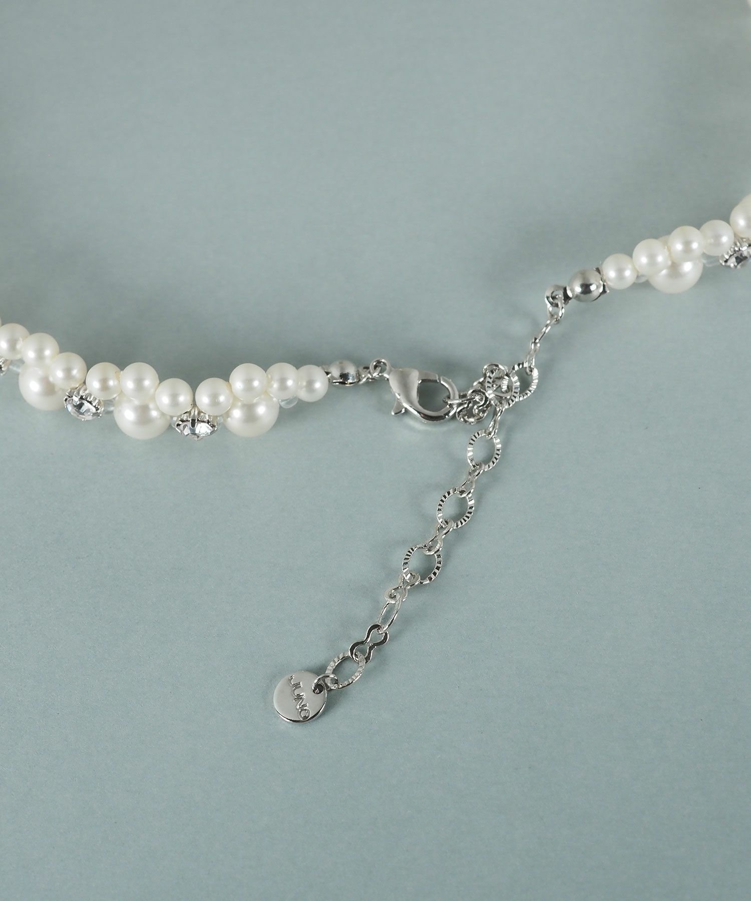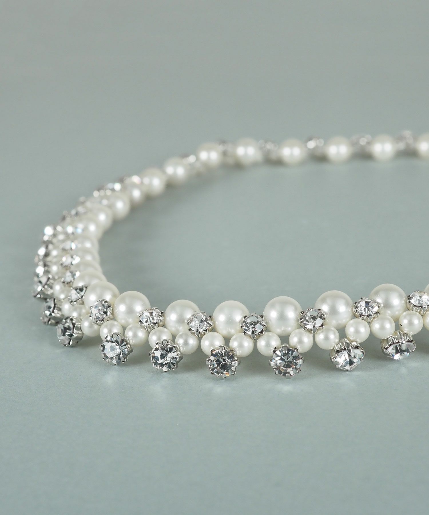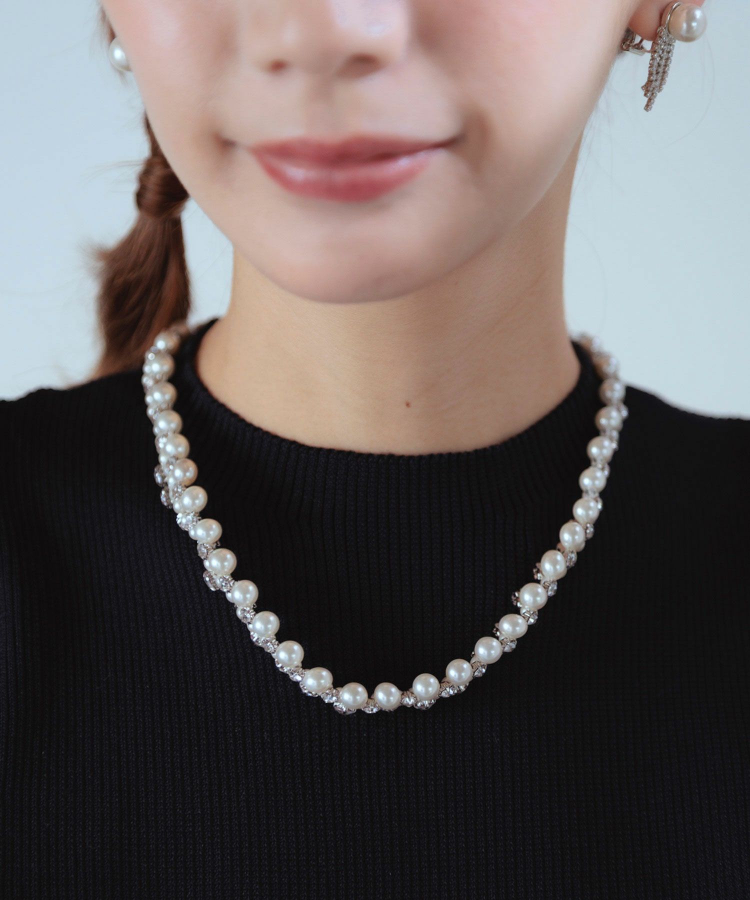 上品な輝きを放つ貝パールに、クリスタルガラスを贅沢にあしらったエレガントなネックレス。華やかで立体感のあるデザインが首元を明るく彩ります。