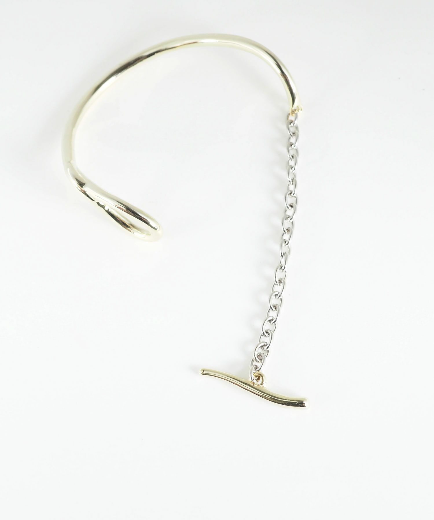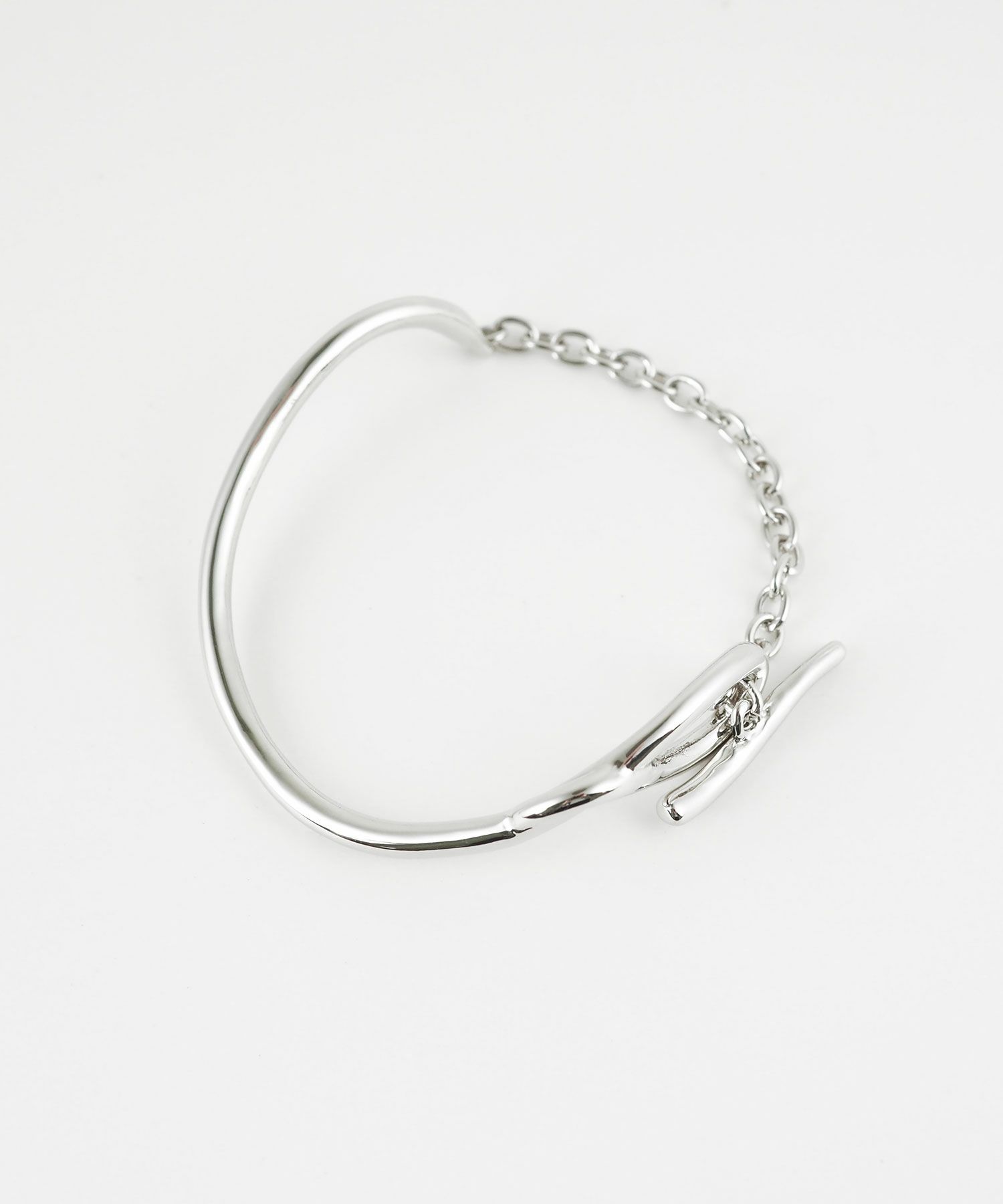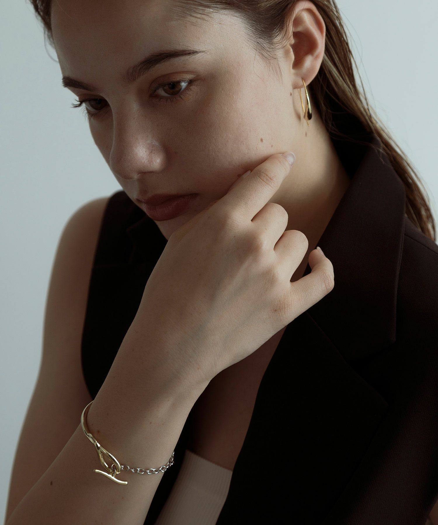 チェーンブレスレットとバングルが合体したような新感覚アイテム。一本で重ね付けしているかのような、レイヤードスタイルが完成します。忙しい朝でも、これ一つでトレンド感のある手元を演出できます。