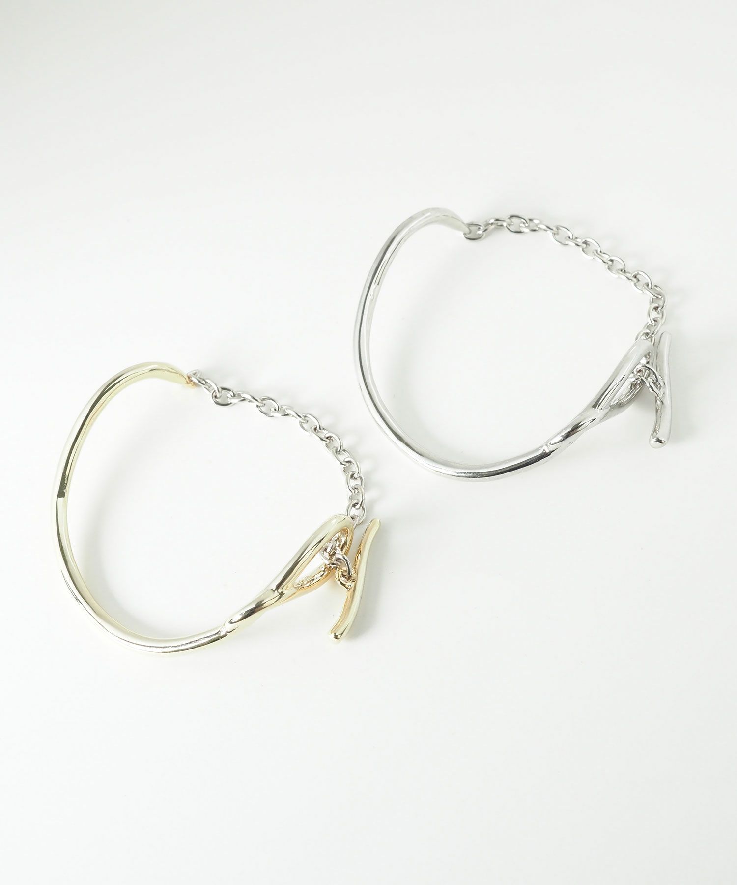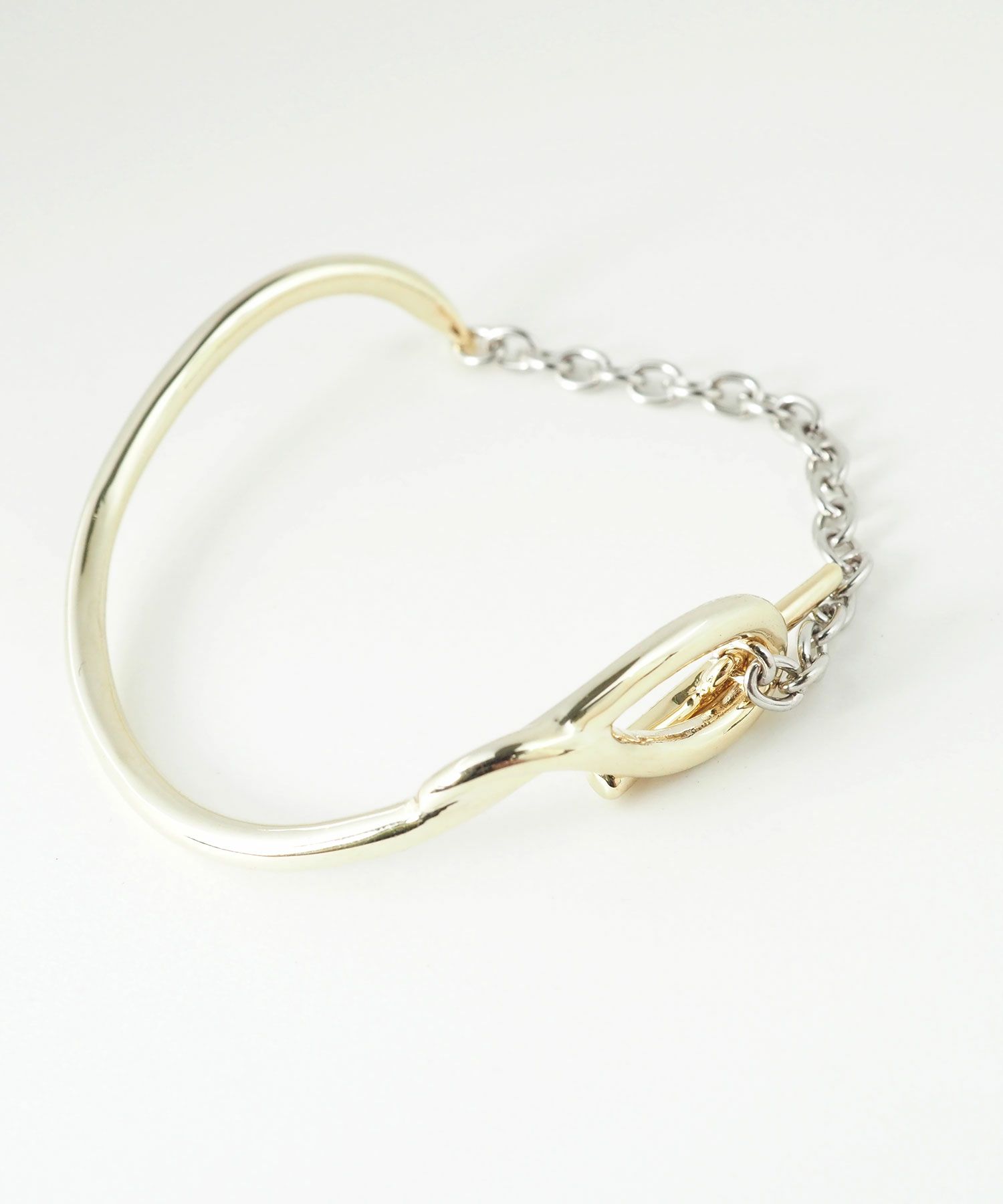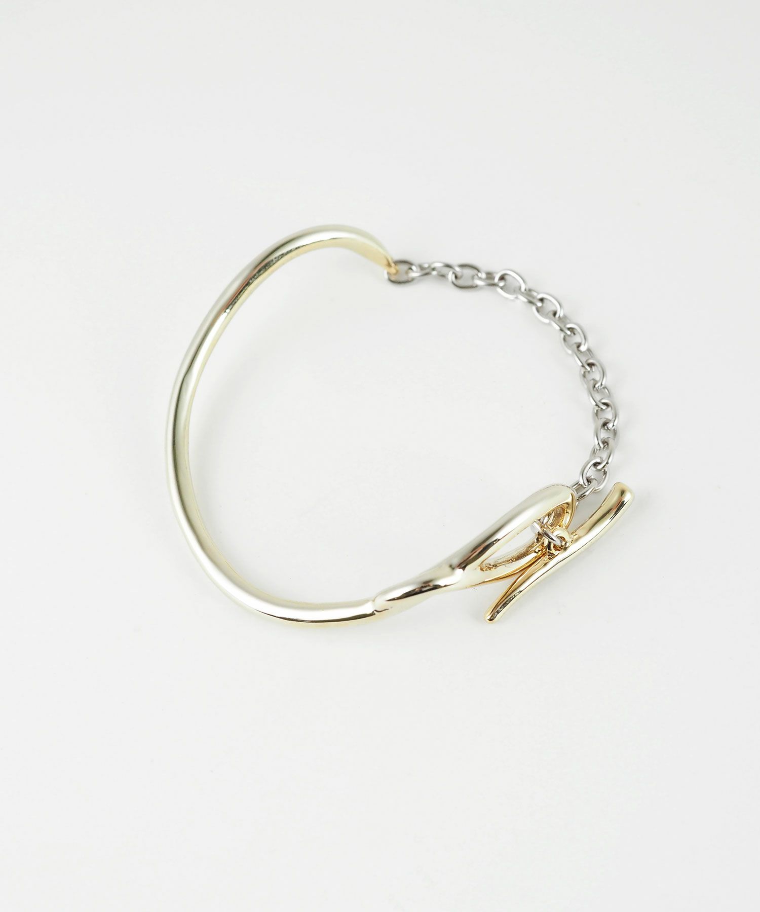 チェーンブレスレットとバングルが合体したような新感覚アイテム。一本で重ね付けしているかのような、レイヤードスタイルが完成します。忙しい朝でも、これ一つでトレンド感のある手元を演出できます。