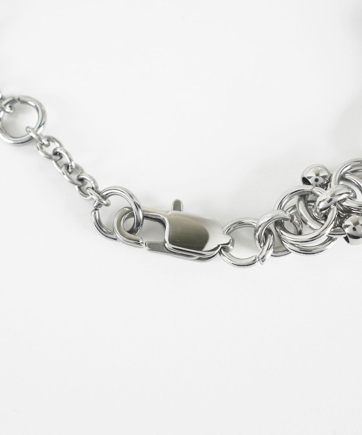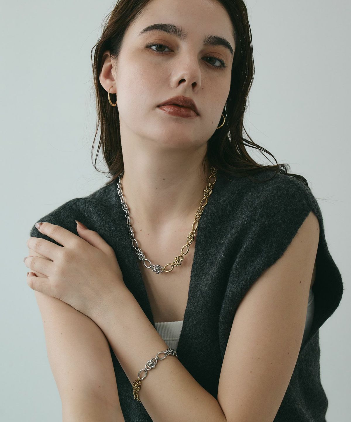 異なるデザインのチェーンを組み合わせたチェーンブレスレット。存在感のあるチェーンが連なり、華やかで個性的な印象を演出し、シンプルコーデのアクセントに。ルシャンツィオで人気のチェーンを使用したアイテムの新作です。