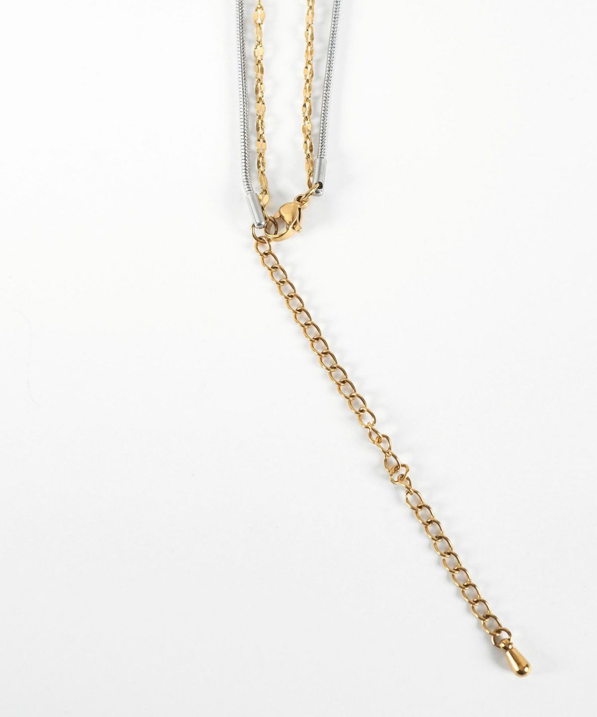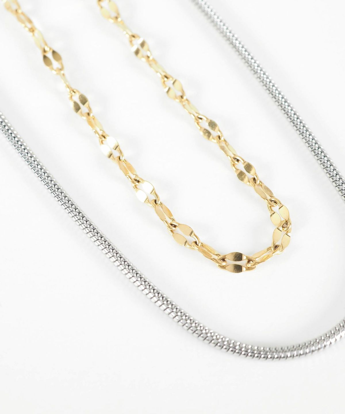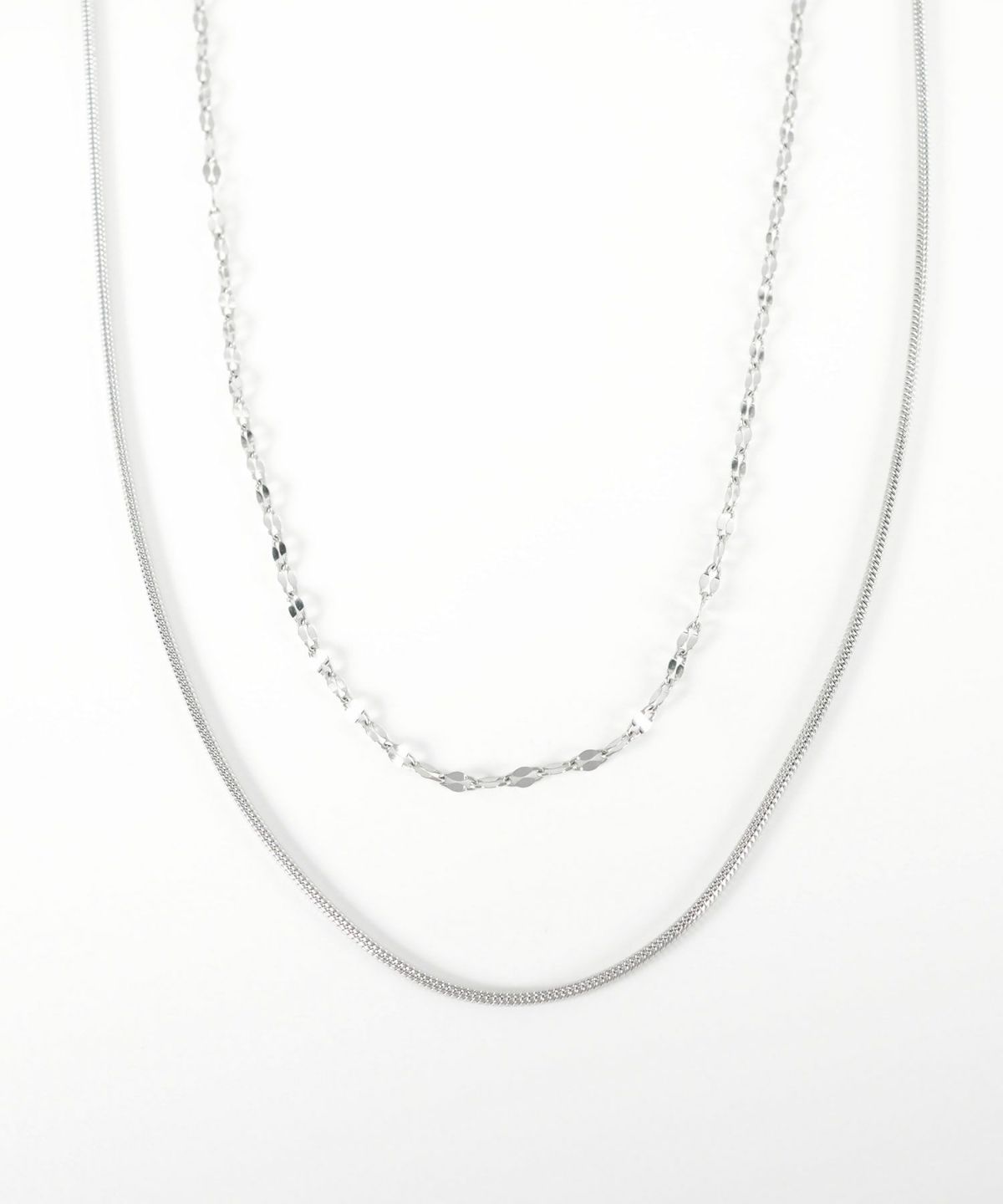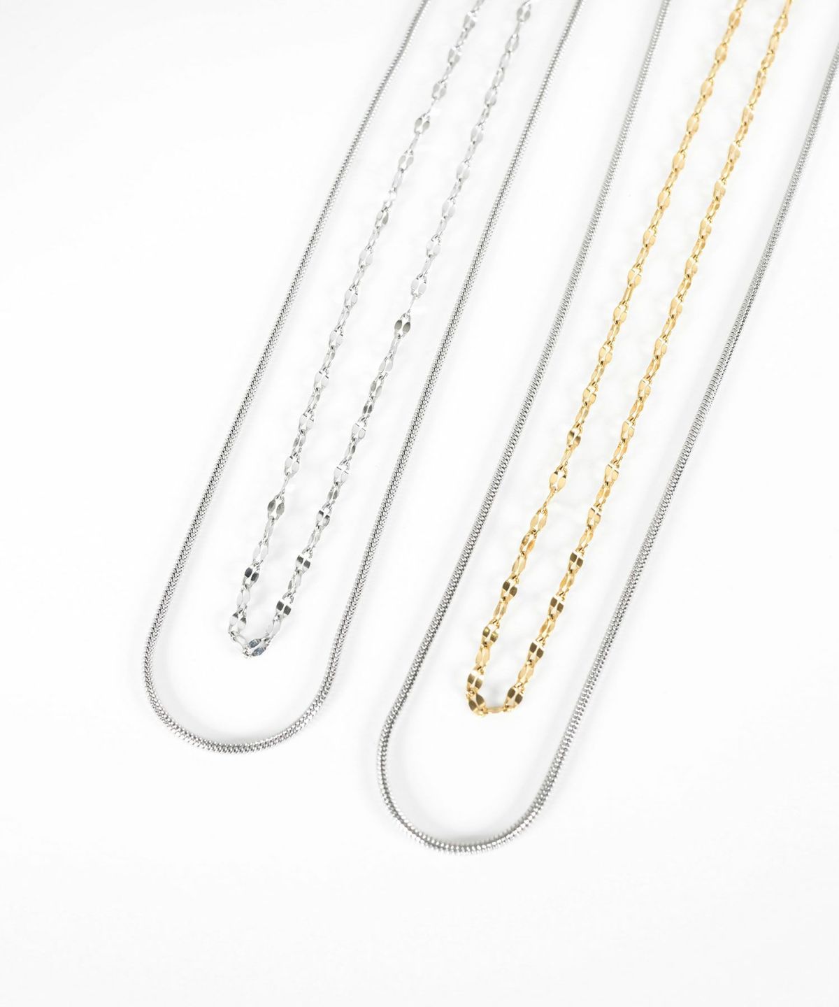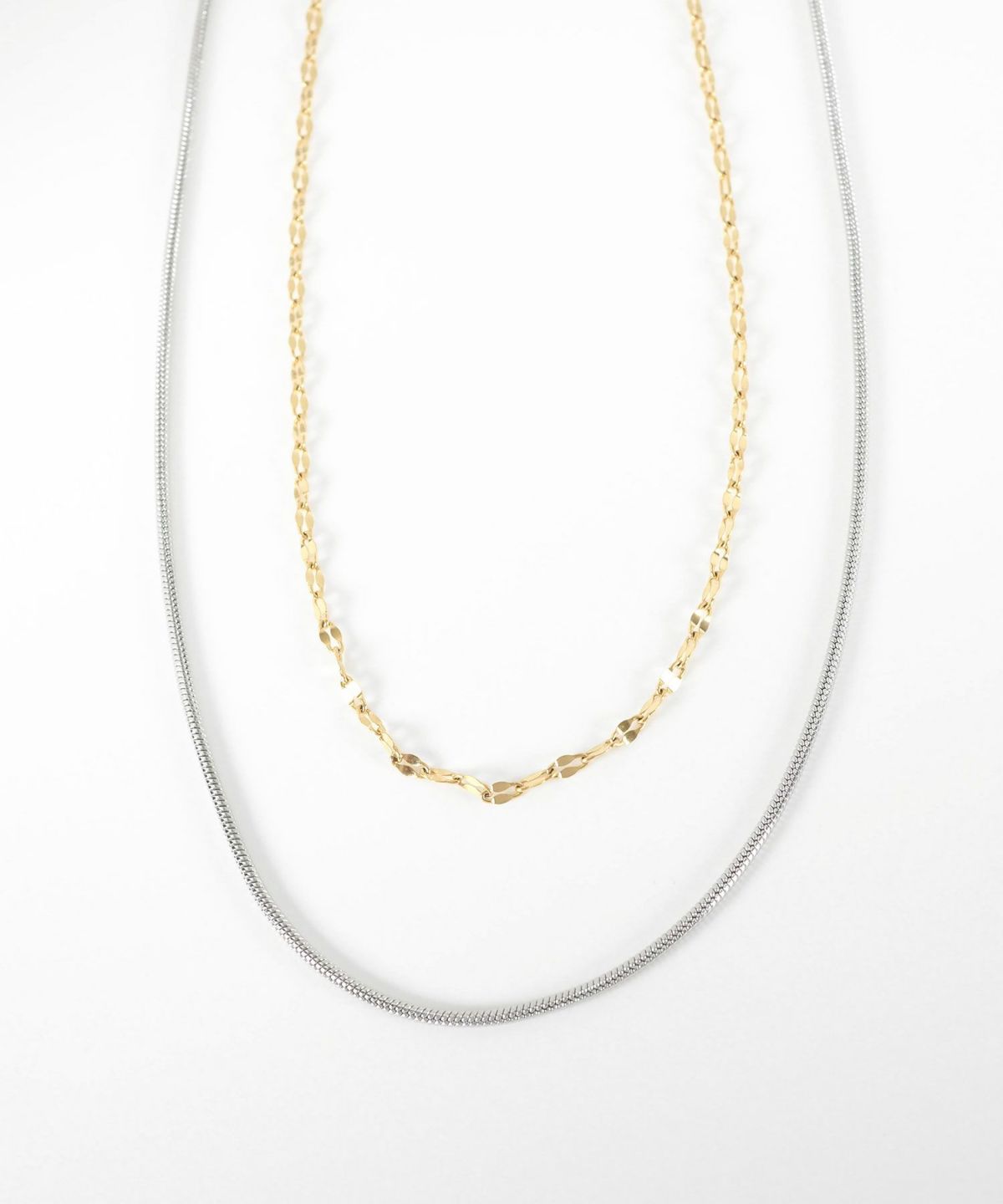 定番人気の異なるデザインのチェーンを使用した2連ネックレス。キラキラと輝くペタルチェーンと、繊細なスネークチェーンが組み合わさり、華やかで洗練された首元を演出します。