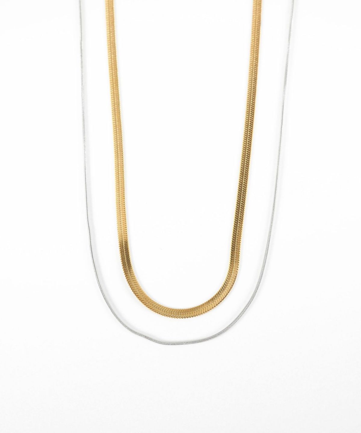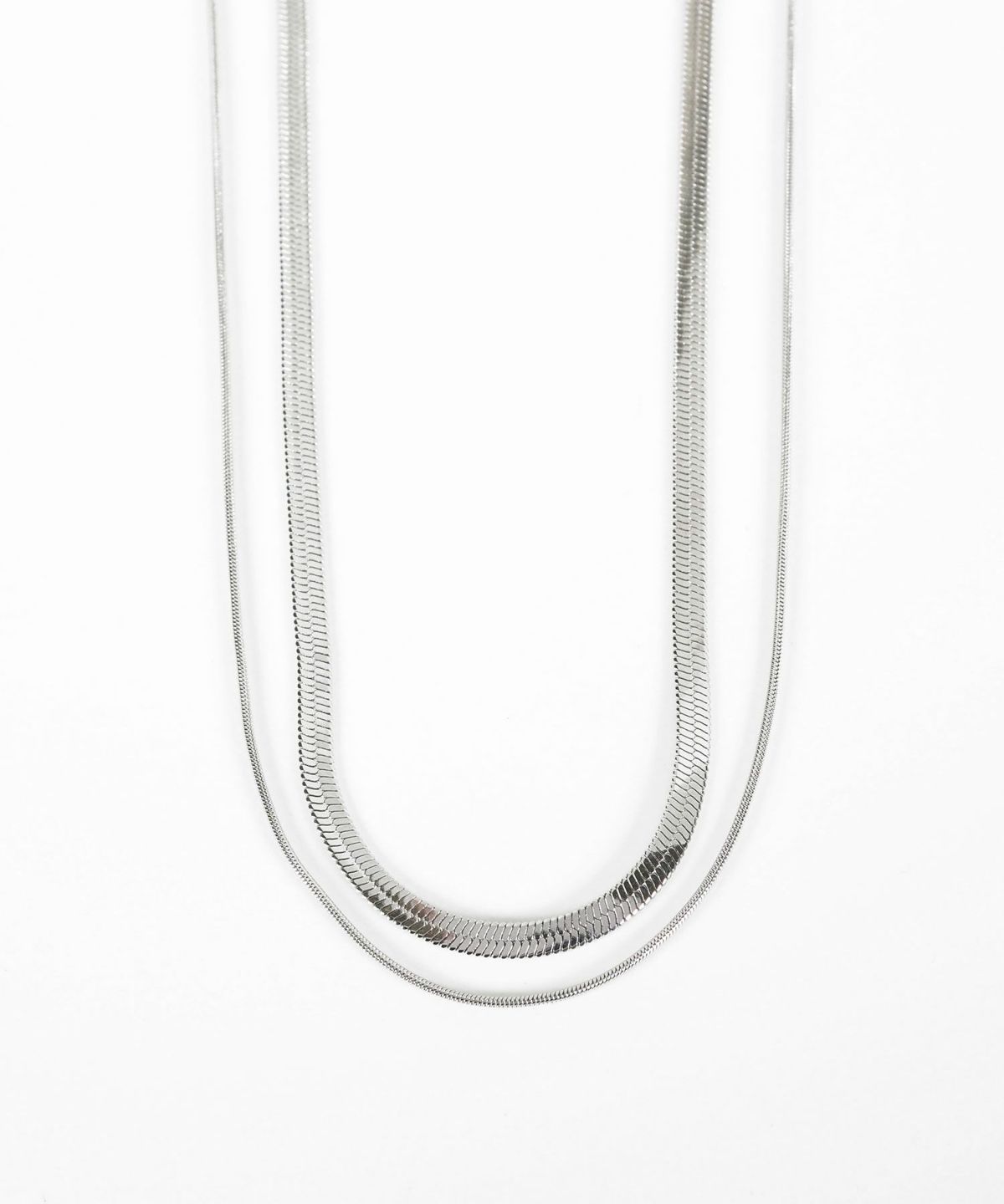 定番人気のチェーンを使用した、一本でトレンドのレイヤードスタイルが完成する2連ネックレスです。幅広なスネークチェーンと、華奢なチェーンのコントラストが魅力的。首元に洗練された光沢と立体感をプラスします。