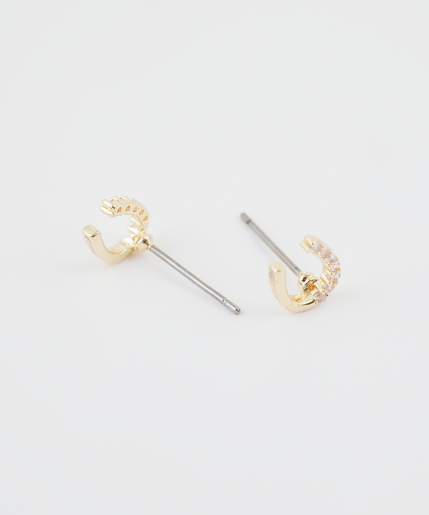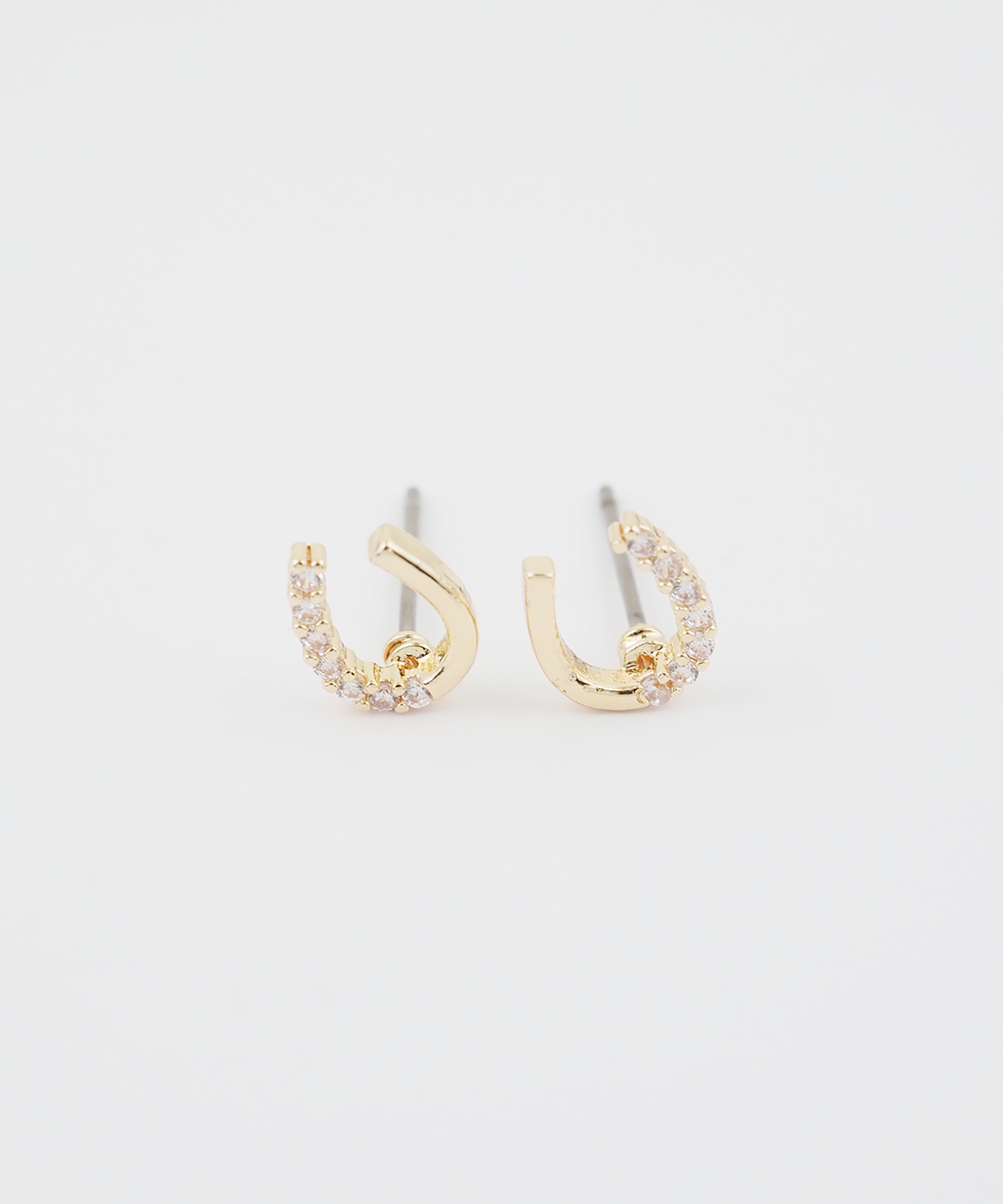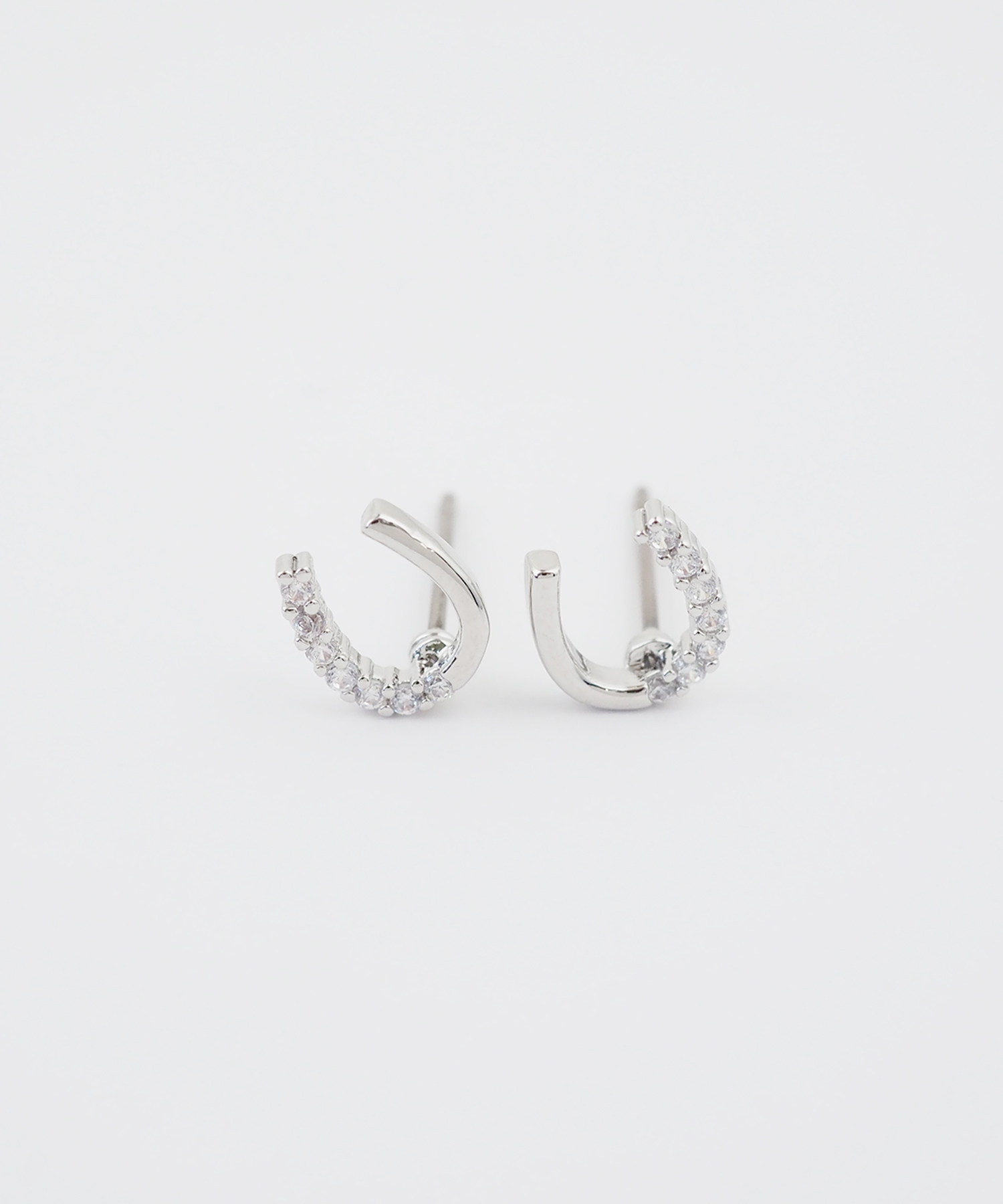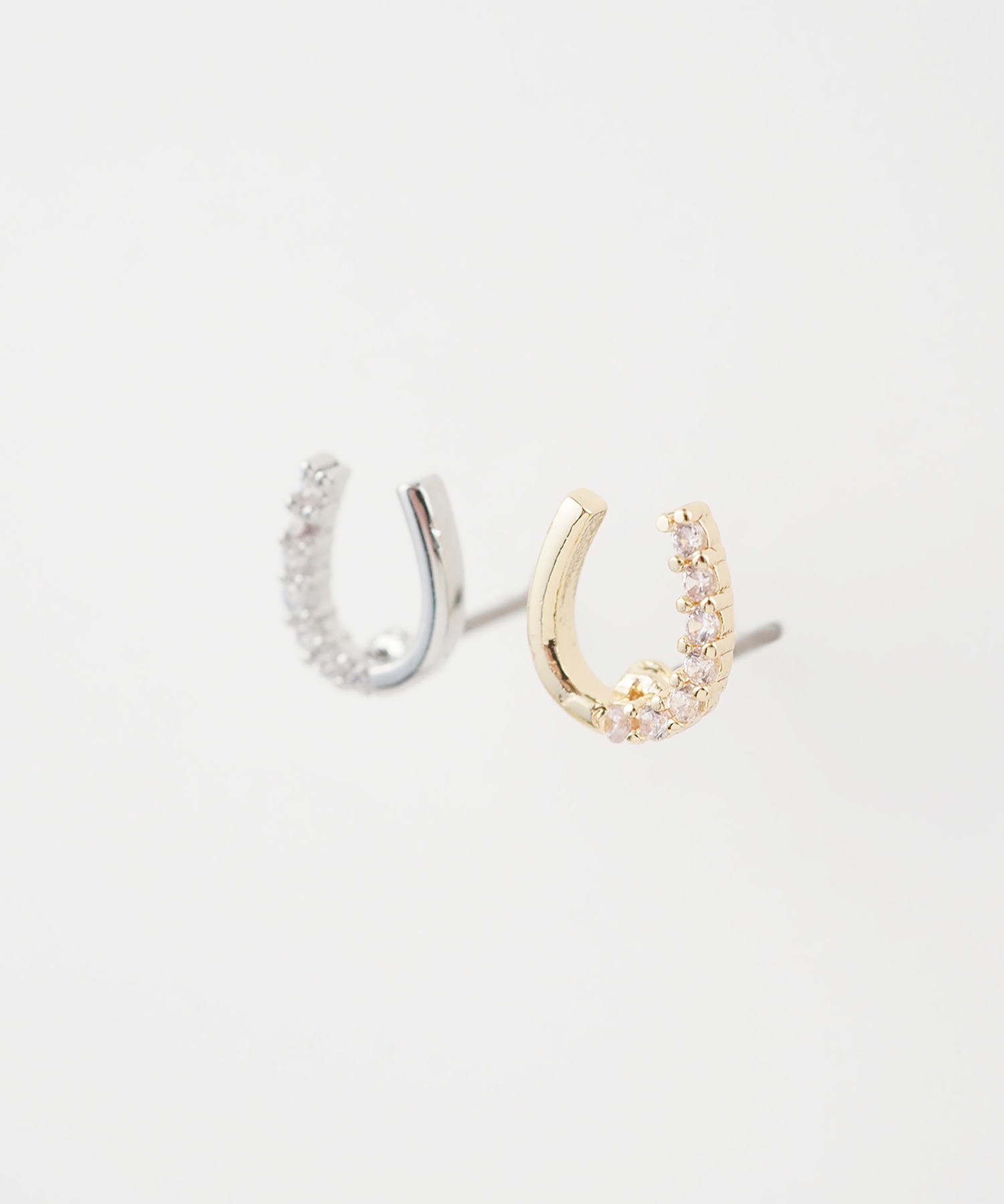 幸運をもたらすと言われるホースシューモチーフにジルコニアをあしらったピアス。シンプルかつ上品な印象でカジュアルからフォーマルまで合わせやすい。通常のポストよりも長いポスト(12mm)を使用しているため、耳たぶの厚い方におすすめ。長さに余裕があるためピアスホールに負担をかけず、トラブルを防ぎます。素材は純チタンのため金属アレルギーの方も安心できるのがポイント。ペアピアス(両耳用)です。