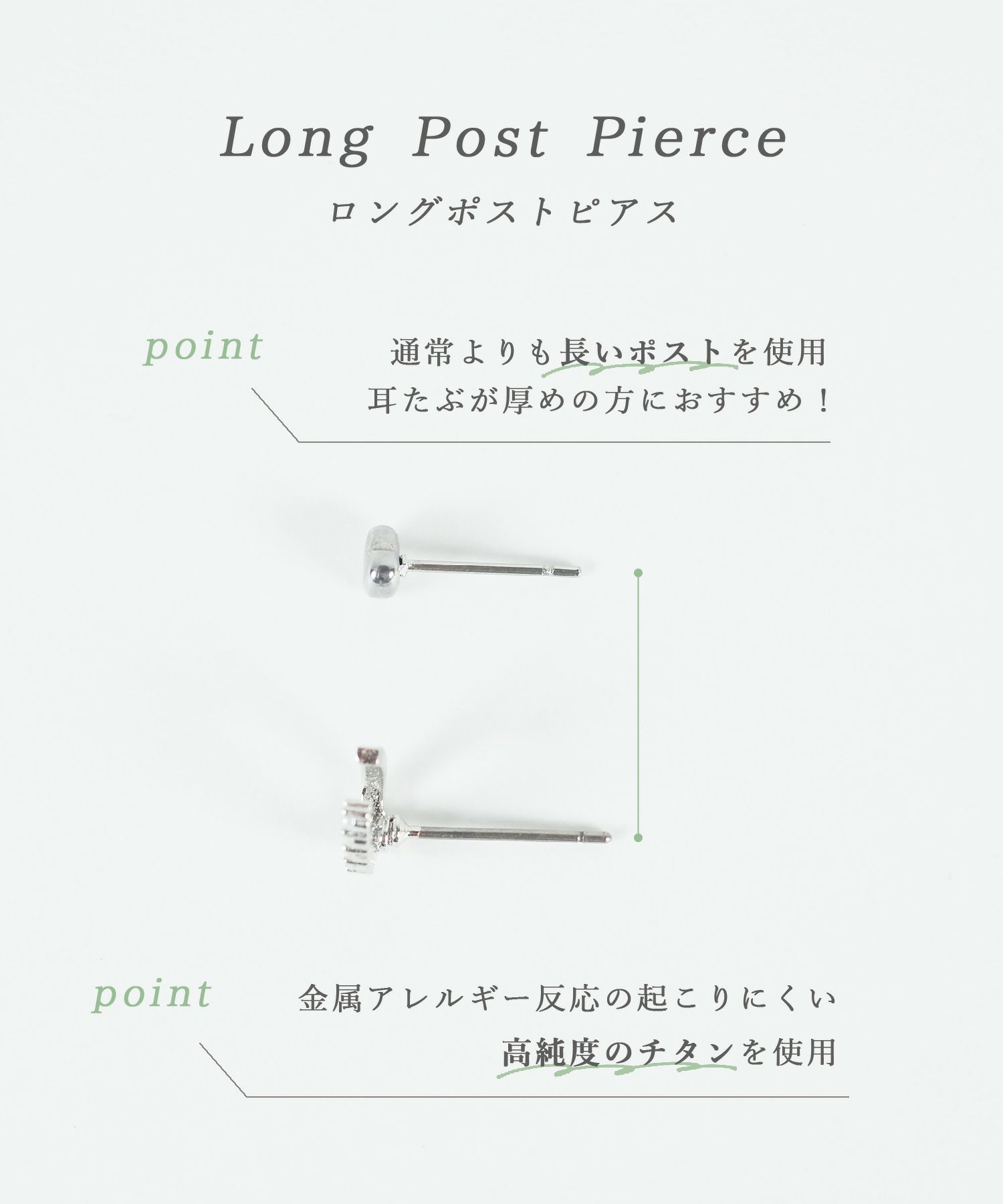 腐食・錆びに強く、金属アレルギー反応の起こりにくい「チタン」をポスト部分に使用したピアス。金属アレルギー対応素材として広く知られており、豊富なデザインとバリエーションが揃います。また他の金属に比べ軽量のため、耳の負担になりにくい特徴もあります。