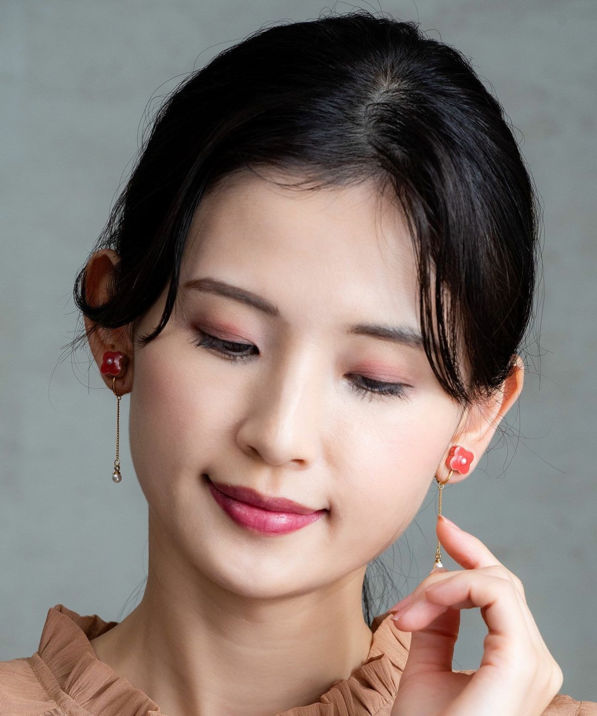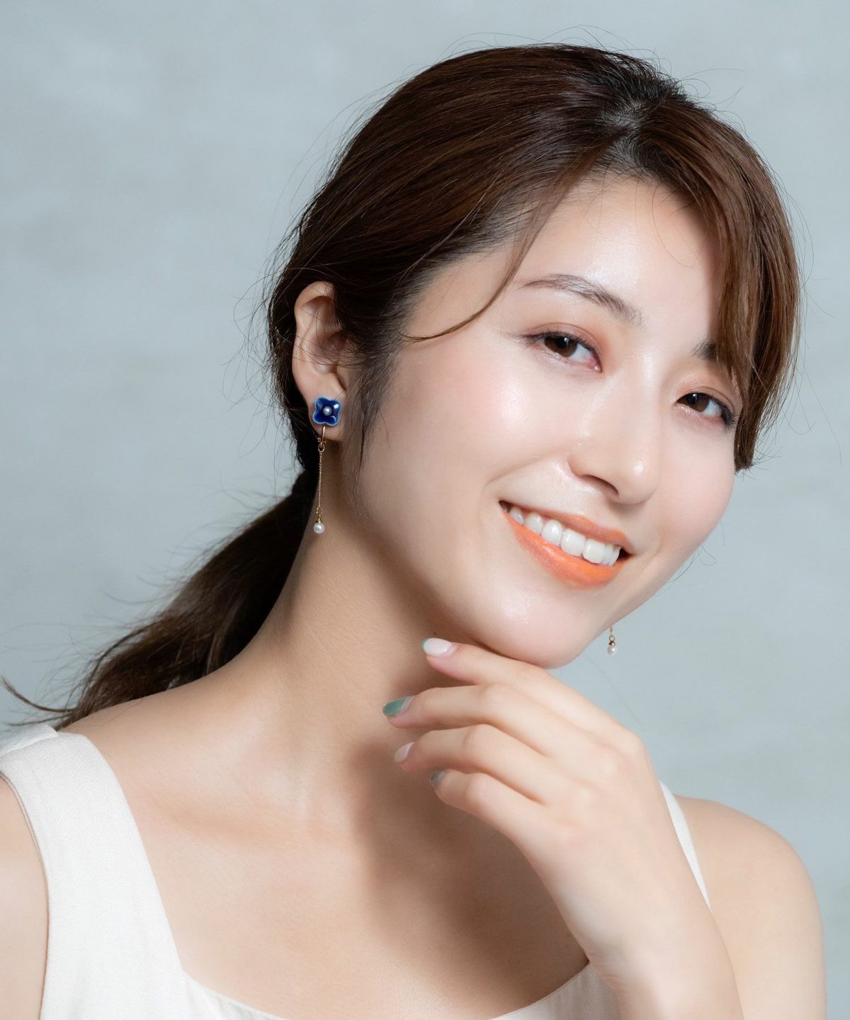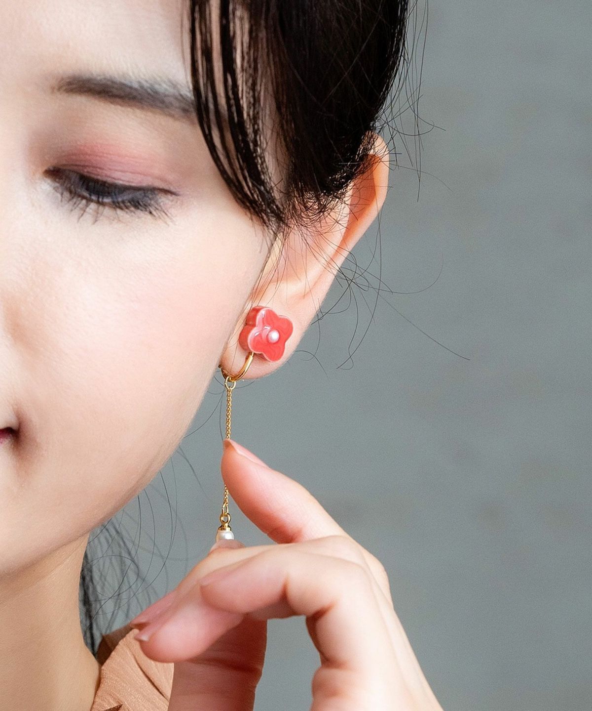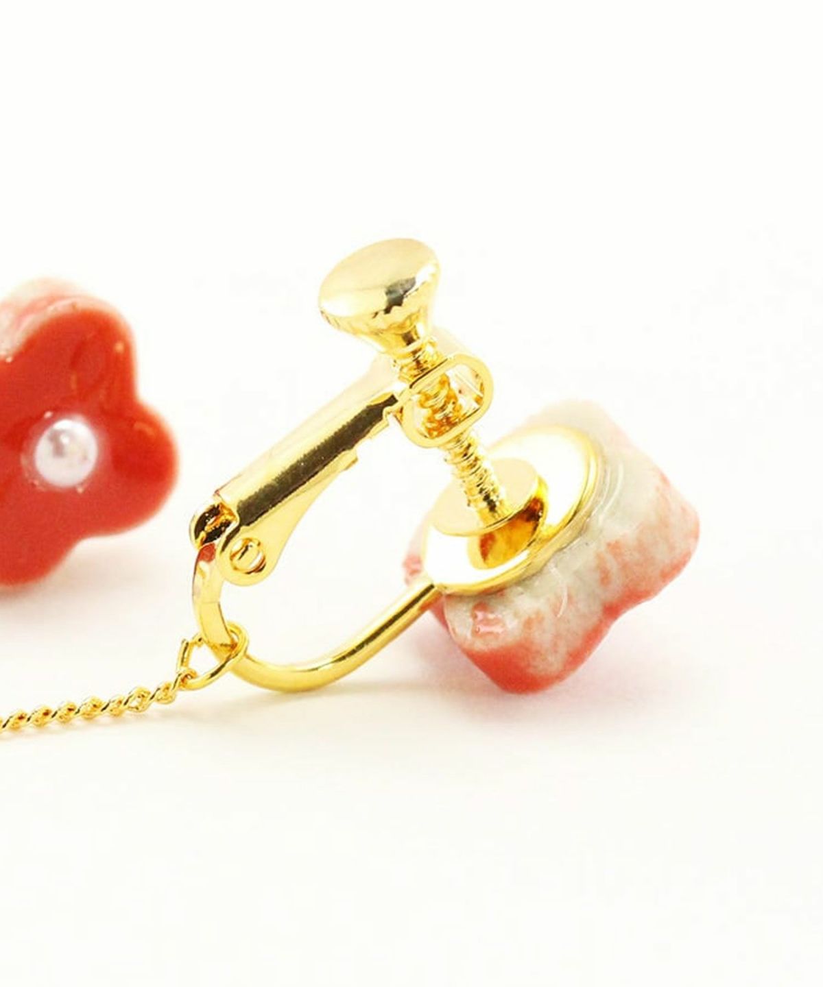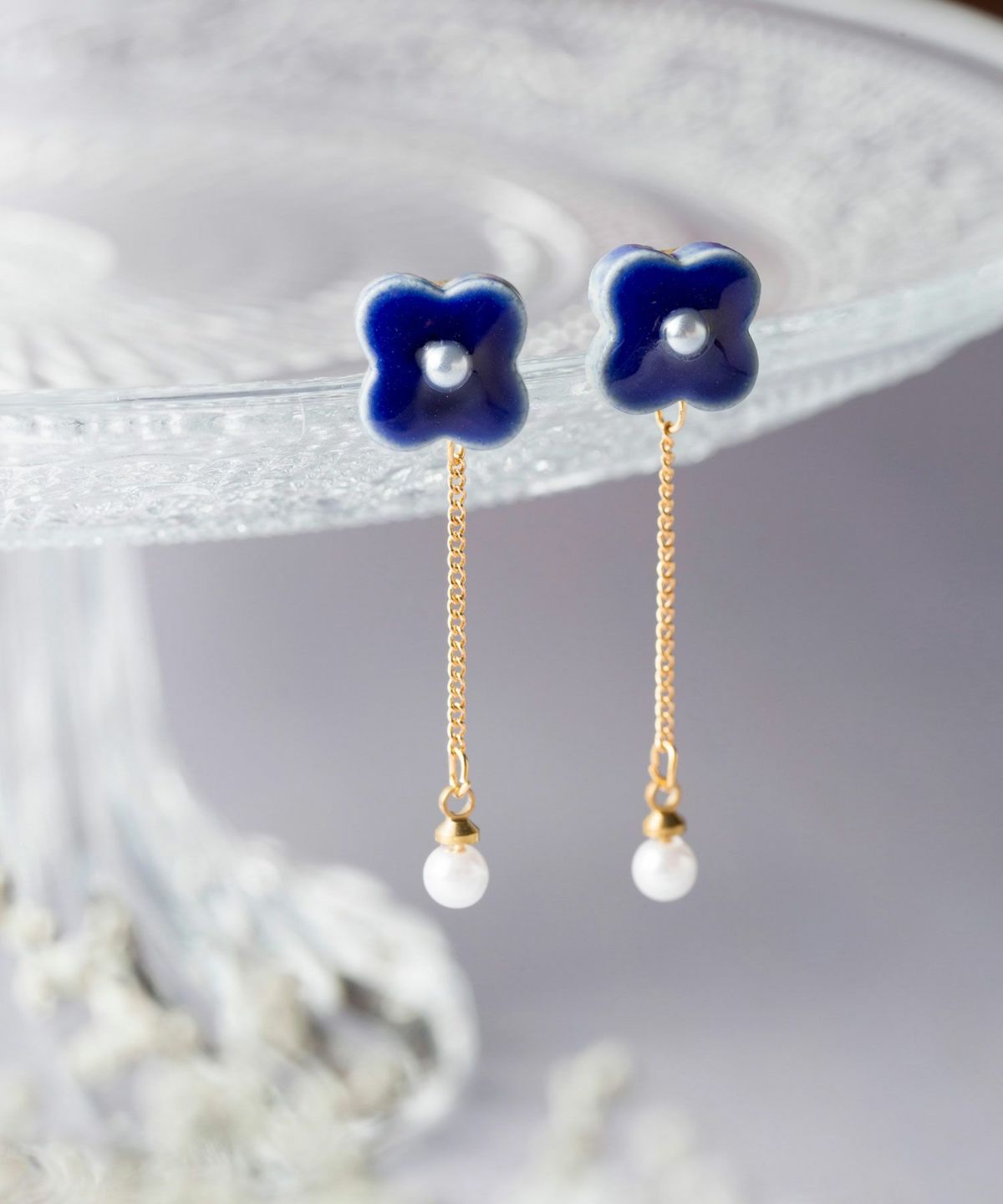 美濃焼陶器のお花にパールを添えたイヤリング。パールが付いたチェーンがゆらゆら揺れて顔回りを華やかにしてくれます。10mmほどの主張しすぎないサイズ感が使いやすく、ちょっとしたお出かけや、パーティーシーンでも活躍してくれます。