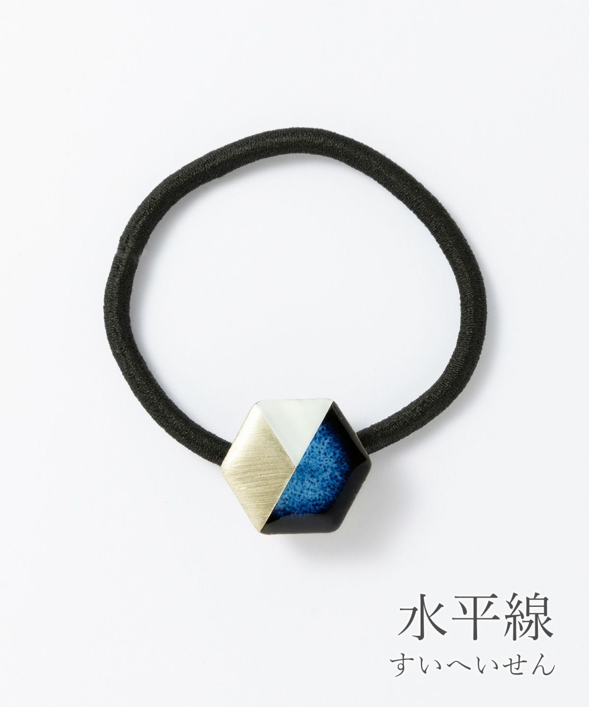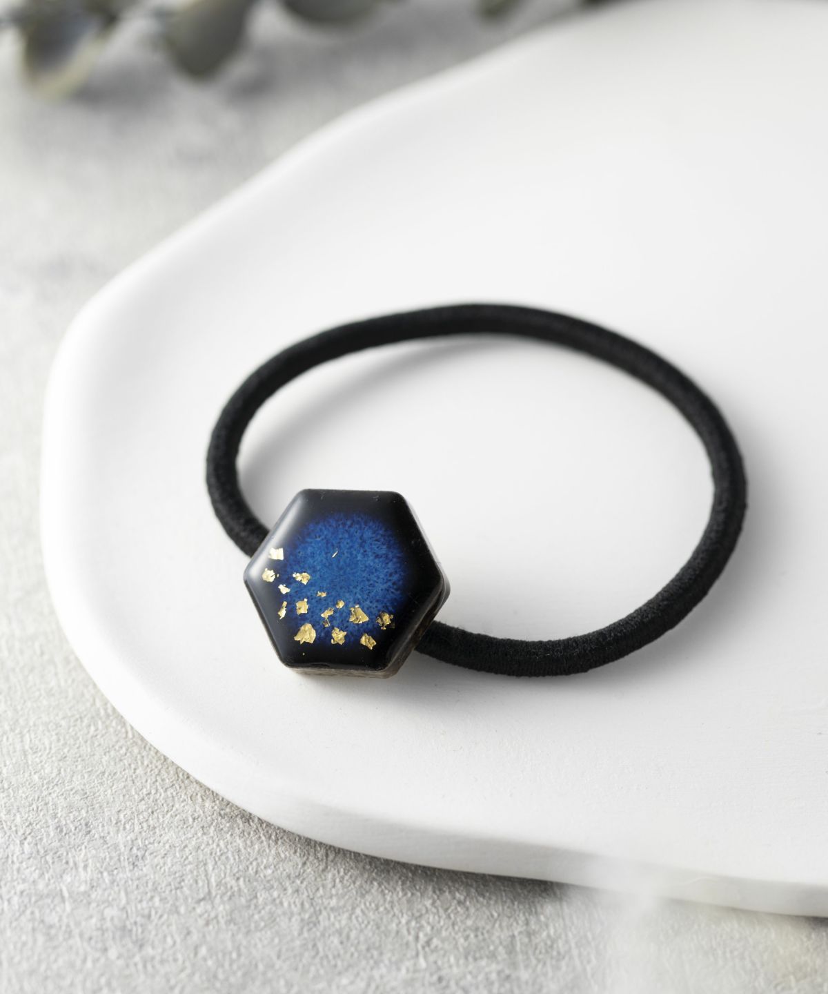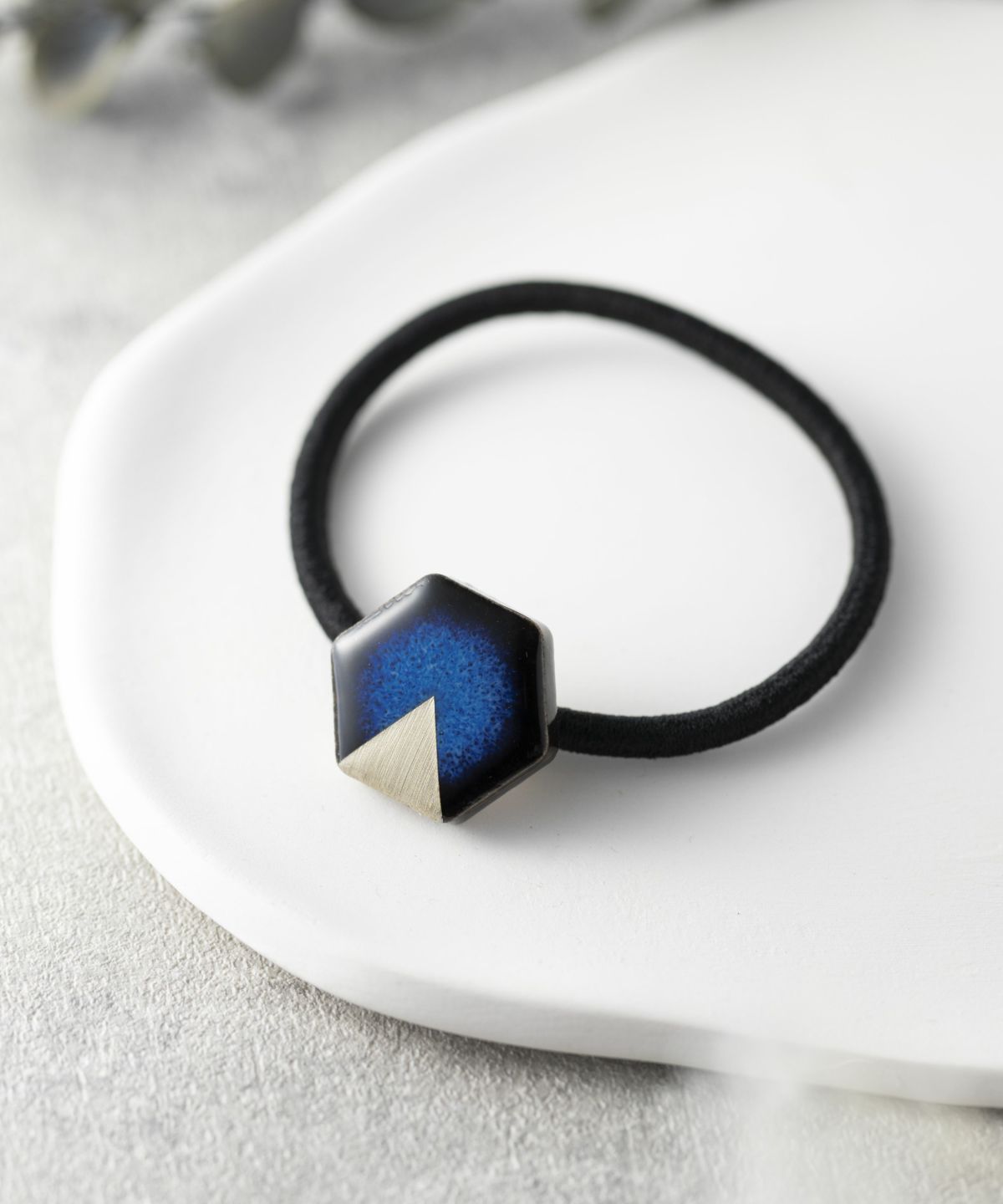 伝統工芸品、美濃焼陶器のヘアゴムです。 藍色にゴールドのアクセントが知的で女性らしい印象に。シンプルな色使いが普段使いにも取り入れやすく、存在感もあるのでパーティーシーンにも活躍してくれます。
