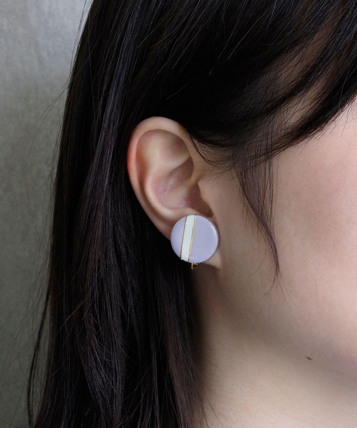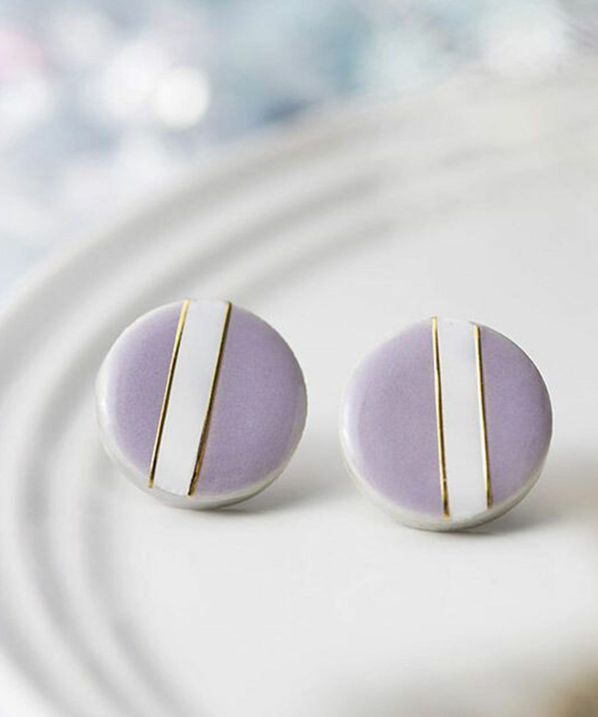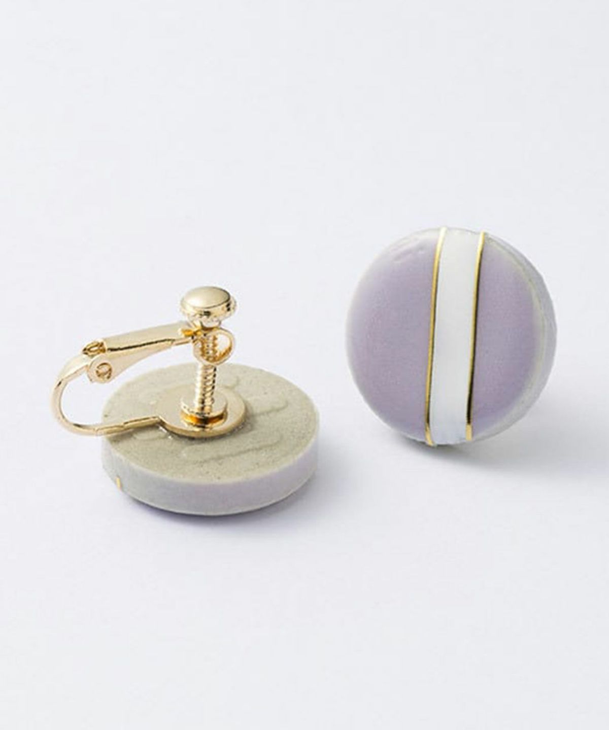 伝統工芸品、美濃焼陶器のイヤリング。温かみのある陶器にクラシックなテイストをプラスしたクラシックラインは、爽やかなカラーの組み合わせが特徴です。 ニュアンスカラーのライラックにホワイトとゴールドのデザインが顔回りをおしゃれに演出。大人スタイルにおすすめです。