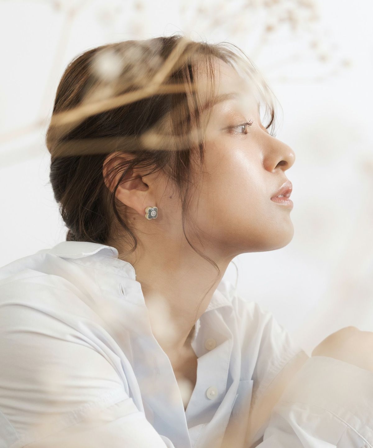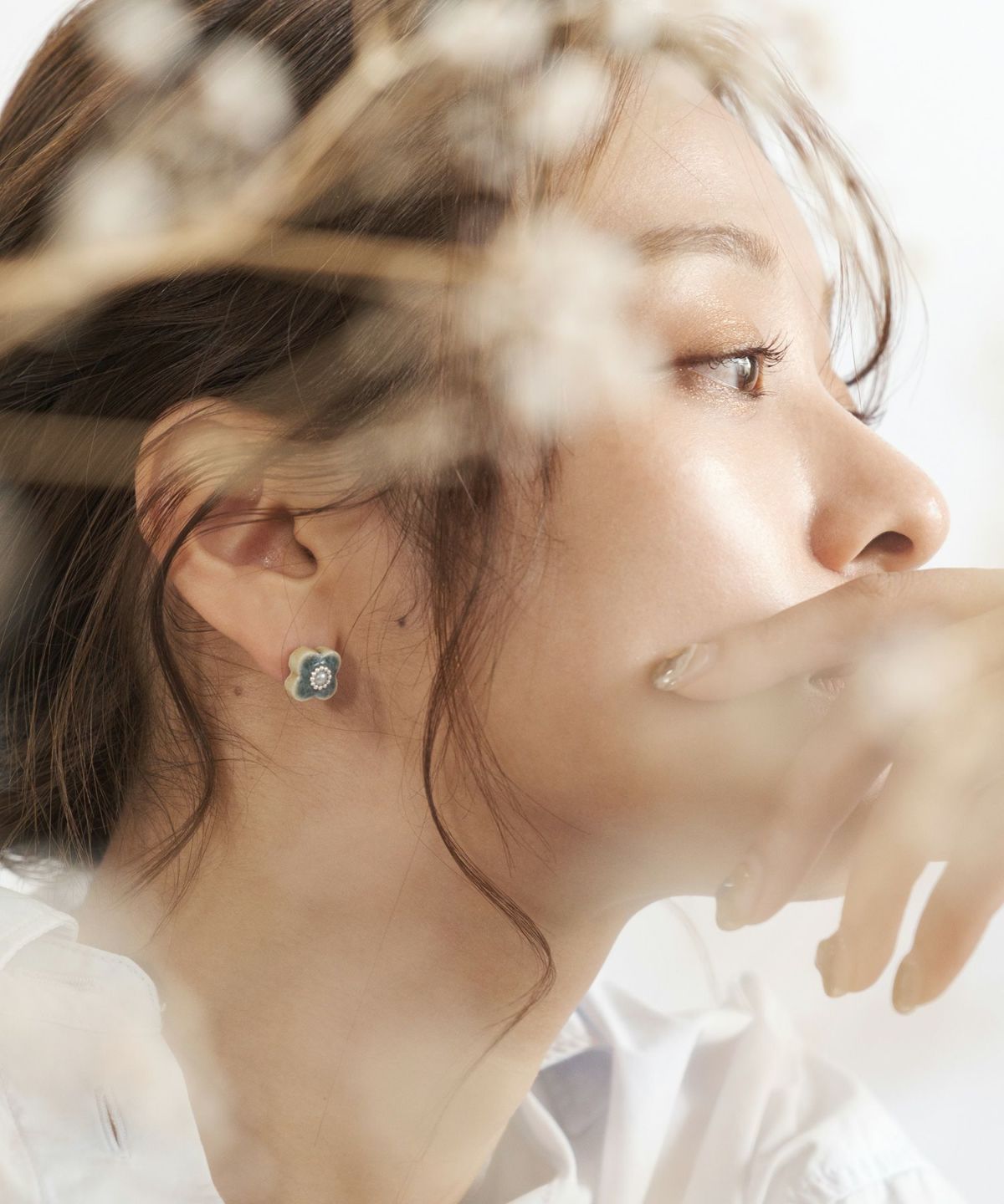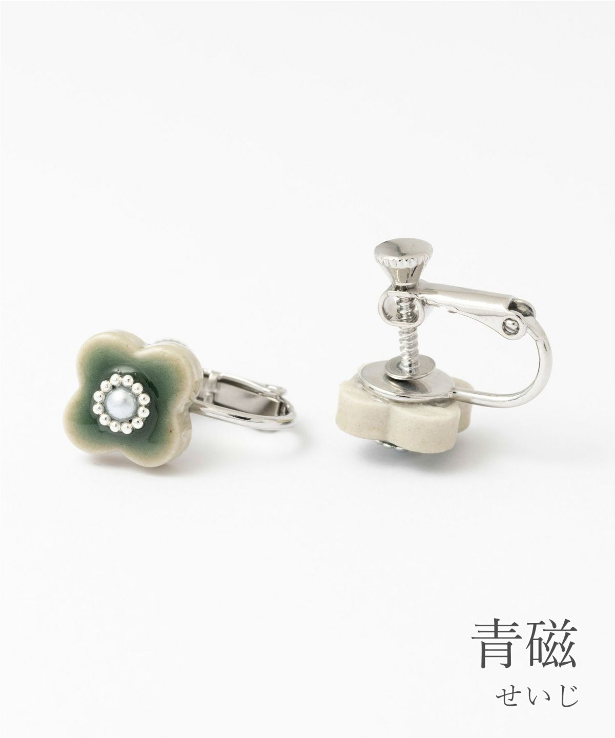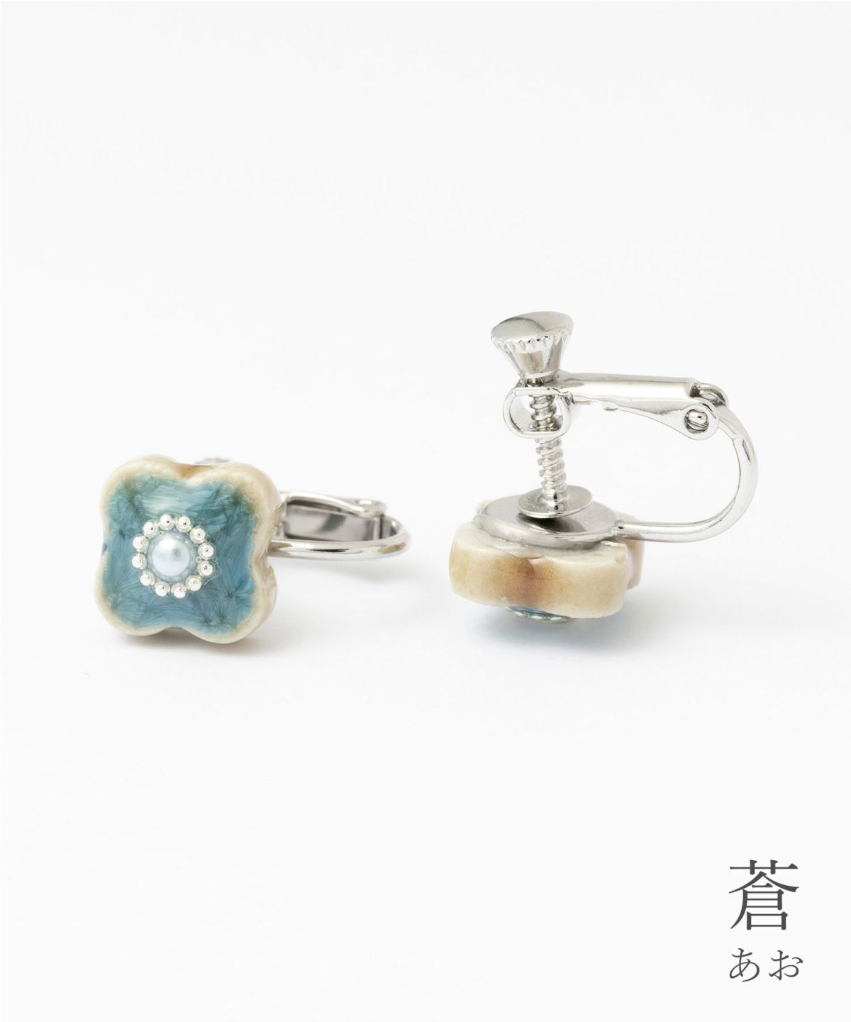 美濃焼陶器にパールとシルバーカラーの小粒ブリオンが輝くイヤリング。陶器ならではの釉薬の絶妙なカラー"青磁(せいじ)""蒼(あお)"が魅力のアイテムです。華やかな存在感は、普段使いだけでなく、パーティーシーンでも活躍。上品さをプラスした繊細なデザインもポイントです。