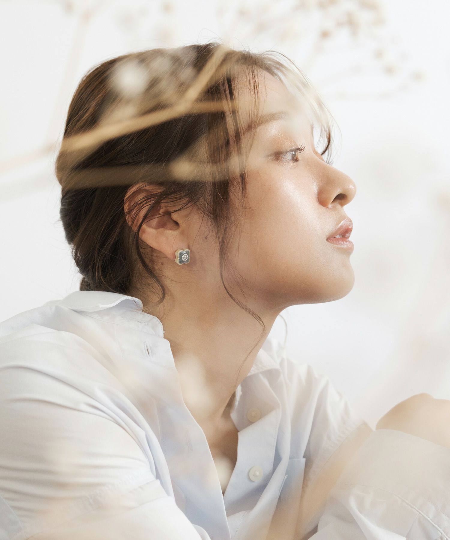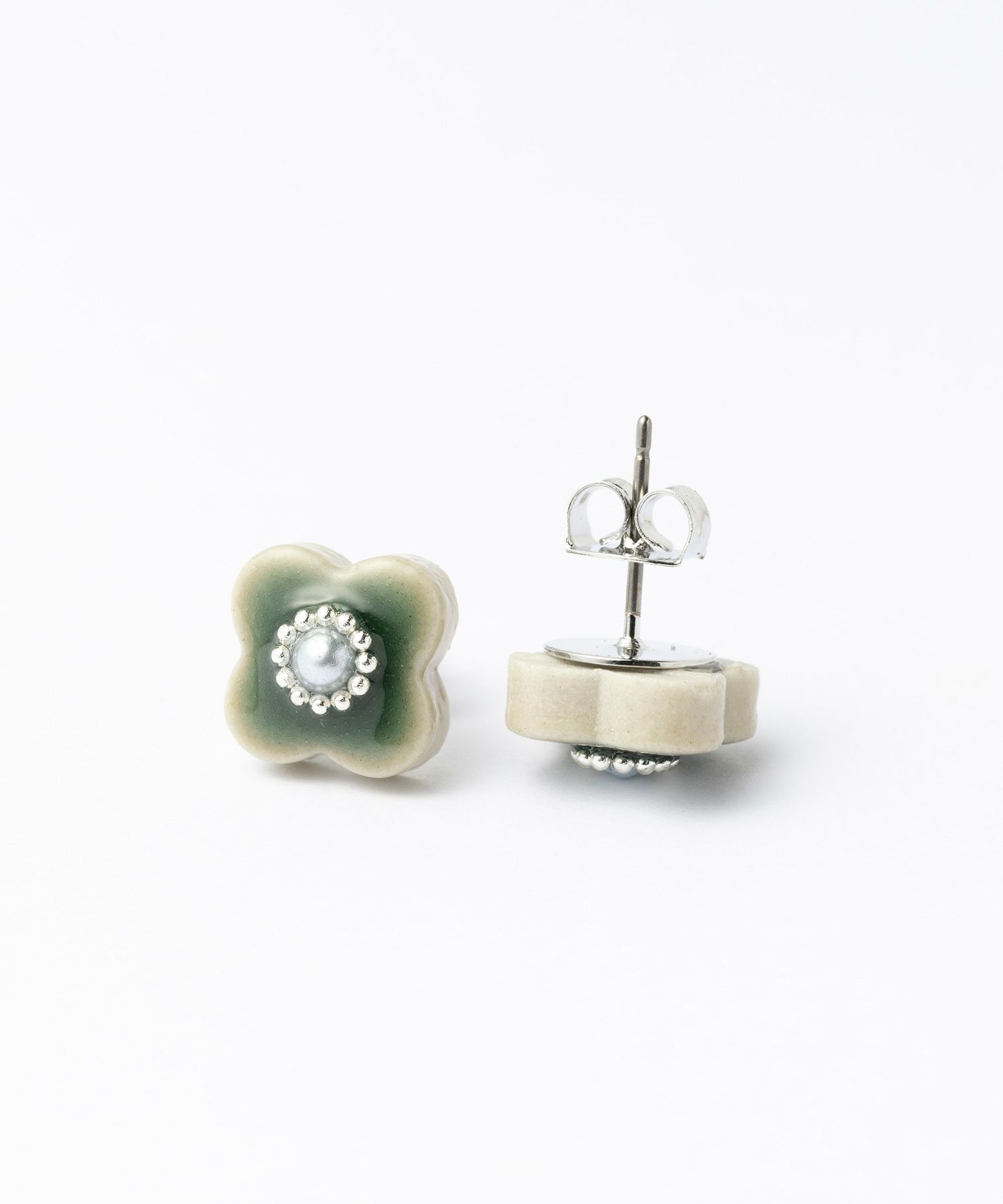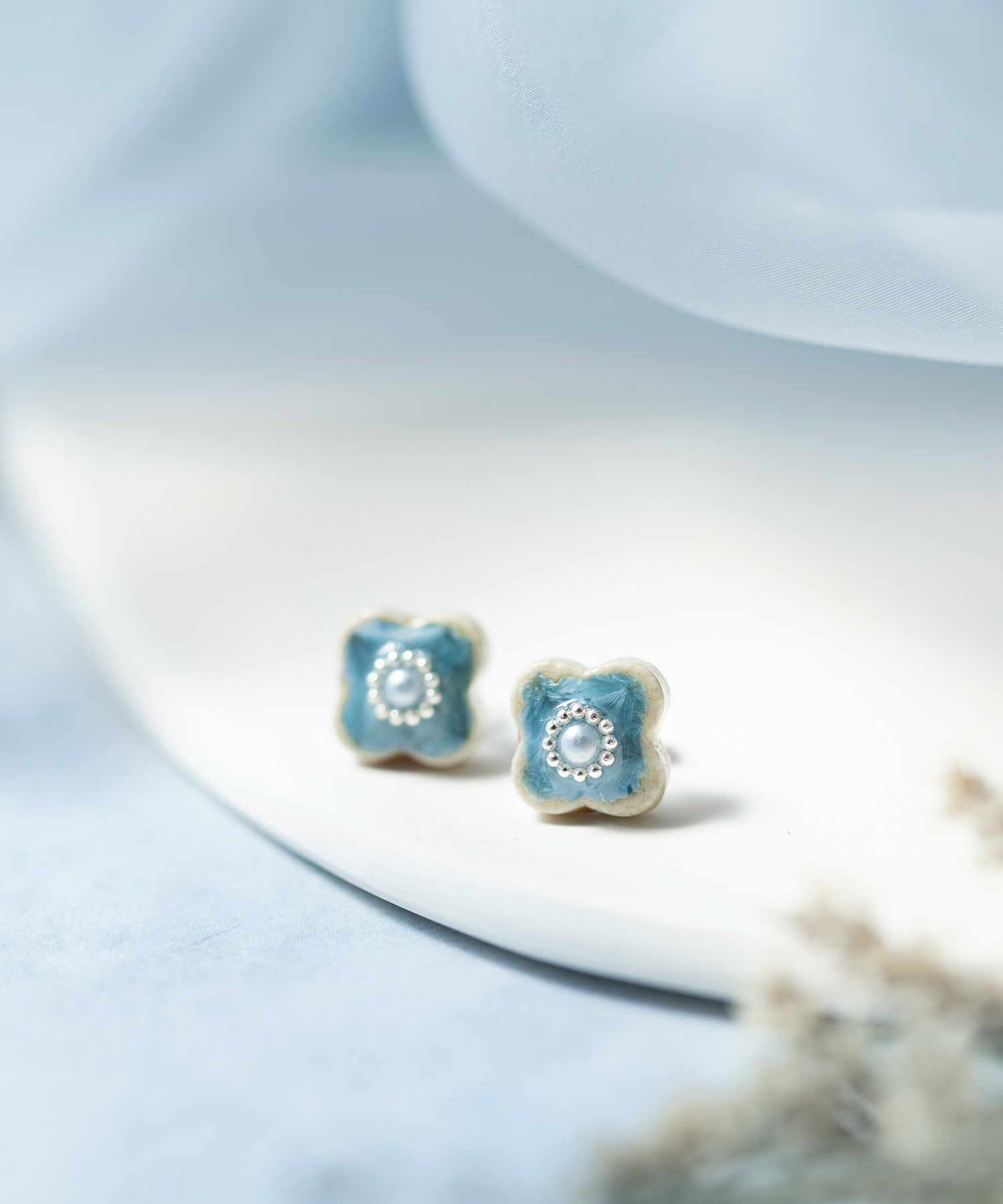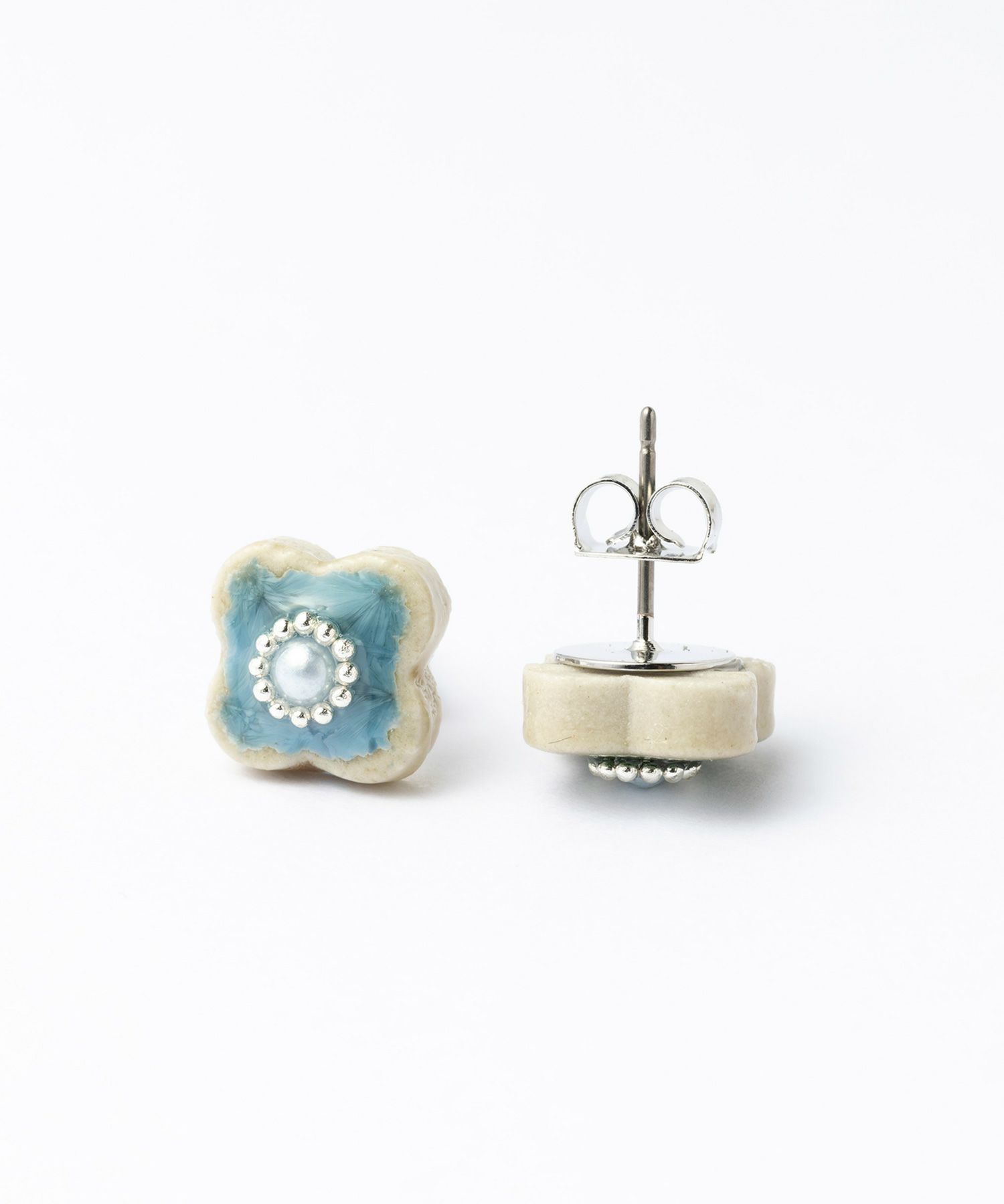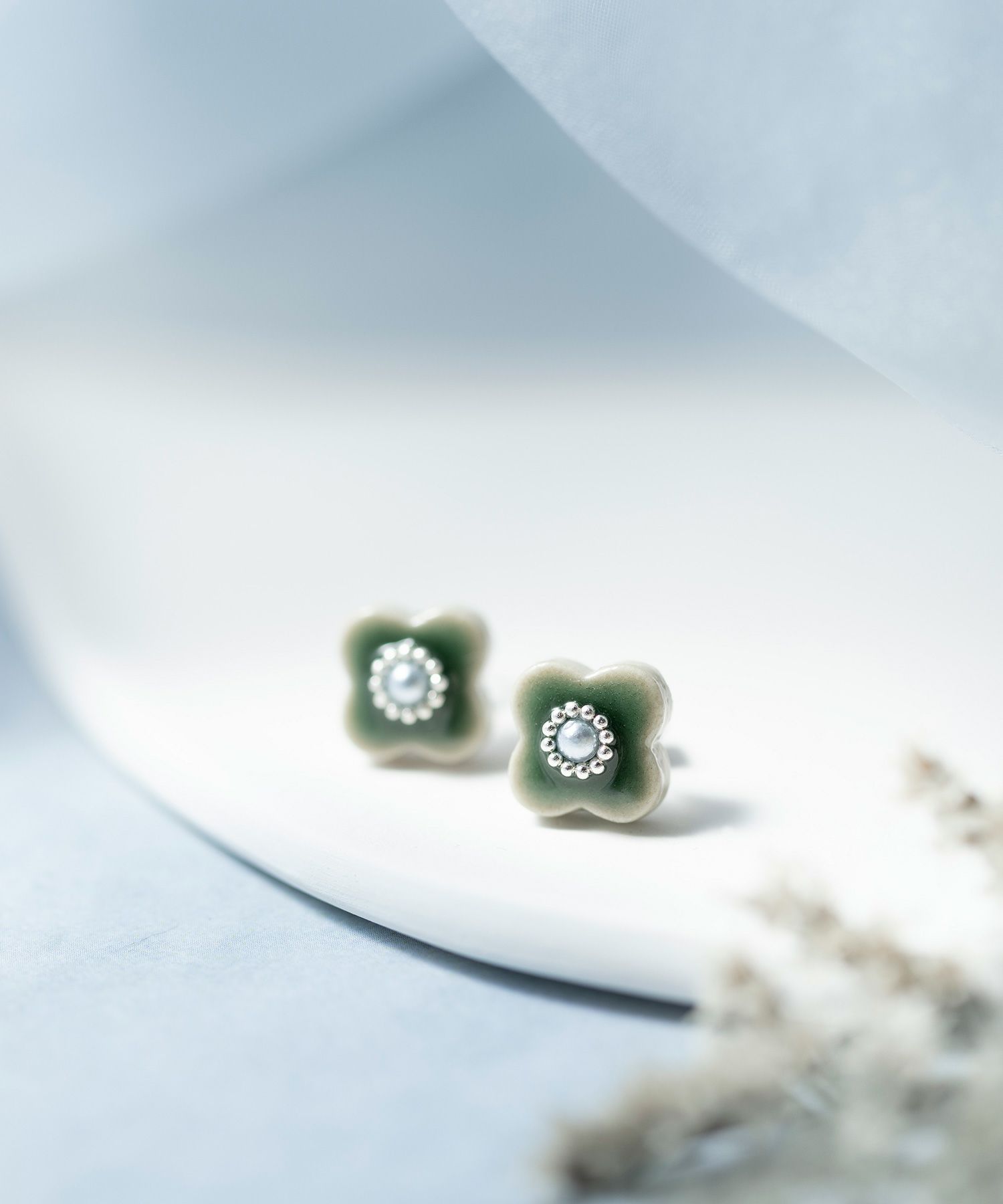 美濃焼陶器にパールとシルバーカラーの小粒ブリオンが輝くピアス。陶器ならではの釉薬の絶妙なカラー"青磁(せいじ)""蒼(あお)"が魅力のアイテムです。華やかな存在感は、普段使いだけでなく、パーティーシーンでも活躍。上品さをプラスした繊細なデザインもポイントです。