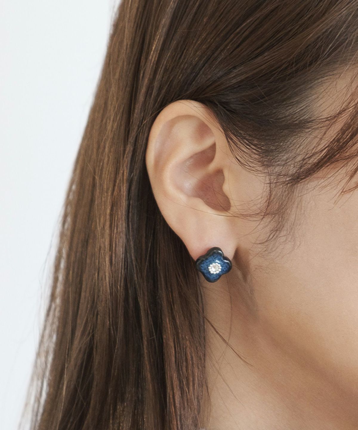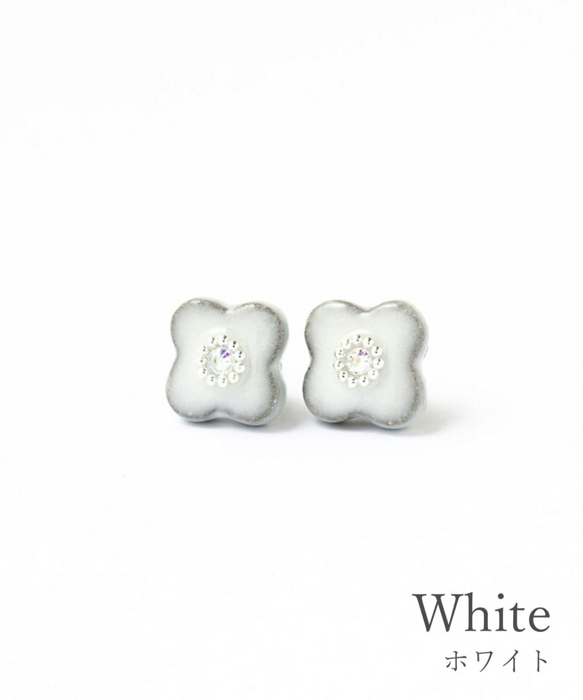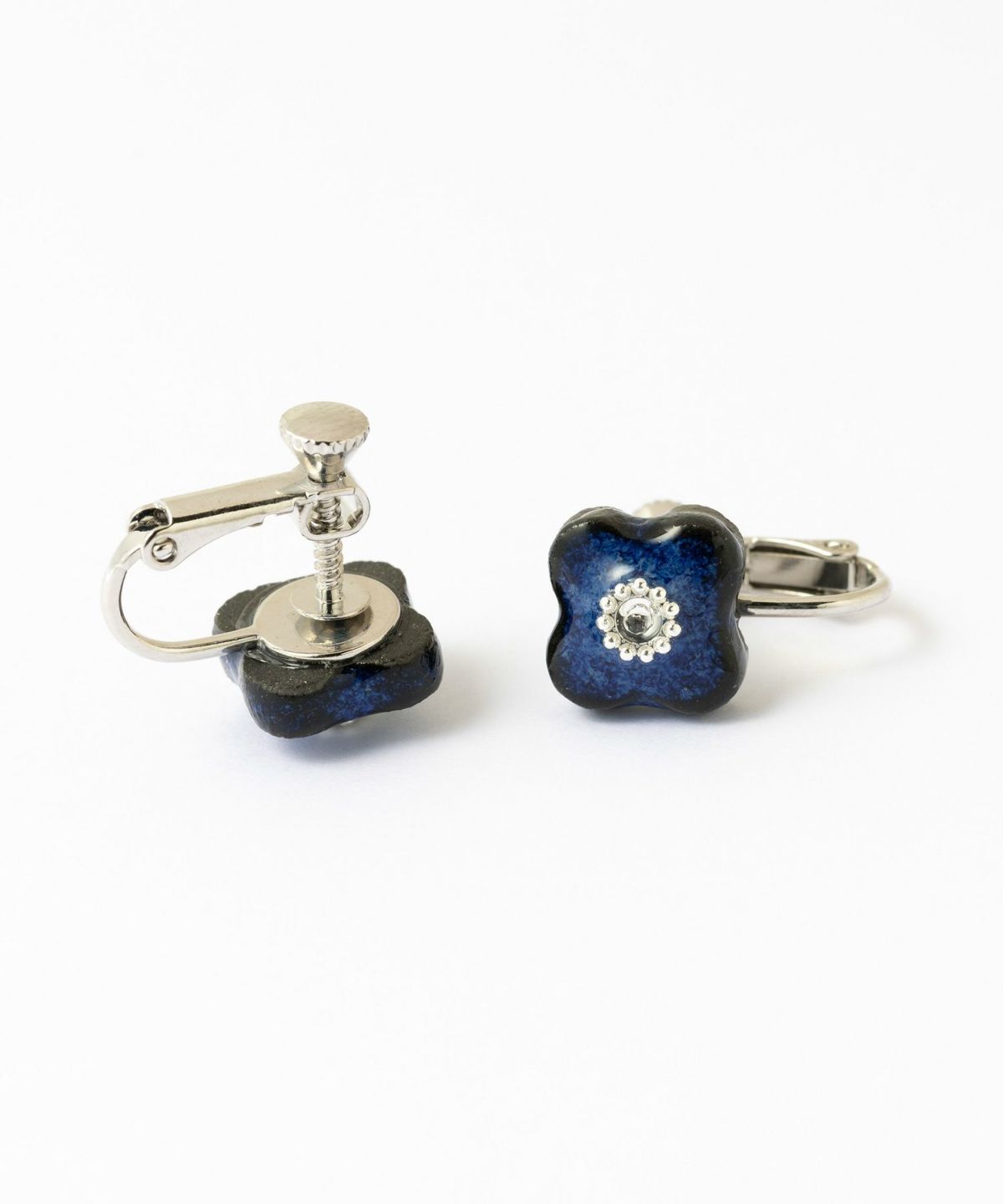 印象的な藍色の風合いが特徴の、MIKLEOのオリジナル陶器「tou(トウ)」ライン。 人気のフラワーモチーフイヤリング。中央にはスワロフスキークリスタルにシルバービジューをあしらい、さりげなく華やかに。