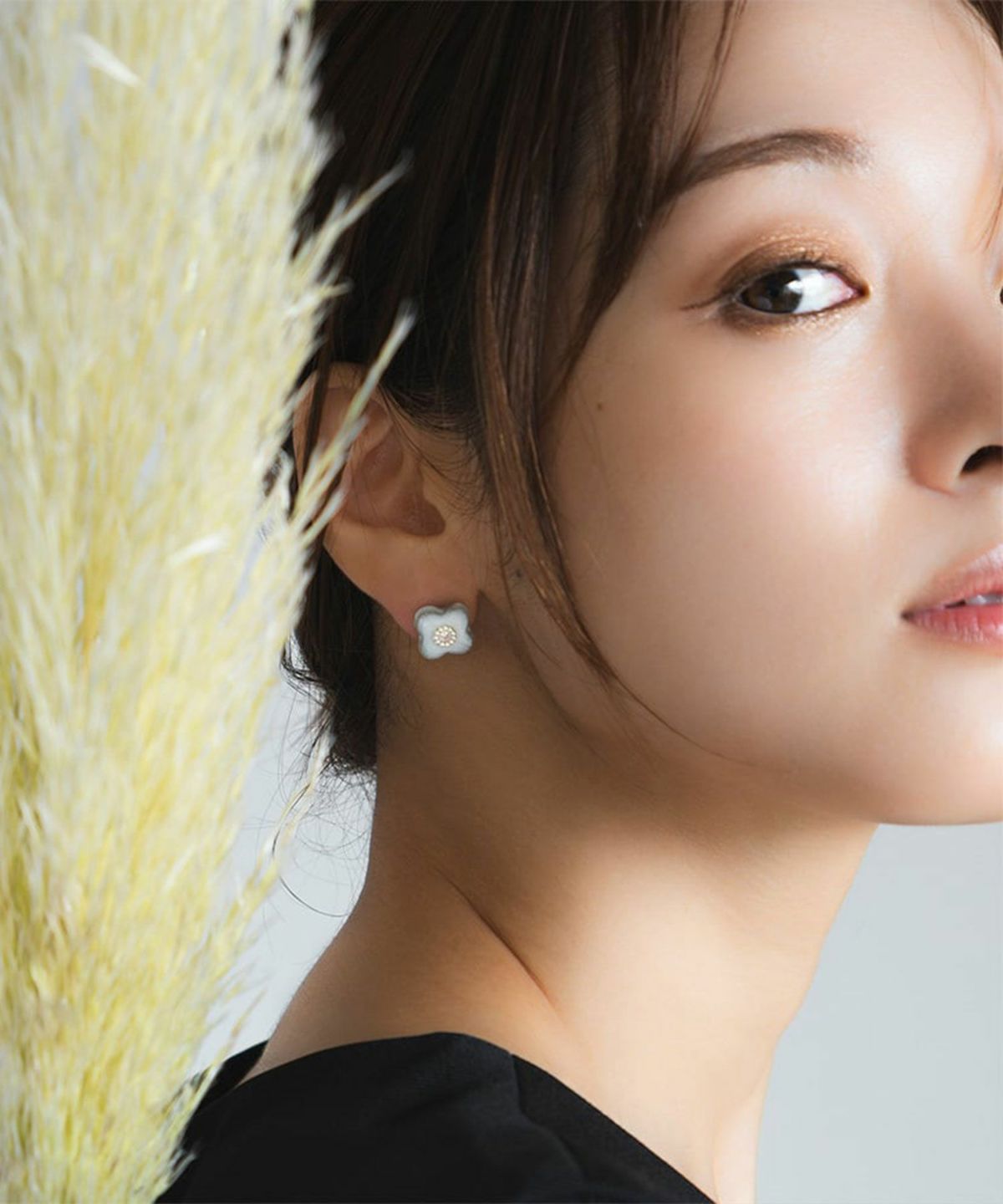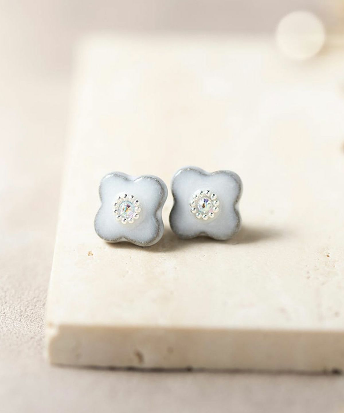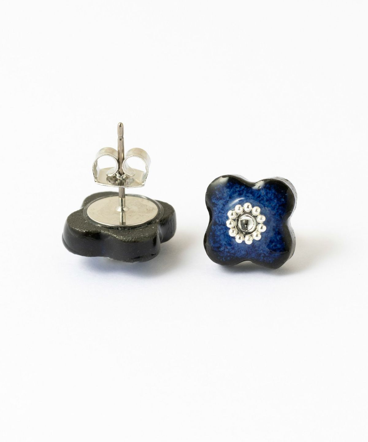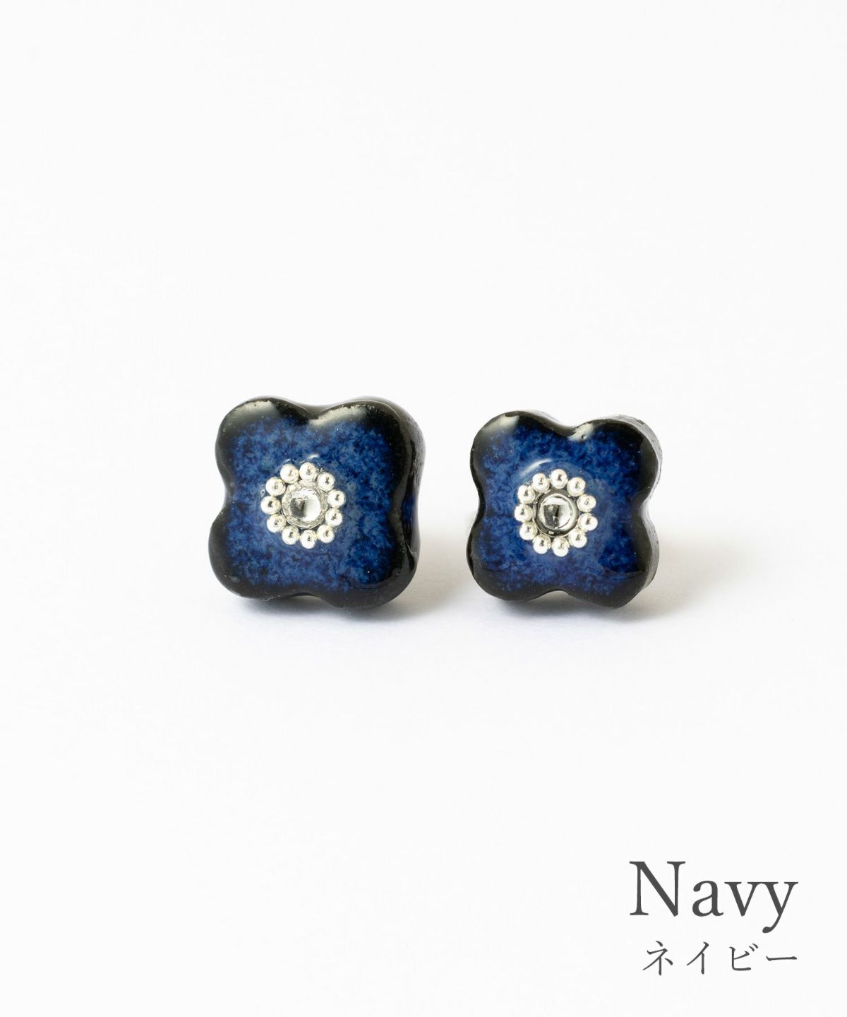 印象的な藍色の風合いが特徴の、MIKLEOのオリジナル陶器「tou(トウ)」ライン。 人気のフラワーモチーフイヤリング。中央にはスワロフスキークリスタルにシルバービジューをあしらい、さりげなく華やかに。
