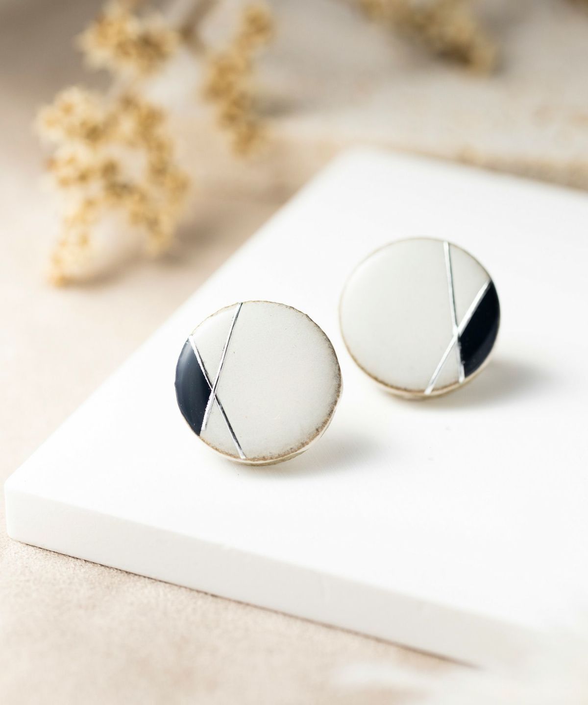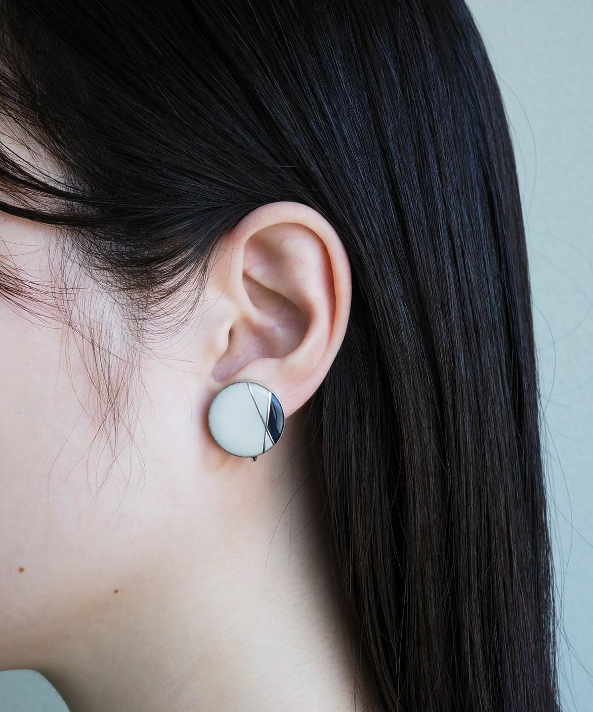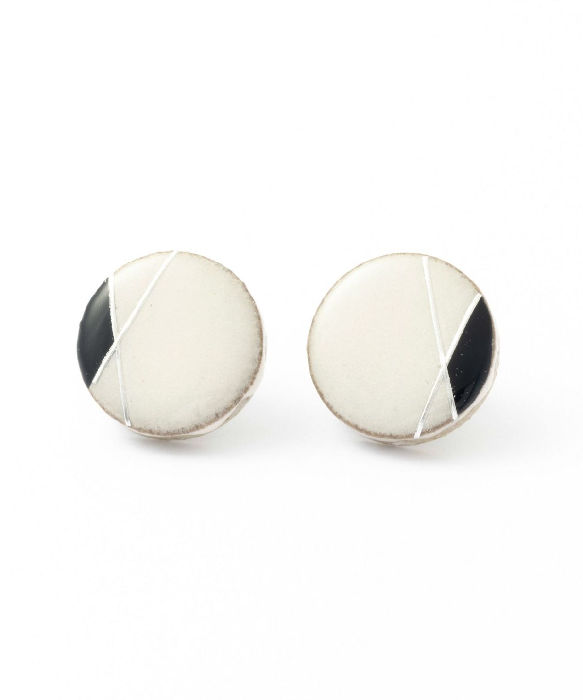 美濃焼陶器に直線的で幾何学的な模様をデザインしたラインデコシリーズのイヤリング。 陶器の温かみにラインの幾何学模様のシャープさをプラス。メタリックなシルバーラインにワンポイントネイビーを添えて。