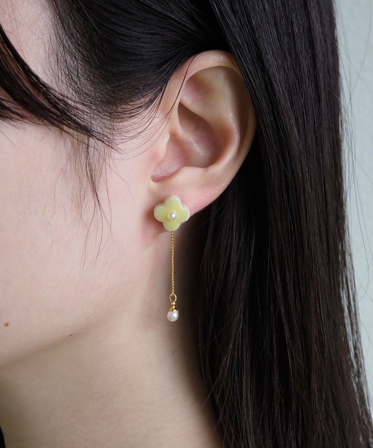 陶器のお花と揺れるパールがフェミニンなピアス。パールが付いたチェーンはゆらゆら揺れて顔回りを華やかにしてくれます。主張しすぎないサイズ感でちょっとしたお出かけにも、パーティーにも着けていただけます。存在感のあるデザインなので、普段のコーディネートに取り入れて大人のお洒落を楽しめます。ペアピアス(両耳用)です。
