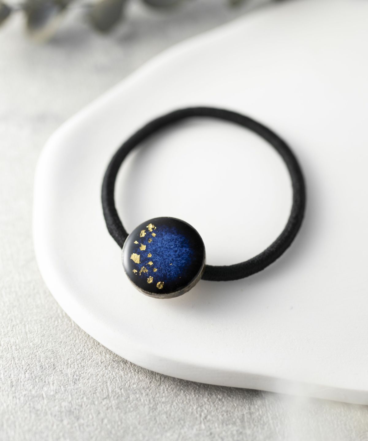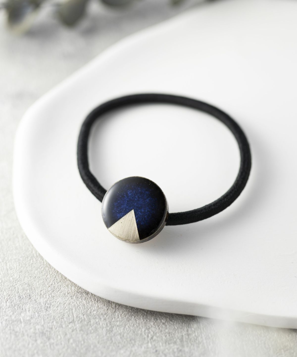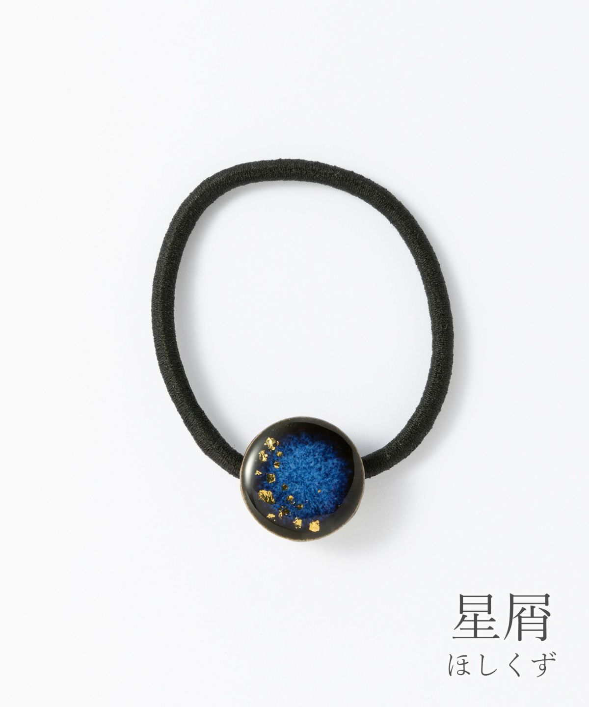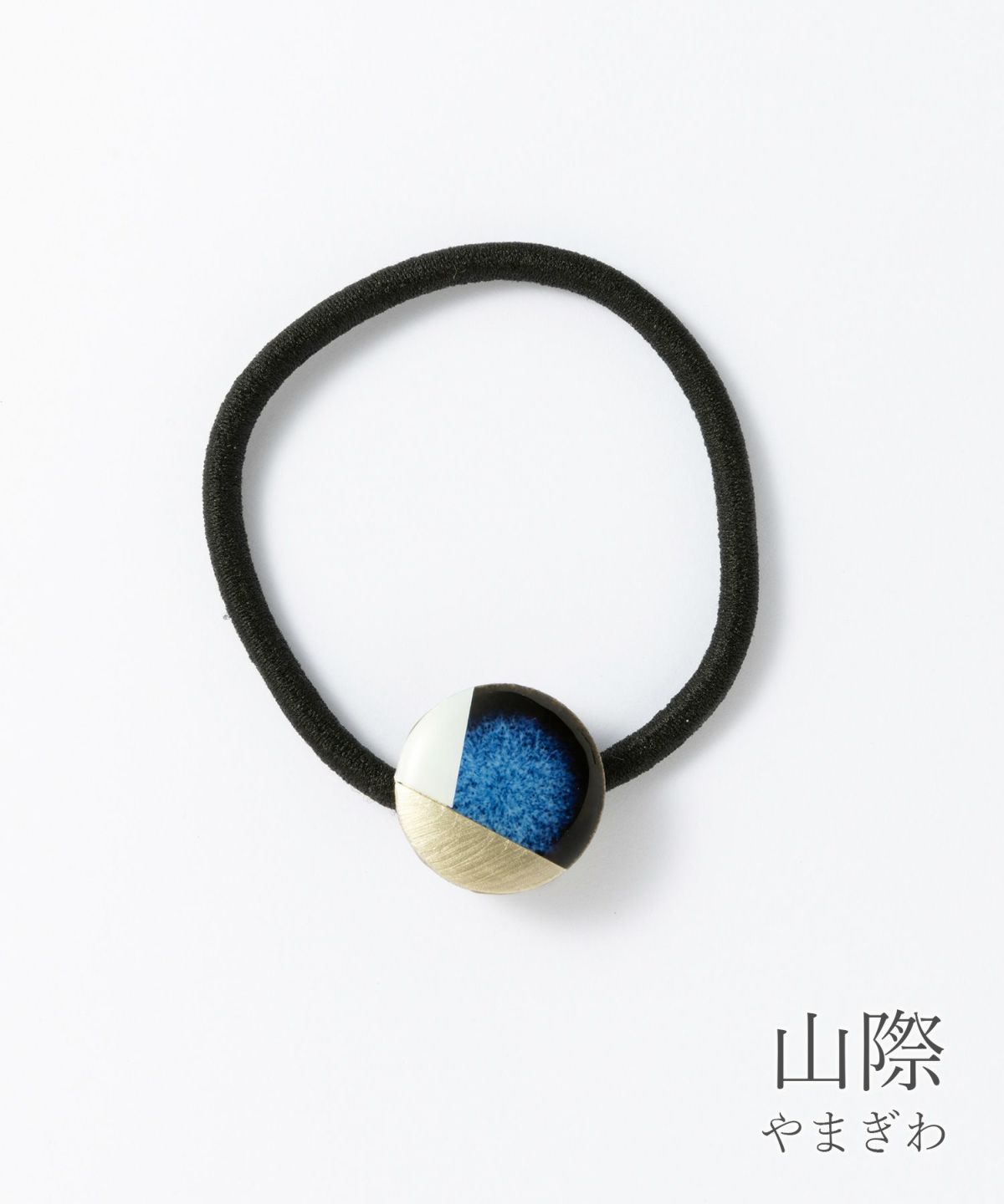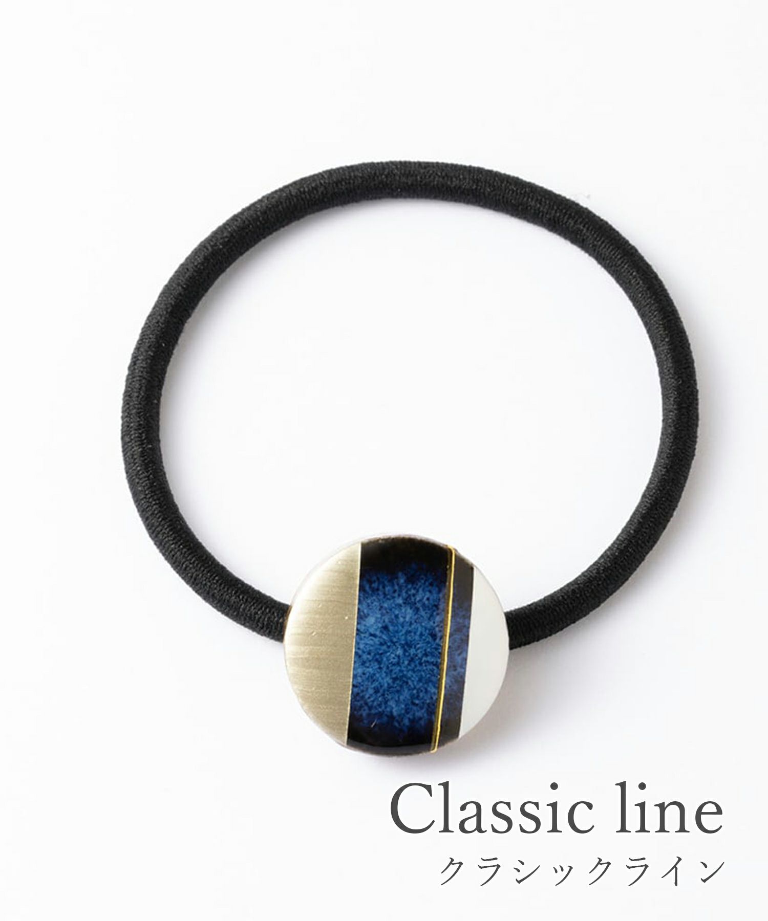 伝統工芸品、美濃焼陶器のヘアゴムです。 藍色にゴールドのアクセントが知的で女性らしい印象に。シンプルな色使いが普段使いにも取り入れやすく、存在感もあるのでパーティーシーンにも活躍してくれます。