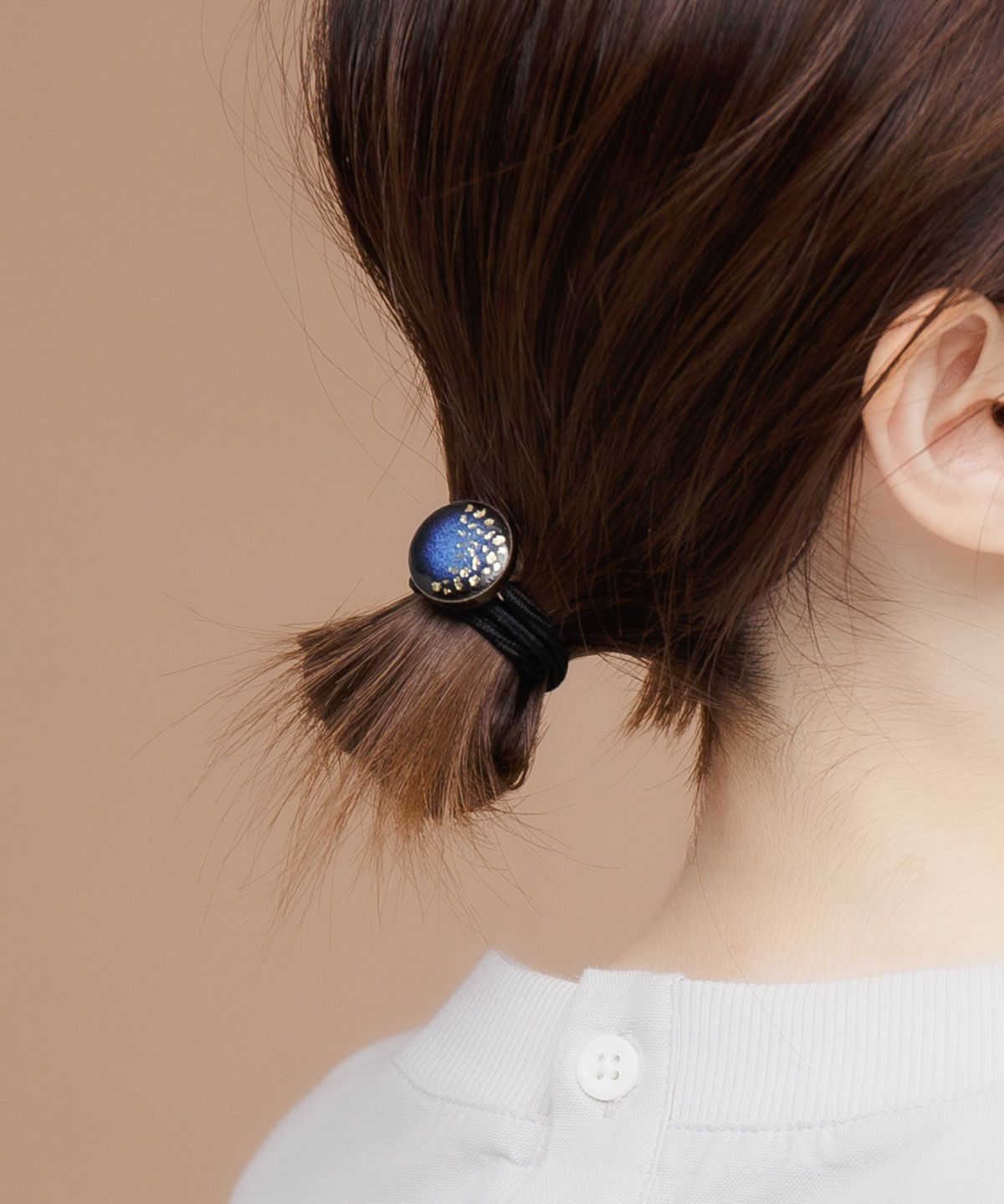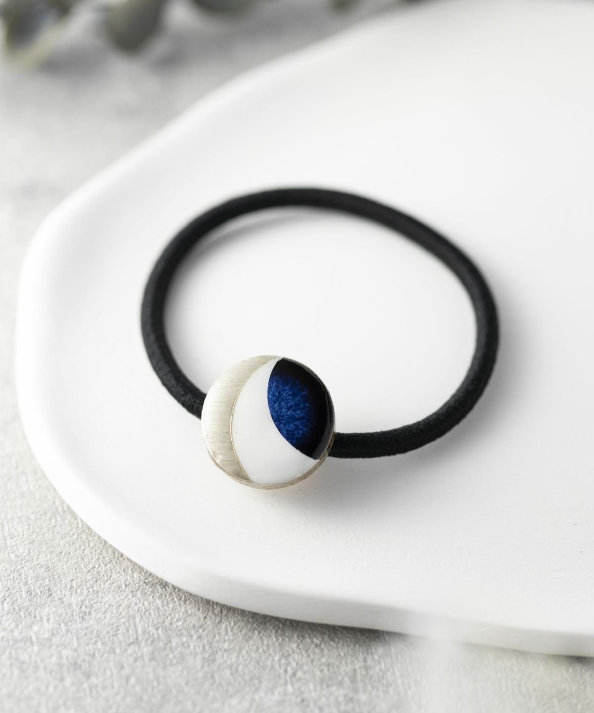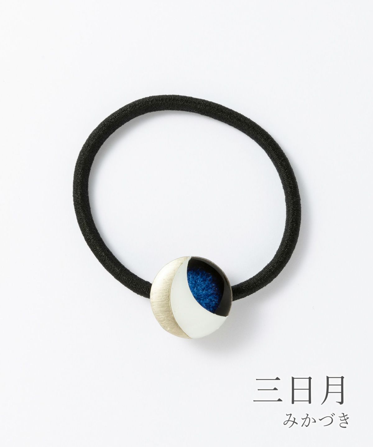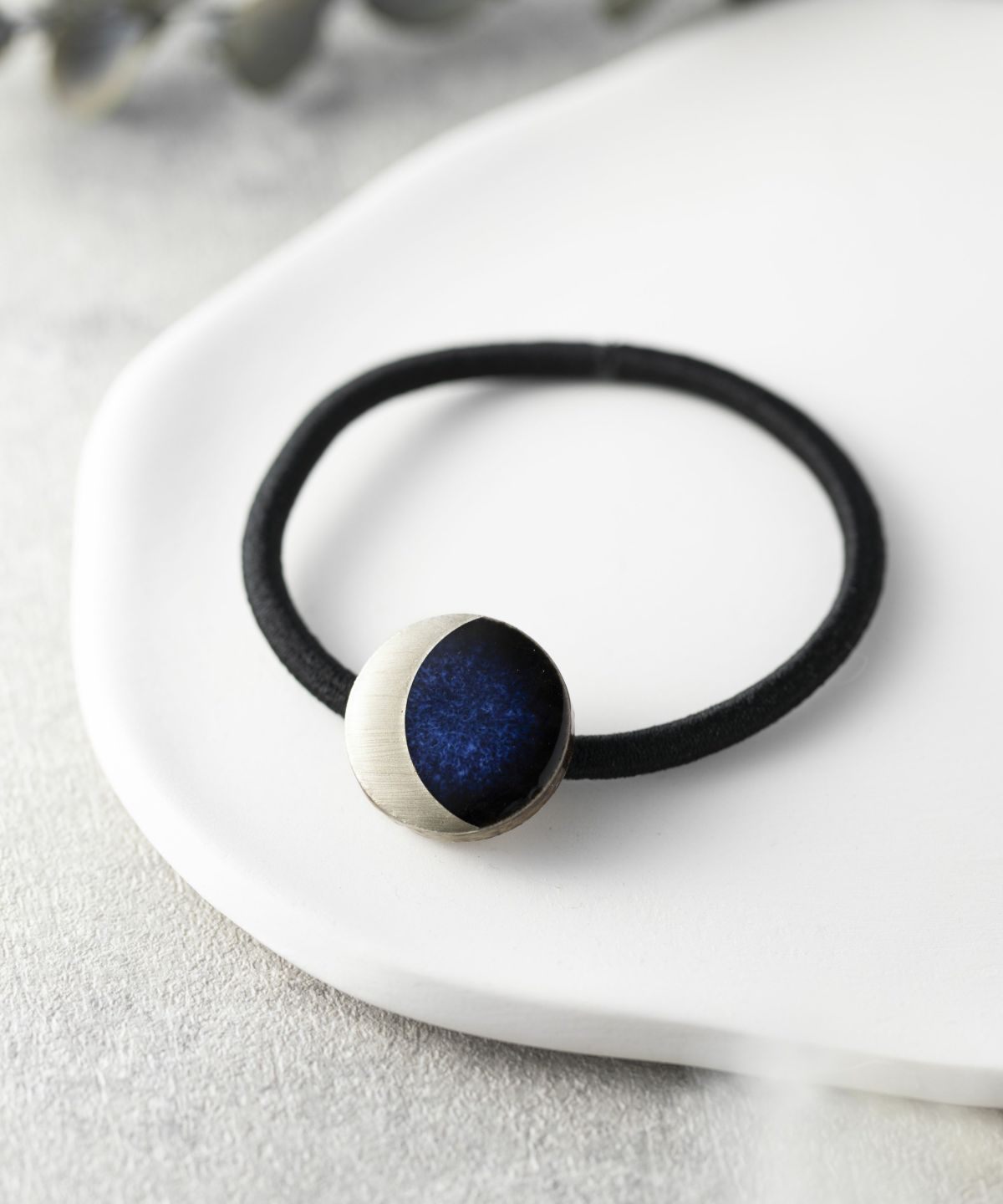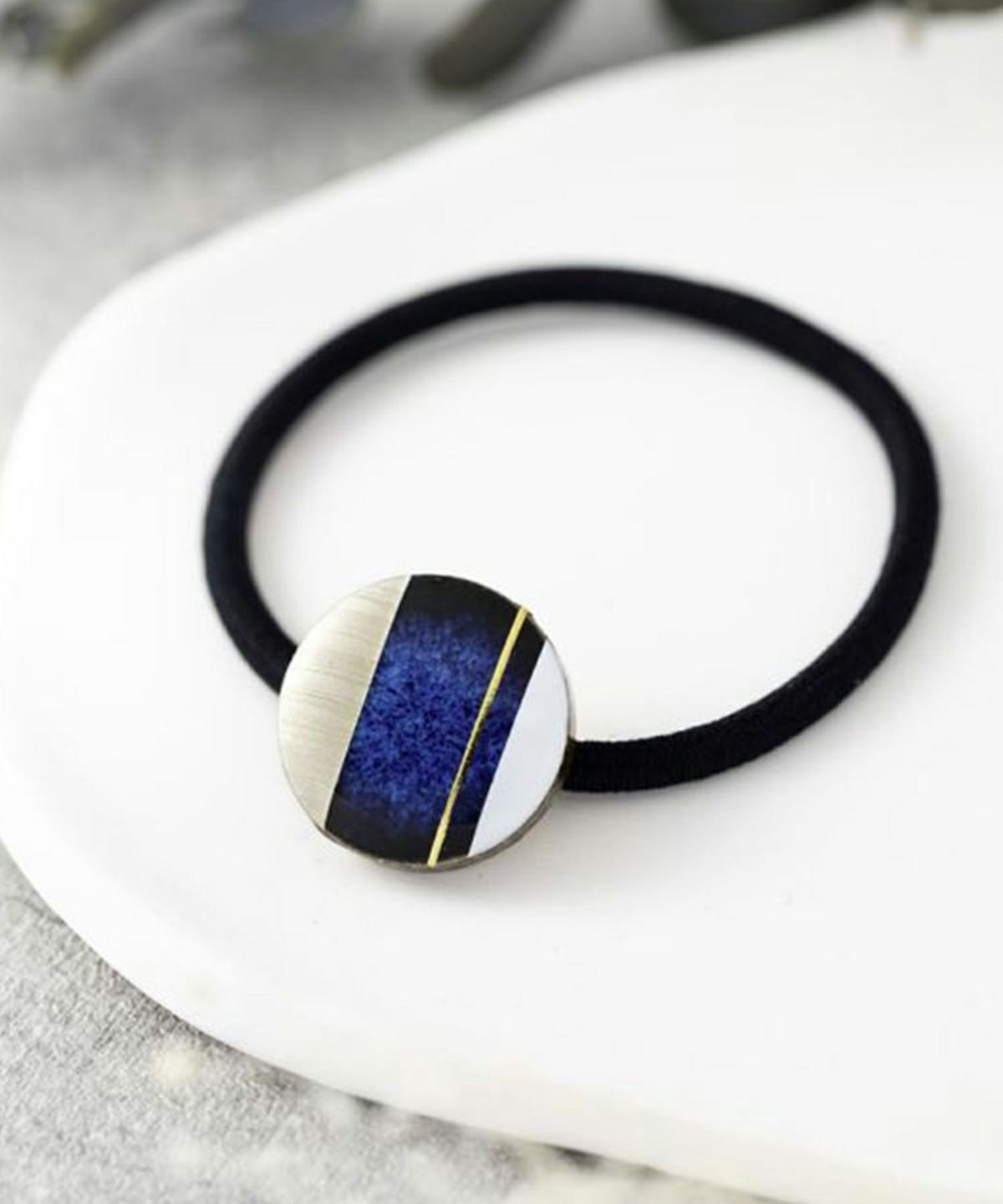 伝統工芸品、美濃焼陶器のヘアゴムです。 藍色にゴールドのアクセントが知的で女性らしい印象に。シンプルな色使いが普段使いにも取り入れやすく、存在感もあるのでパーティーシーンにも活躍してくれます。