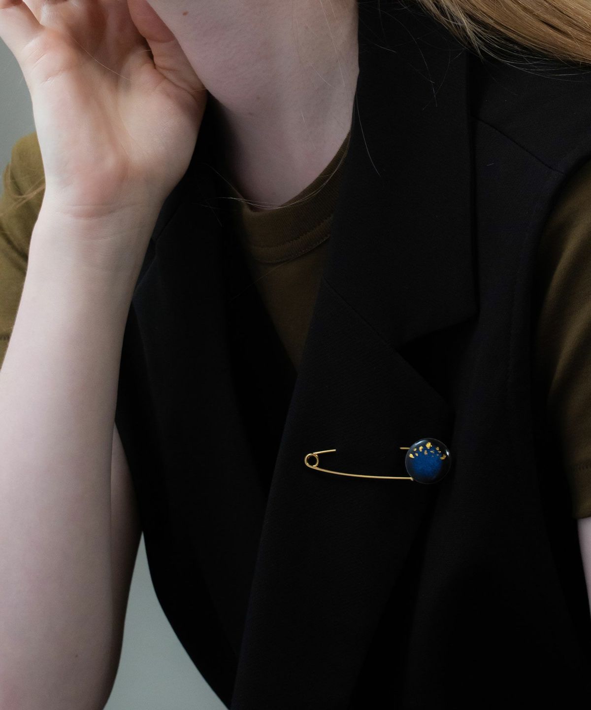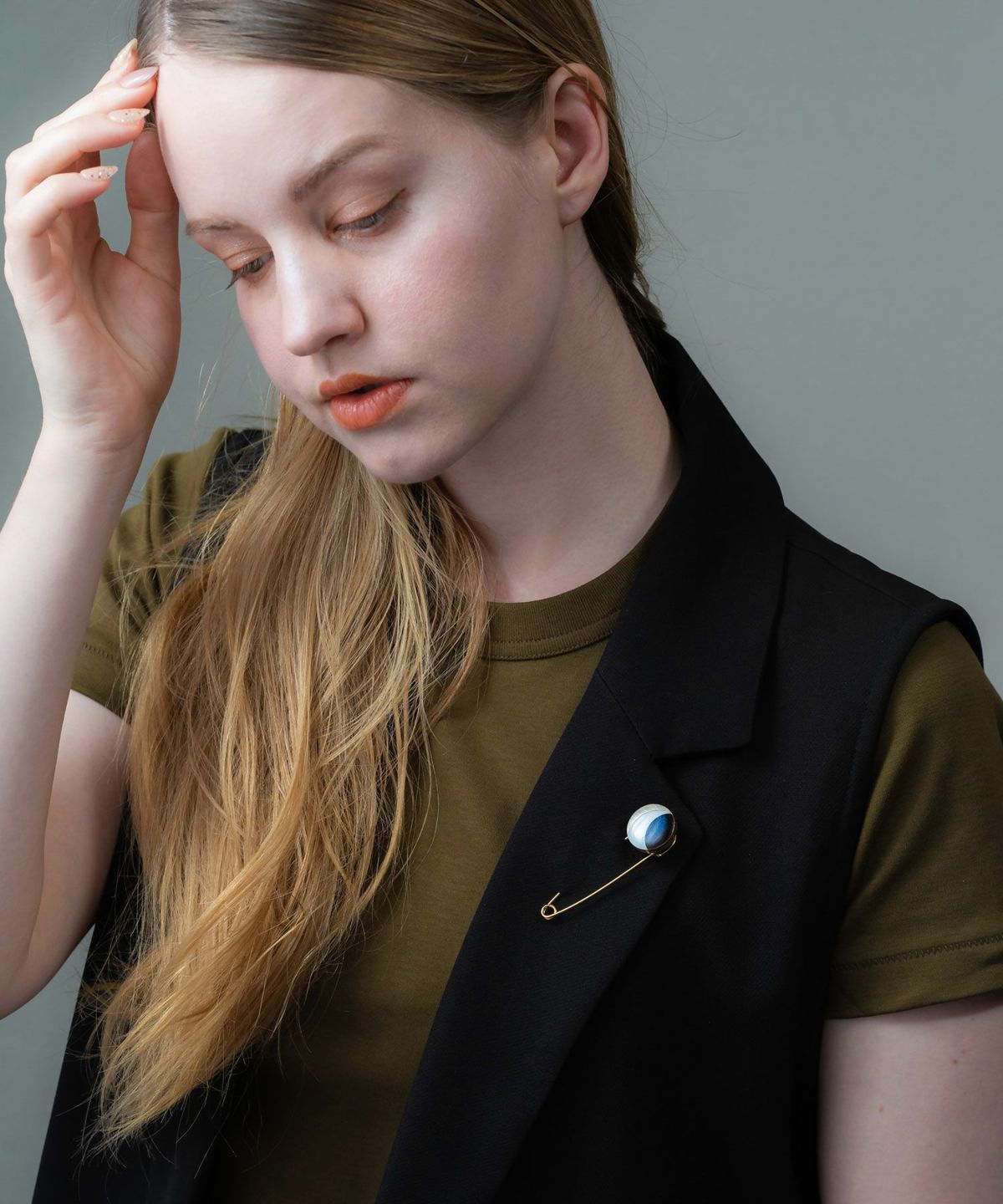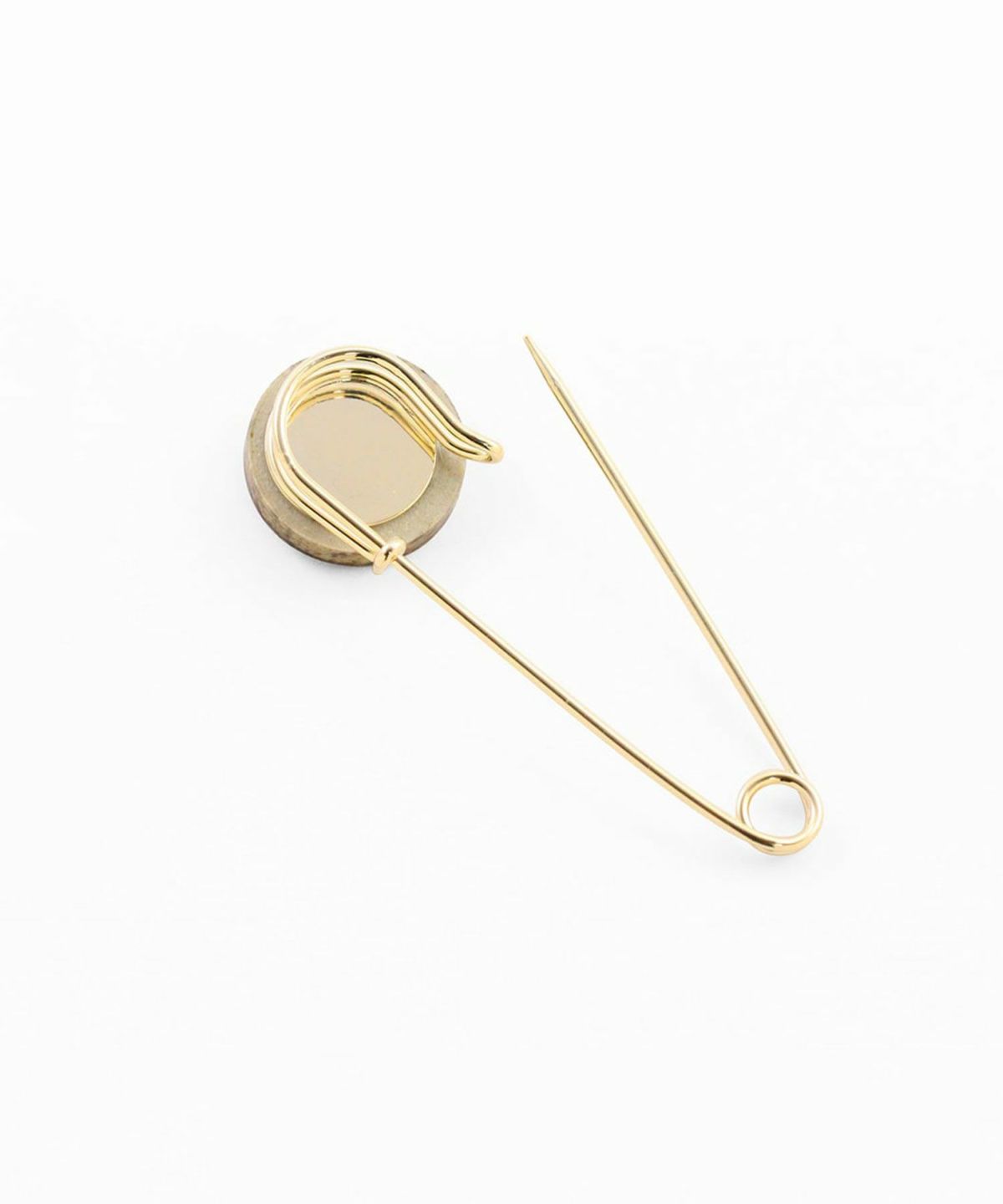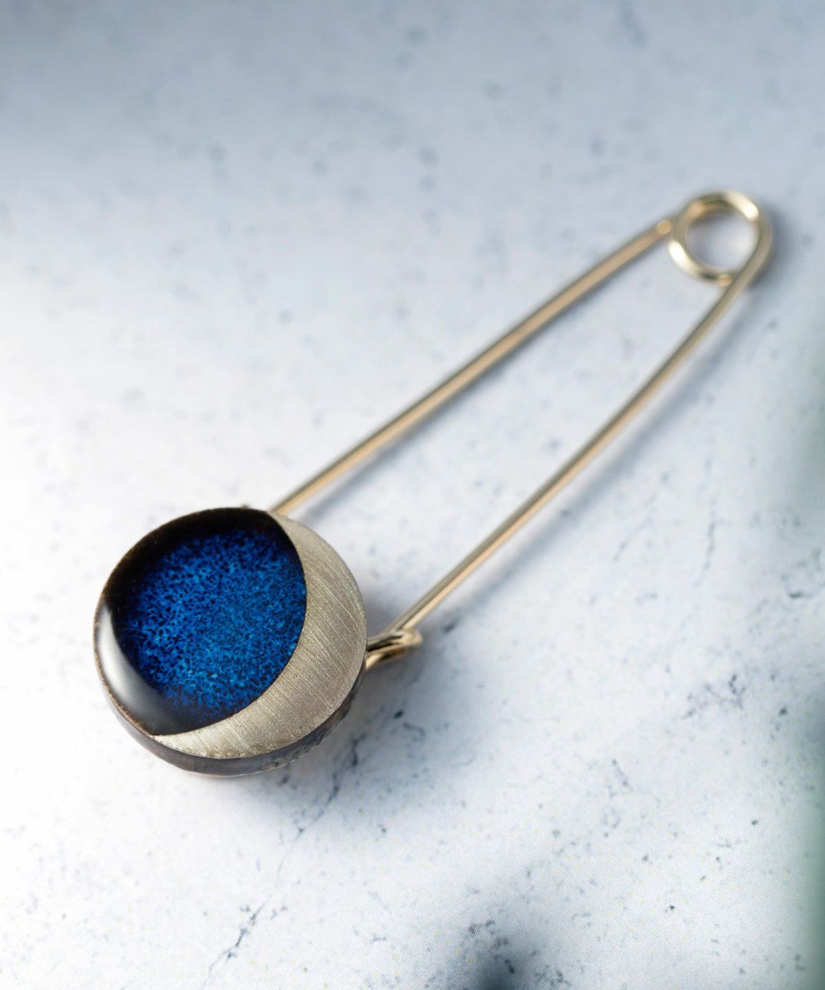 陶器のぬくもりが感じられる、美濃焼陶器のブローチです。 藍色にゴールドのアクセントが知的で女性らしい印象に。シンプルな色使いが普段使いにも取り入れやすく、存在感もあるのでパーティーシーンにも活躍してくれます。