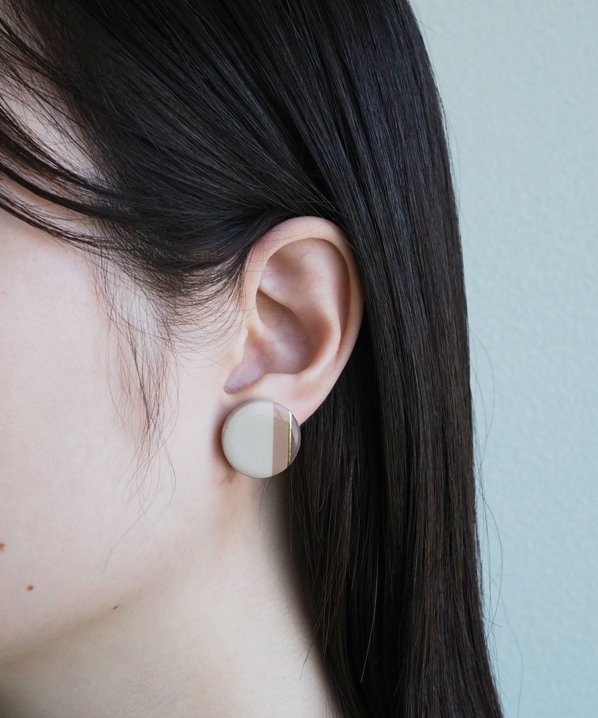 陶器のアクセサリーブランド"MIKELO"とMUKがコラボ企画した別注アイテムです。MIKELOの高級感あふれるデザインとMUKのコンセプトカラーが融合し、上品で柔らかな雰囲気に仕上がりました。ダスティホワイトの陶器にフレンチクラシカルのテイストをプラス。どんなスタイルにも合わせやすく、ワンランク上の装いに。