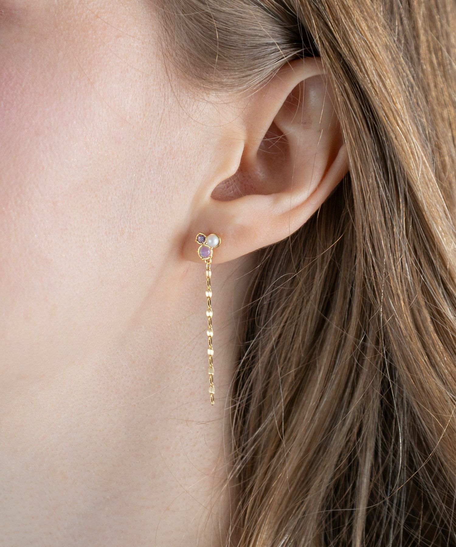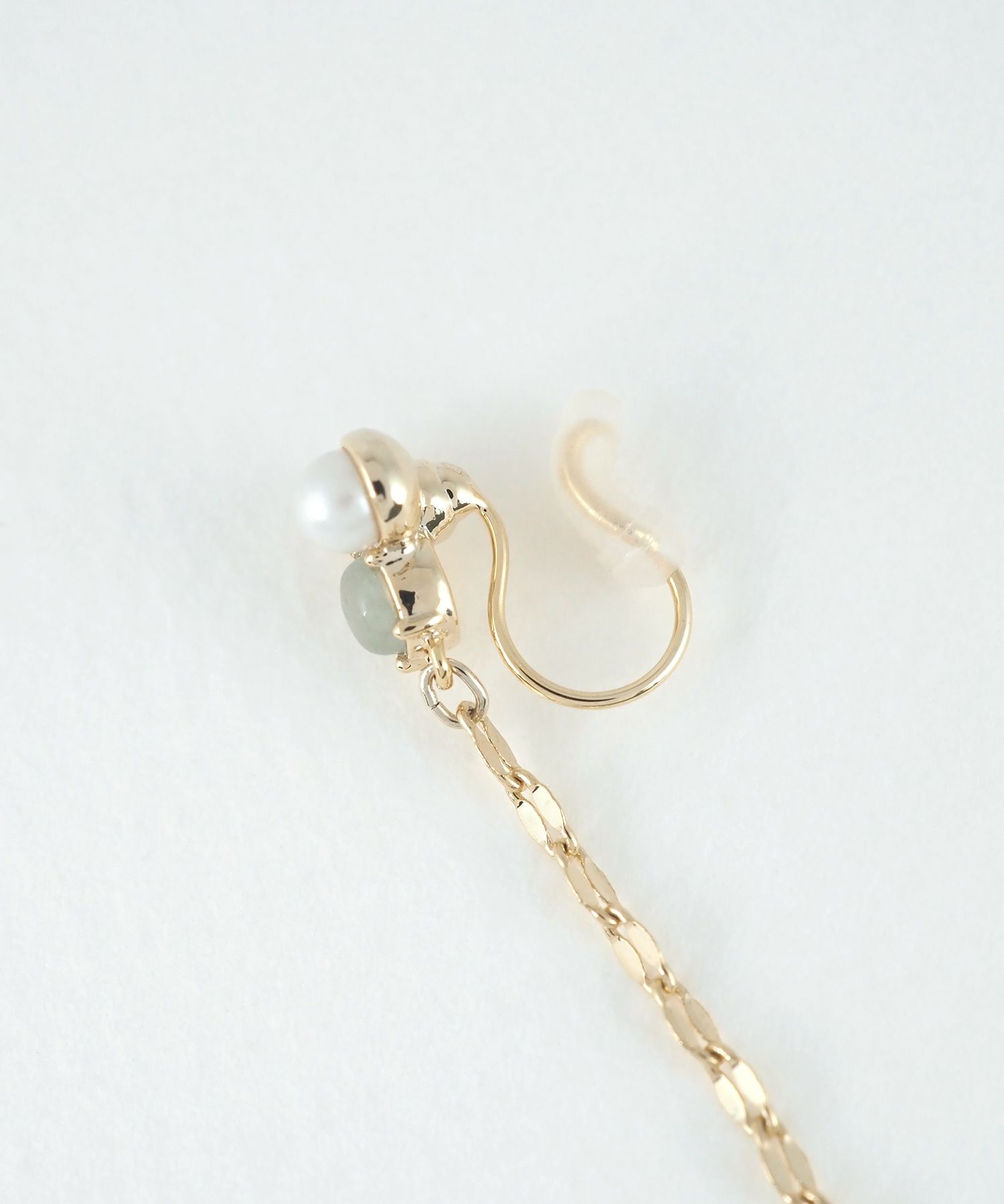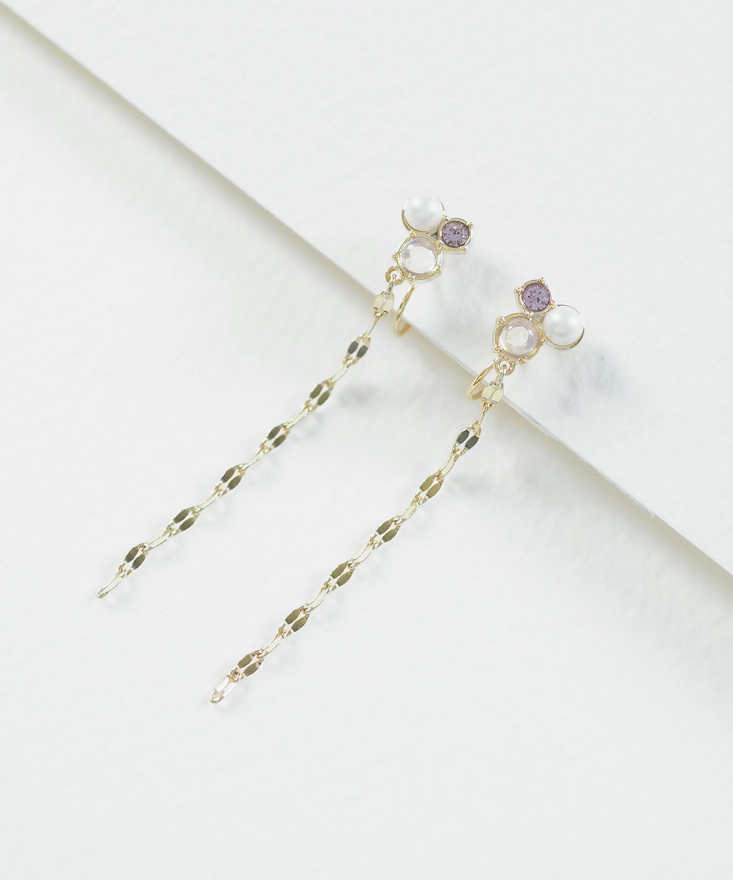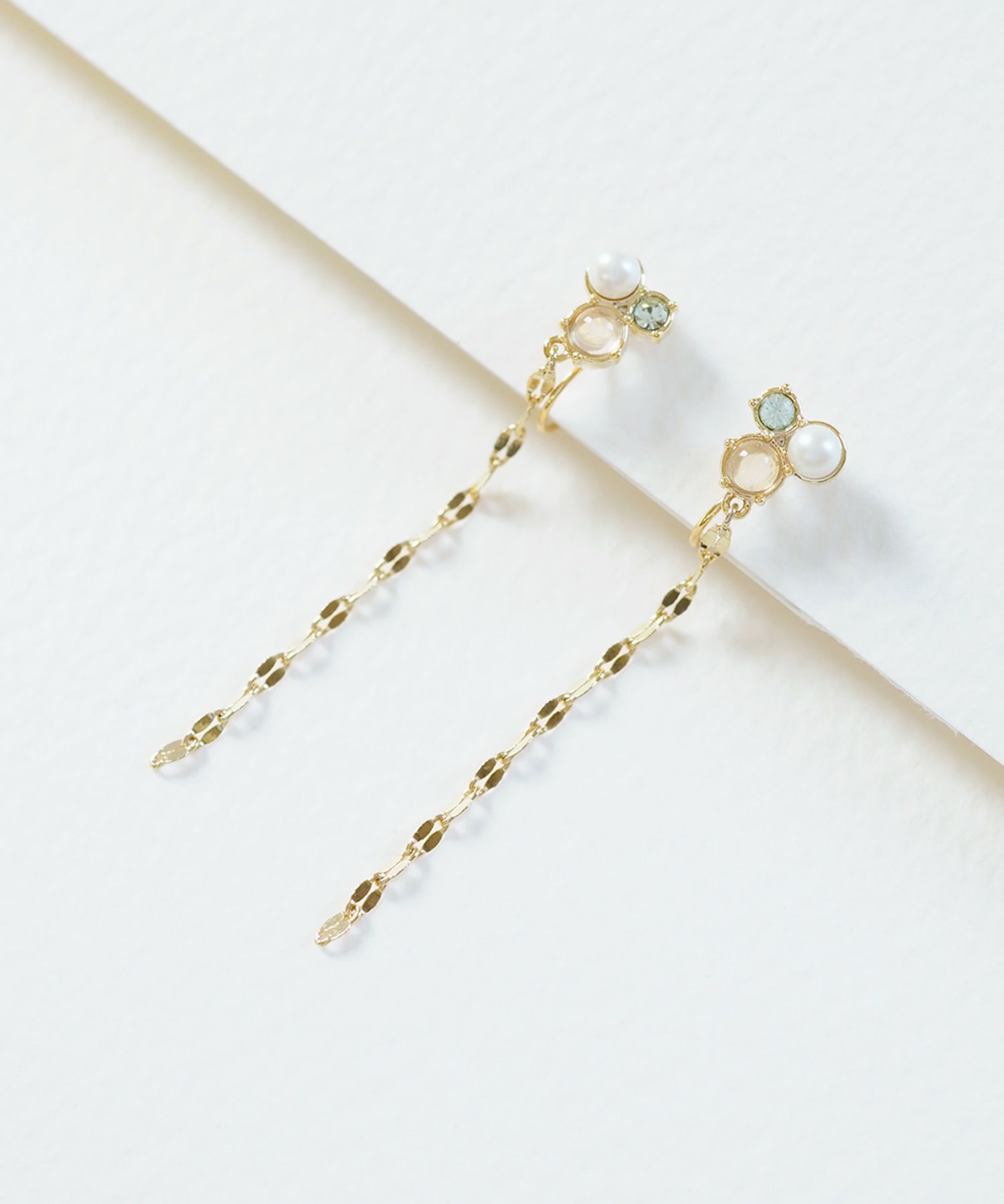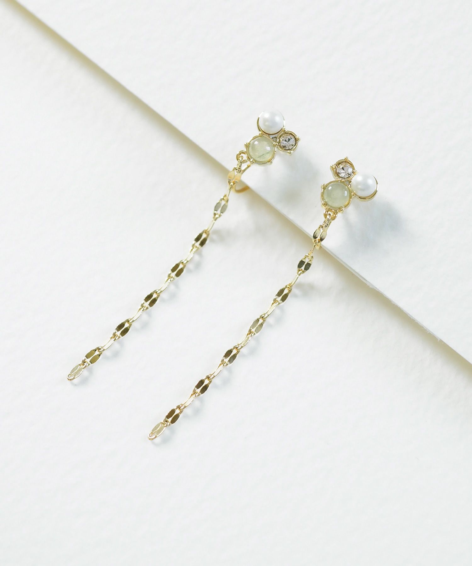天然石の持つ運気を纏う、お守りアクセサリーシリーズ“MUK Dreamy stone”。優しい色合いの天然石、パール、ストーンがあしらわれた上品なデザインのイヤリング。ペタルチェーンが動きに合わせてきらめき、お顔周りを華やかに彩ります。プレゼント用にもおすすめです。
