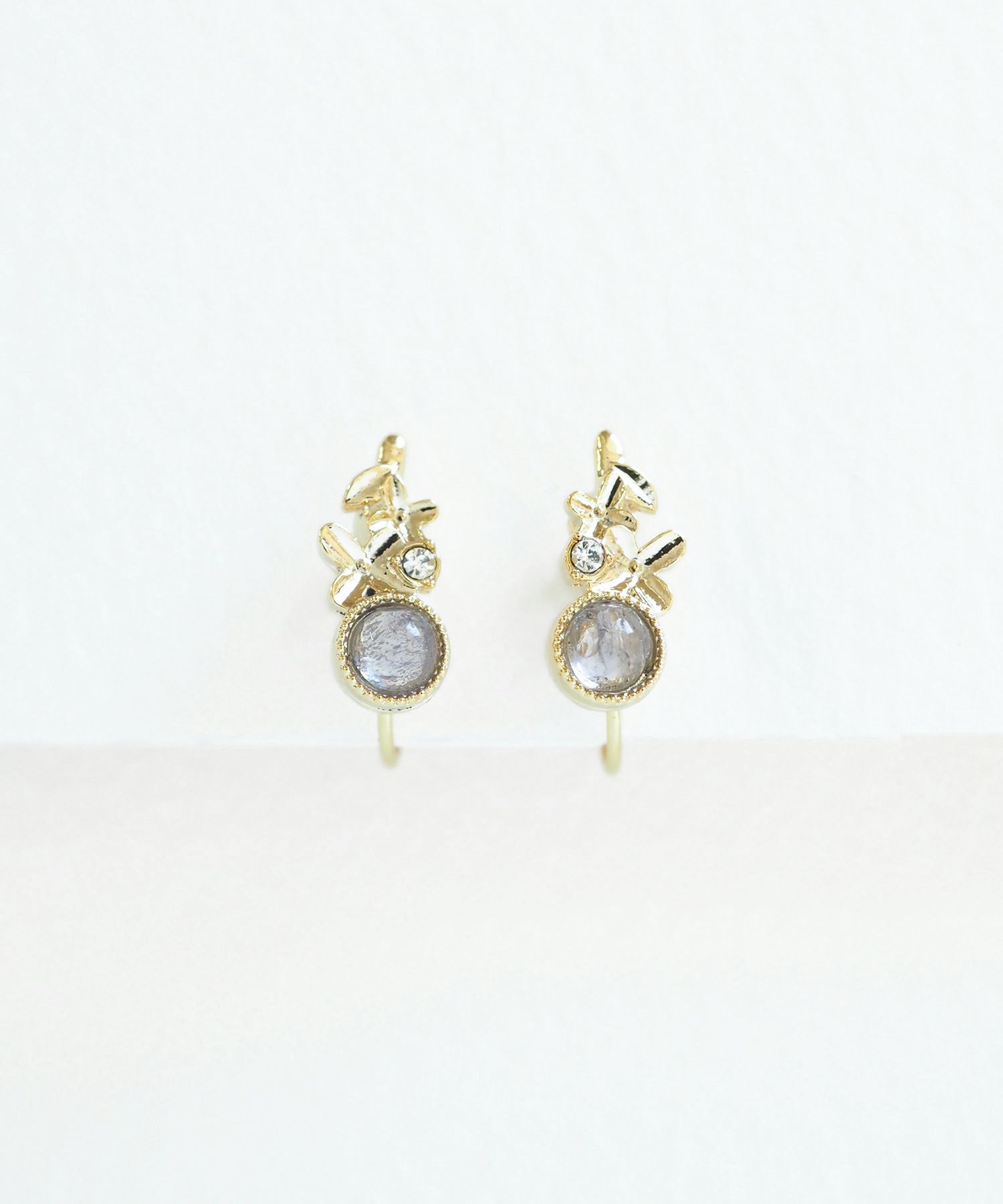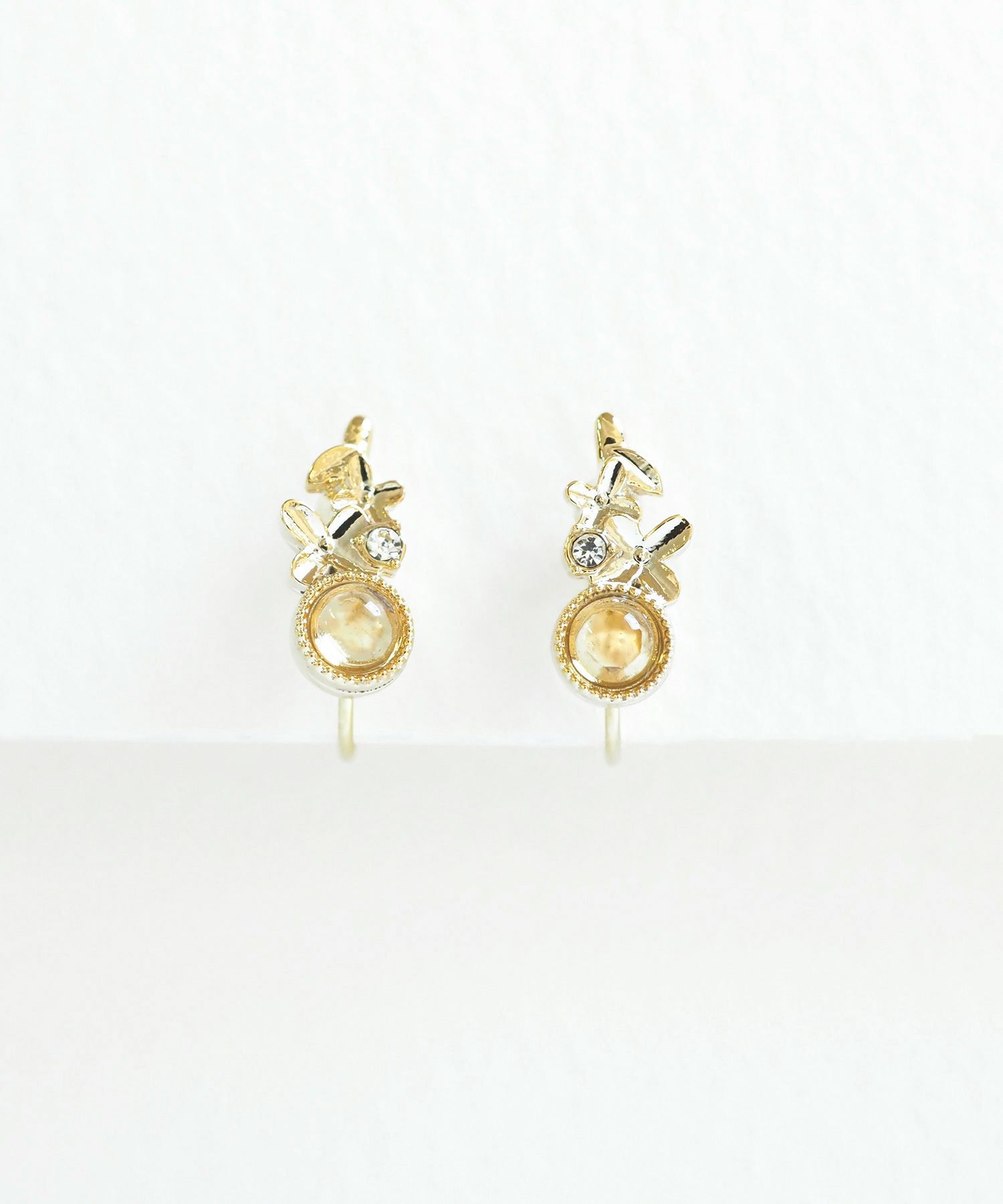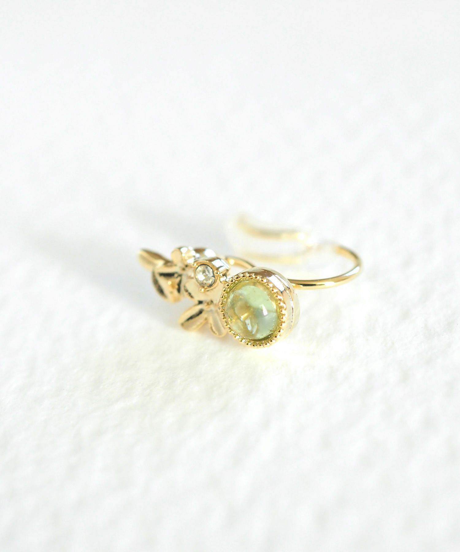 まん丸天然石にそっと舞い落ちる、儚く可憐な金木犀の花をモチーフにしたノンホールイヤリングです。 ナチュラルカラーの天然石は小ぶりなサイズで肌なじみも良く、シーンを選ばず身に着けやすいのもポイント。フェミニンな装いはもちろん、カジュアルやベーシックなスタイルにもさりげなく女性らしさをプラスしてくれるアイテムです。