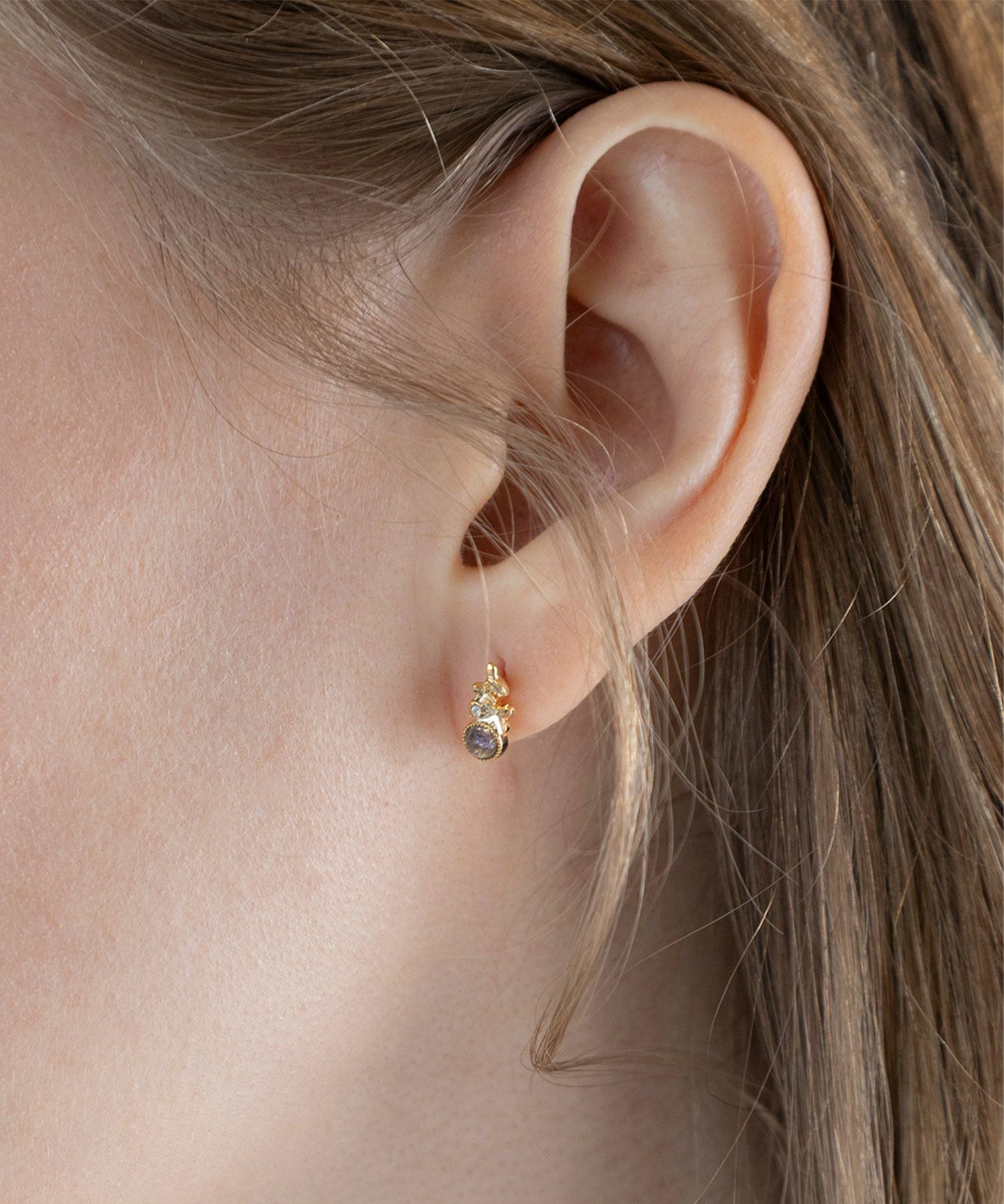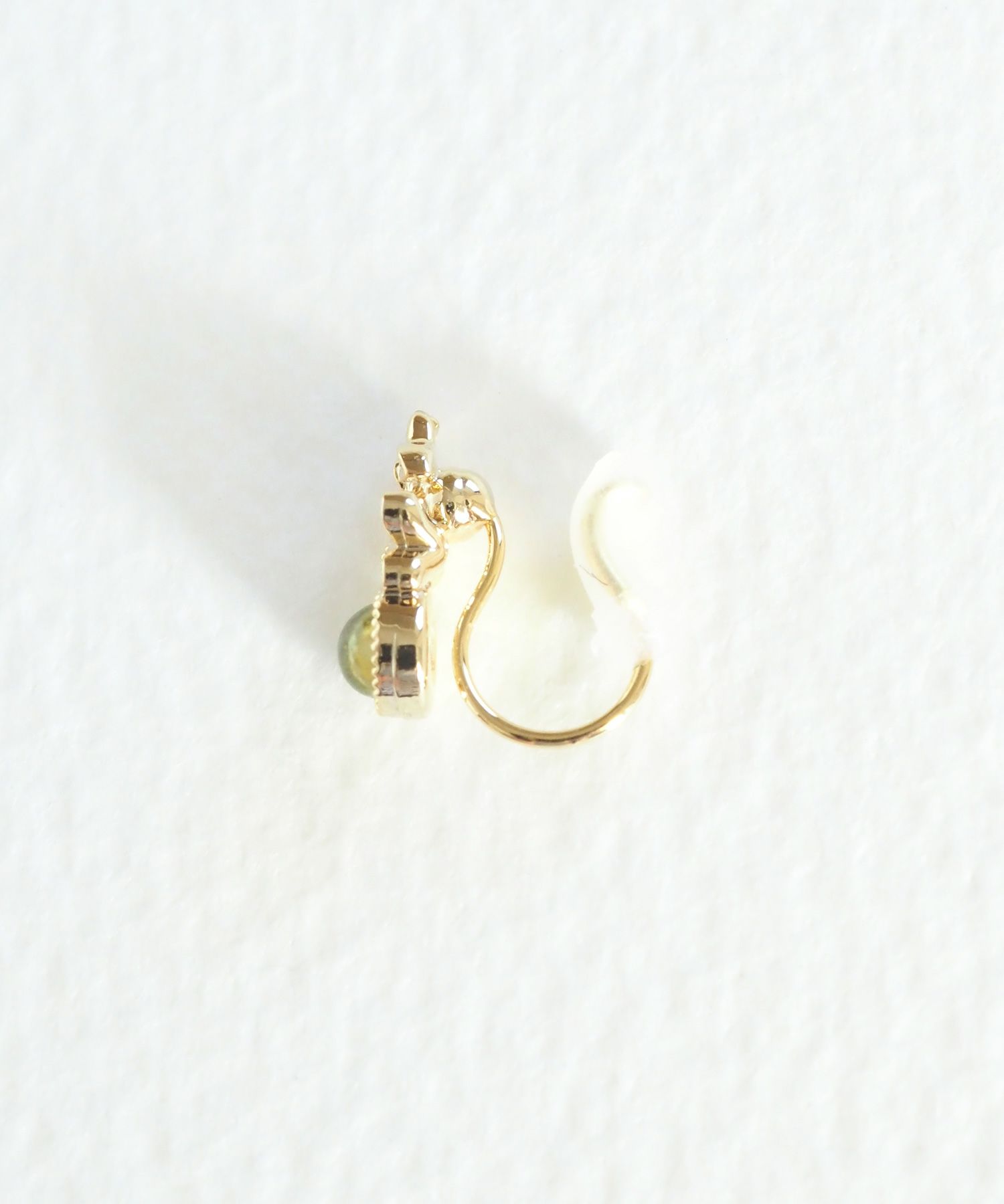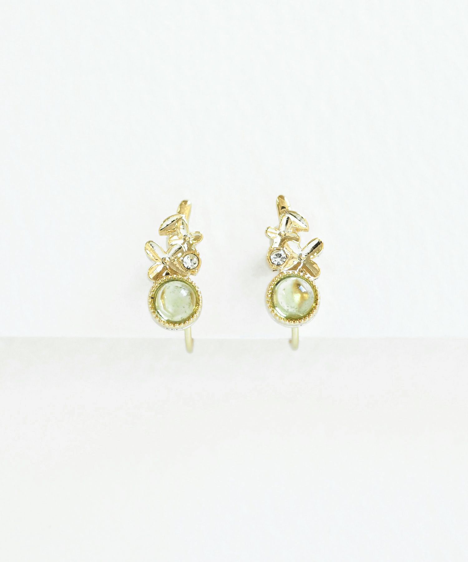 まん丸天然石にそっと舞い落ちる、儚く可憐な金木犀の花をモチーフにしたノンホールイヤリングです。 ナチュラルカラーの天然石は小ぶりなサイズで肌なじみも良く、シーンを選ばず身に着けやすいのもポイント。フェミニンな装いはもちろん、カジュアルやベーシックなスタイルにもさりげなく女性らしさをプラスしてくれるアイテムです。