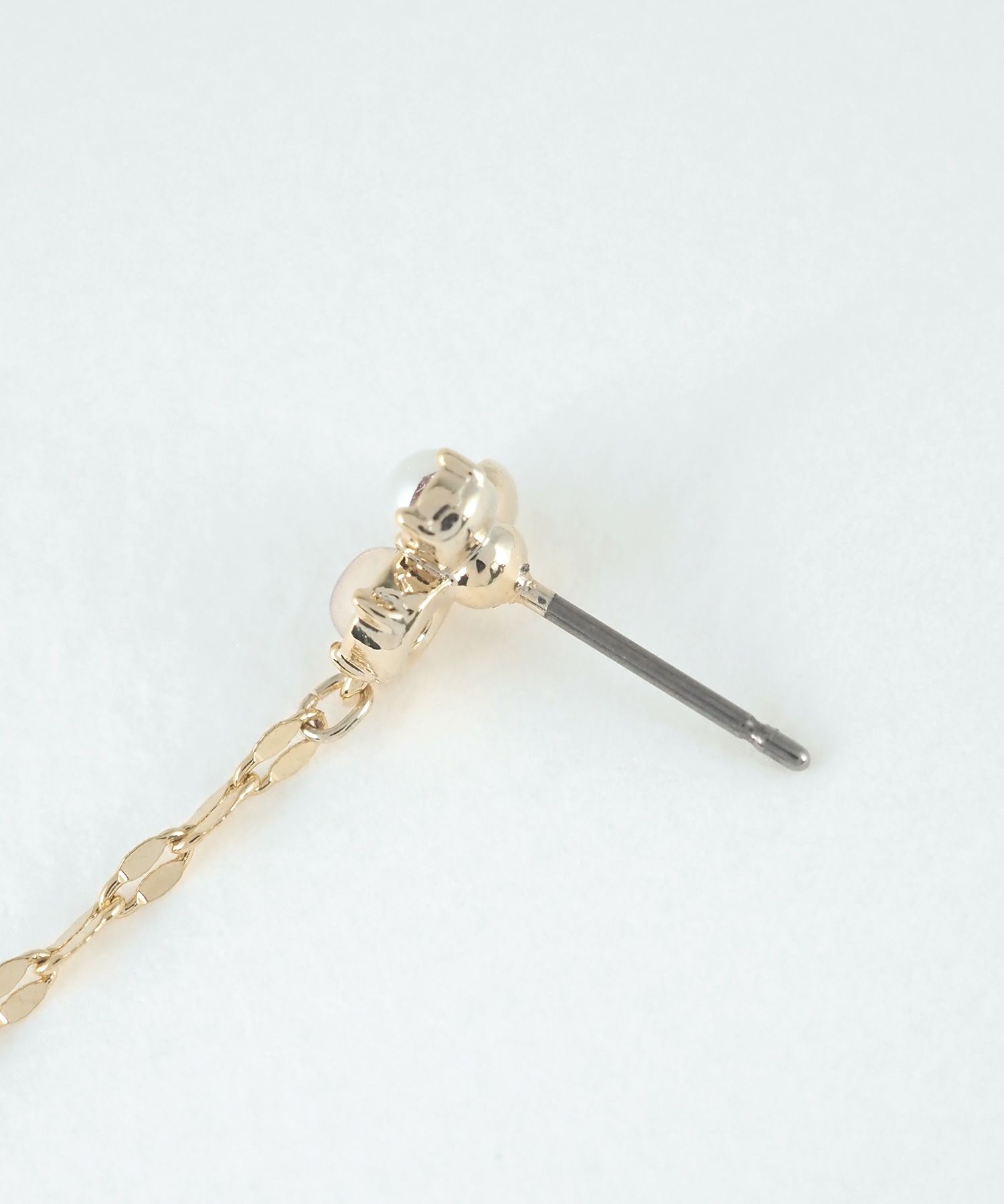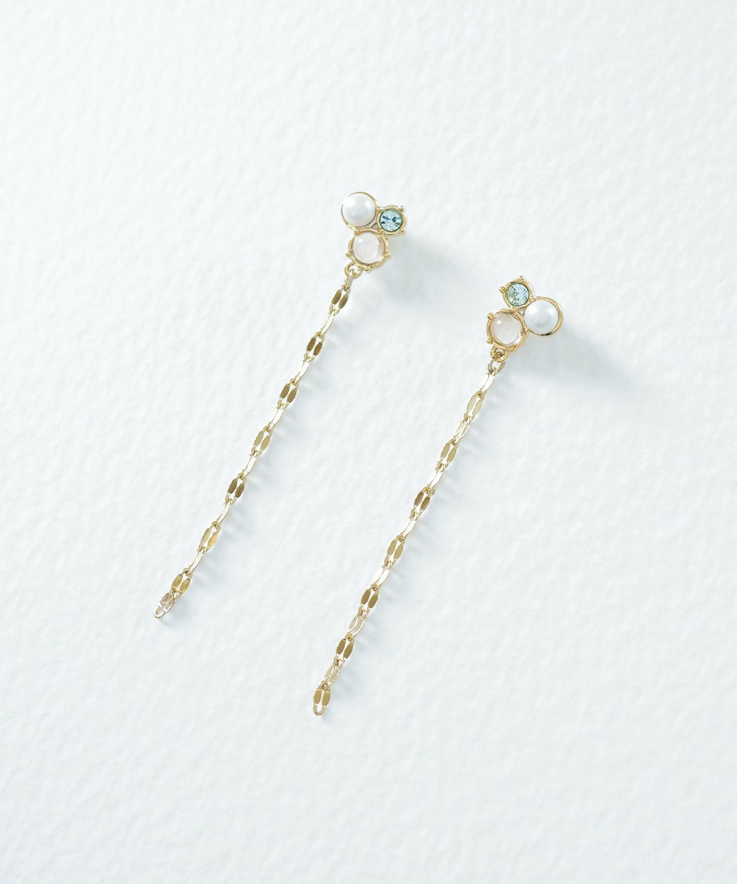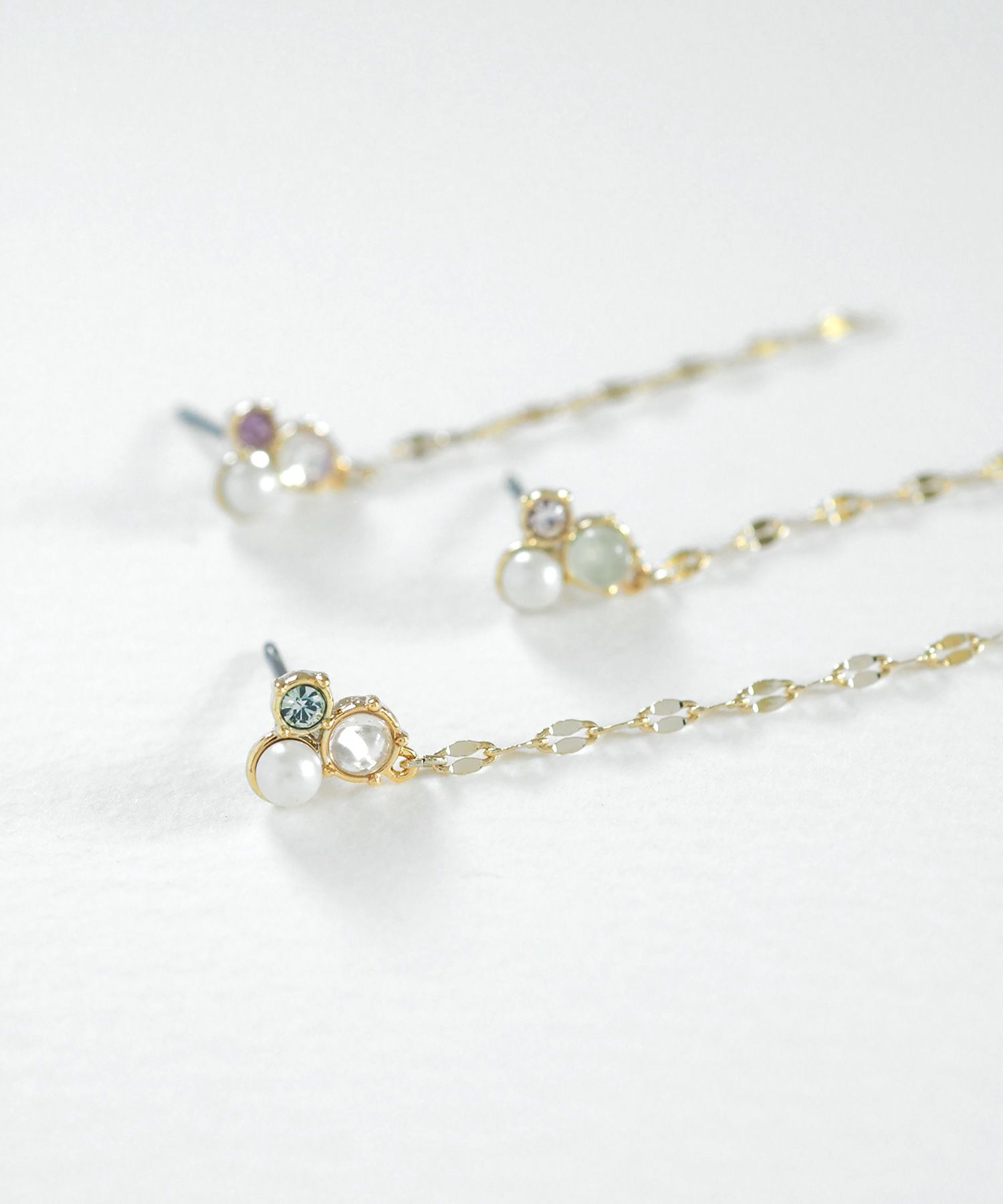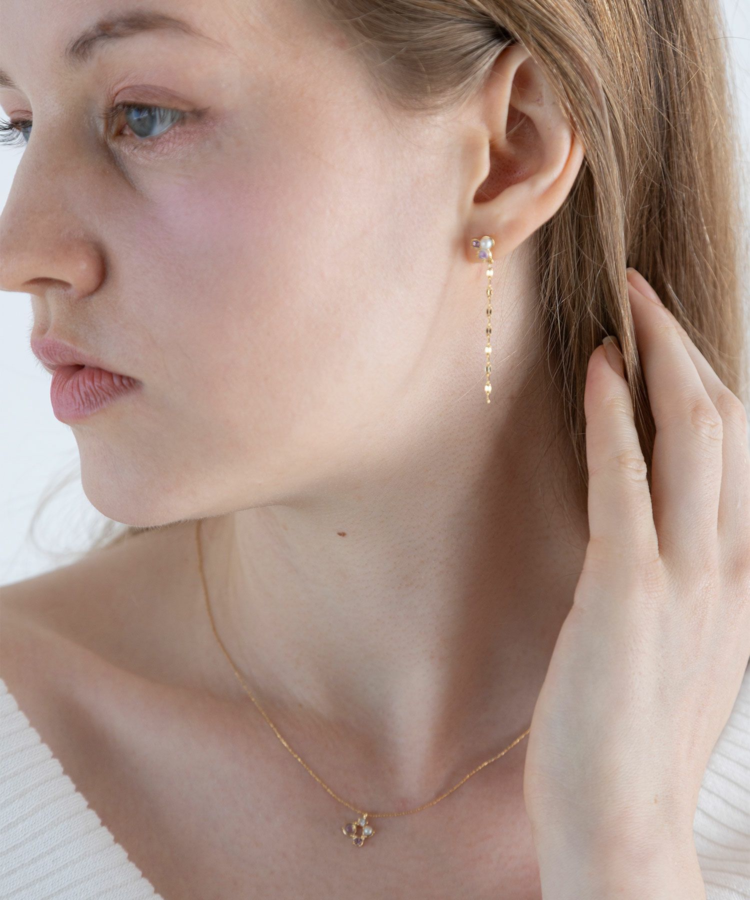 天然石の持つ運気を纏う、お守りアクセサリーシリーズ“MUK Dreamy stone”。優しい色合いの天然石、パール、ストーンがあしらわれた上品なデザインのピアス。ペタルチェーンが動きに合わせてきらめき、お顔周りを華やかに彩ります。プレゼント用にもおすすめです。