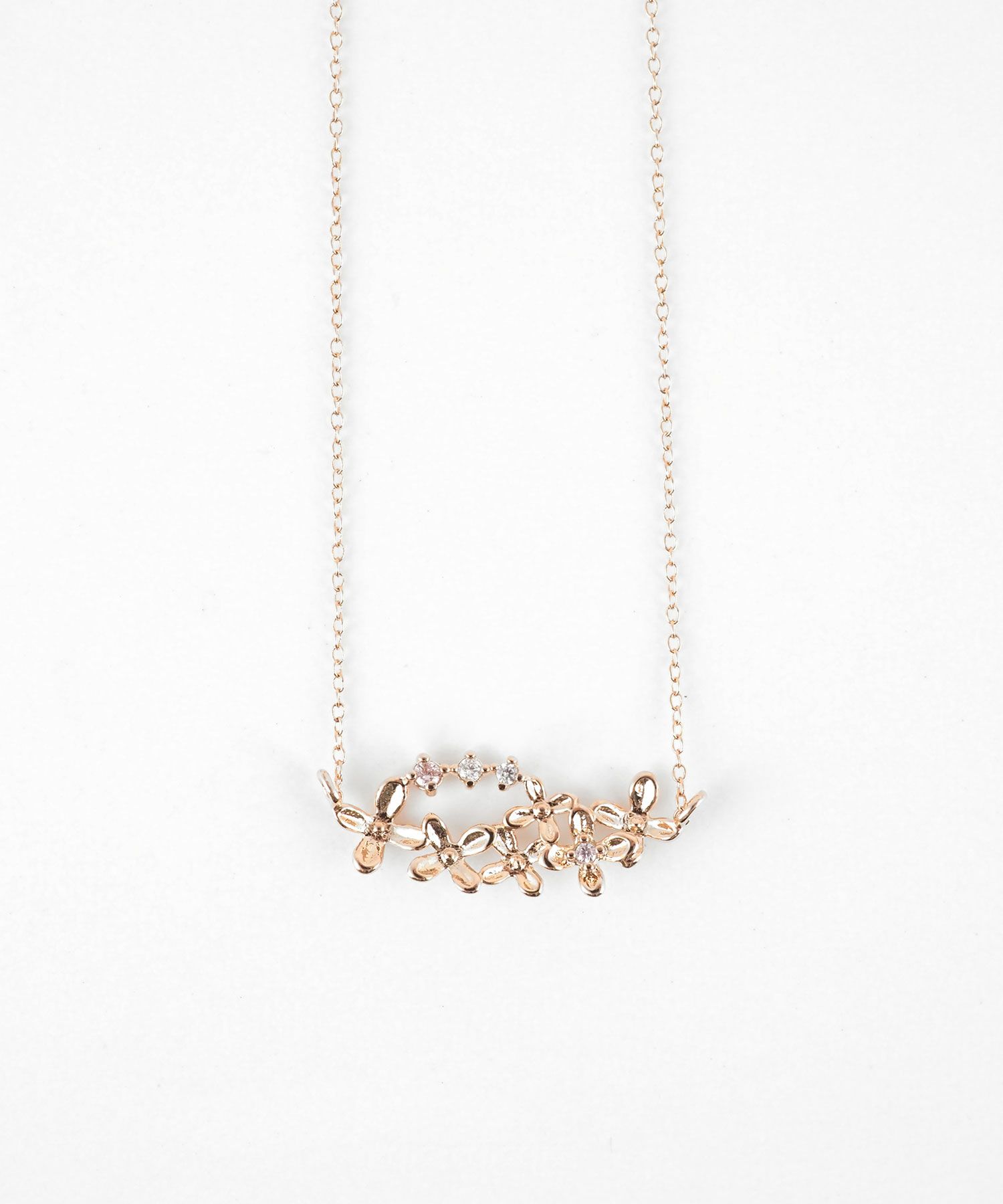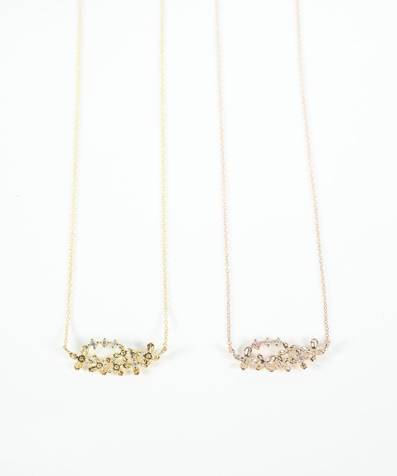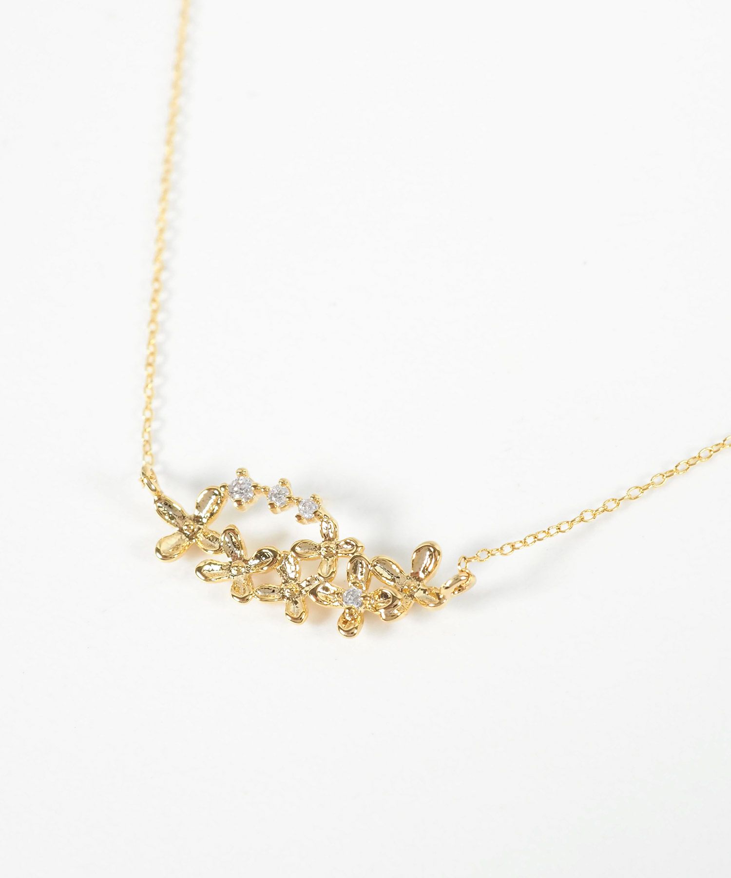 秋らしいモチーフのアクセサリーをご用意いたしました。首元に咲いた金木犀が可愛らしいネックレス。お花に添えられたキュービックジルコニアがさりげなくきらめきます。