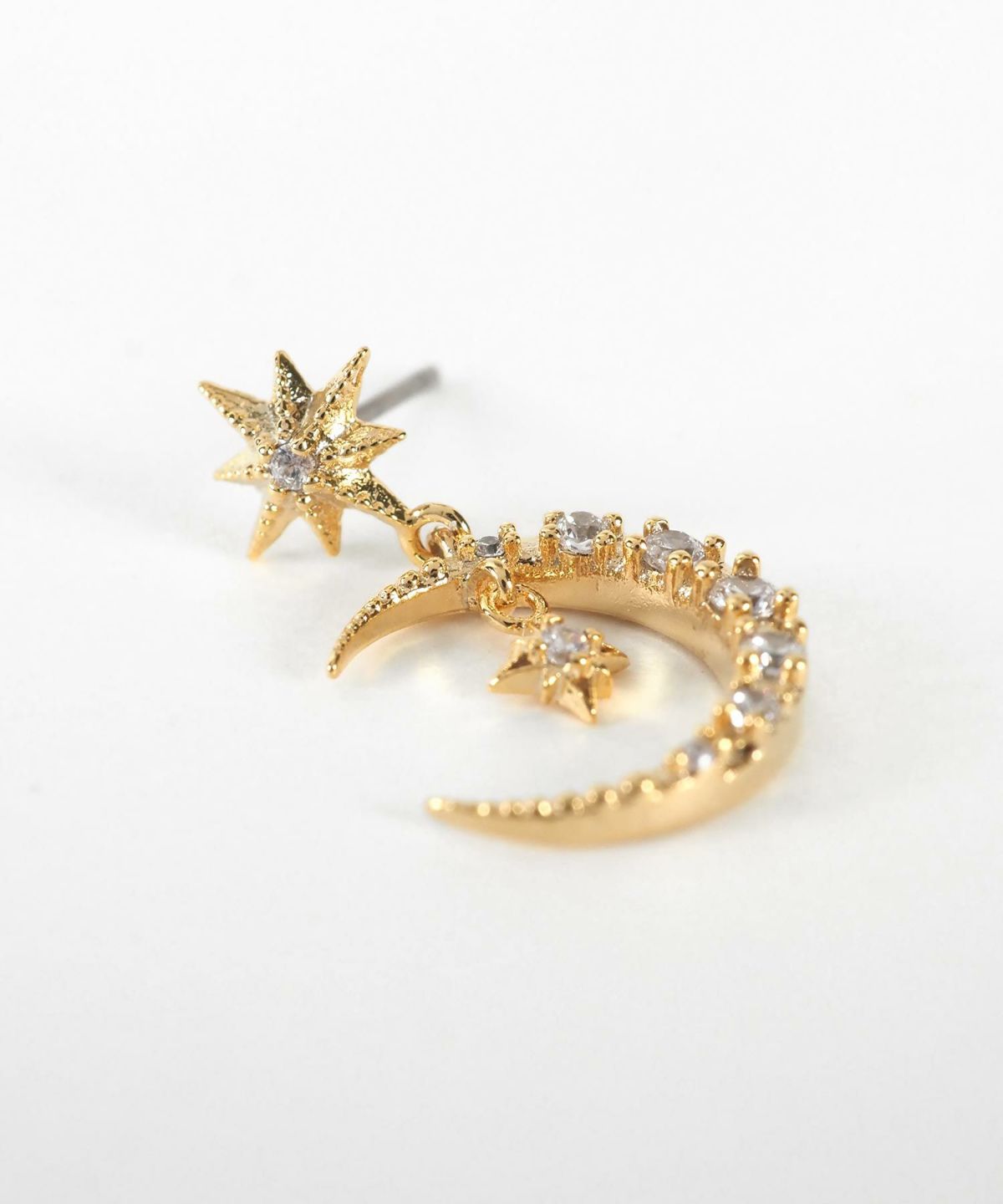 星や月をイメージしたモチーフのシリーズです。 月に添えられた星々が揺れて、華やかに煌めくピアス。揺れるモチーフが上品な印象をプラスします。ペアピアス(両耳用)です。